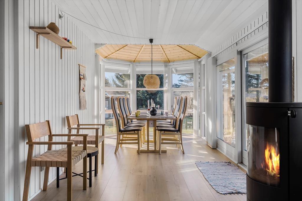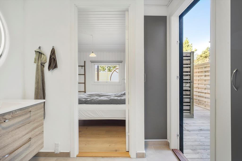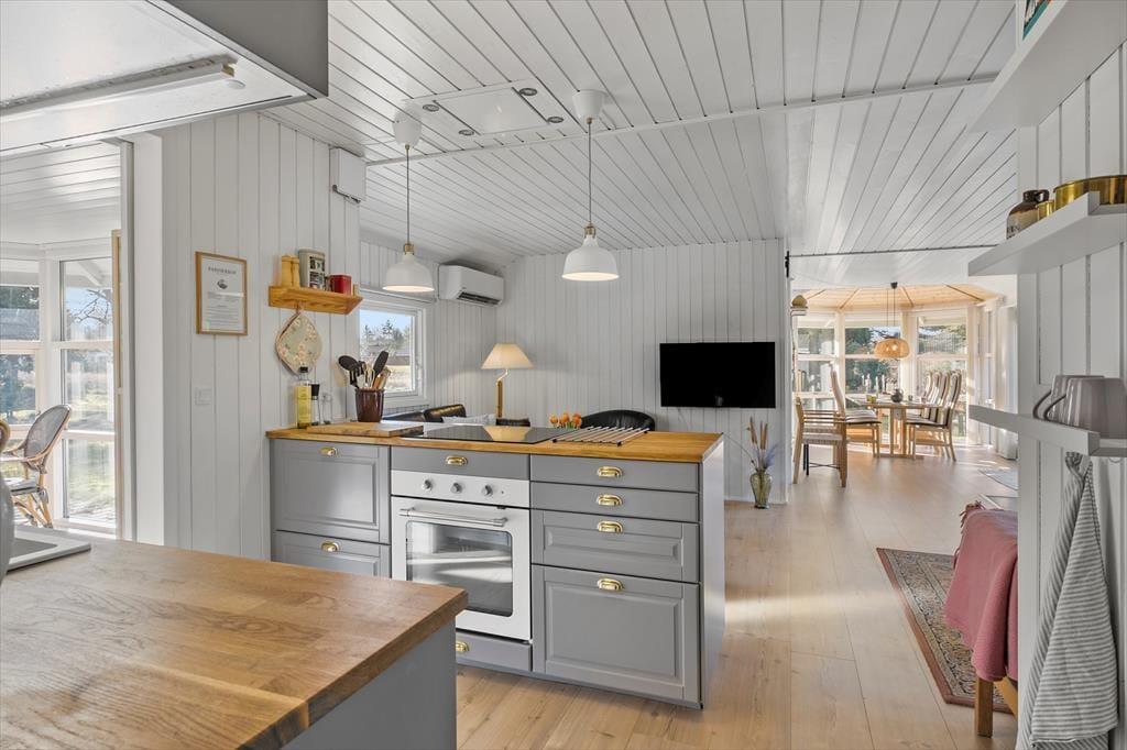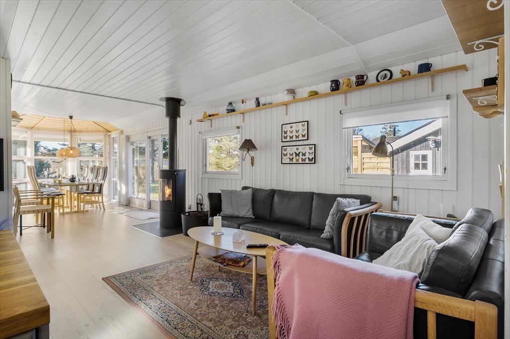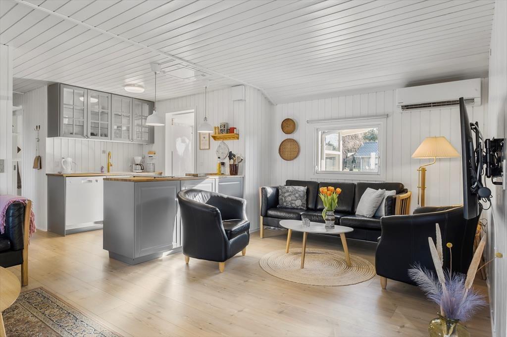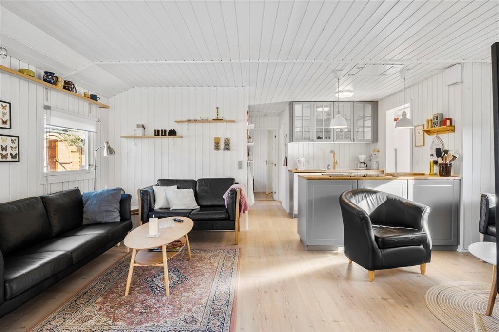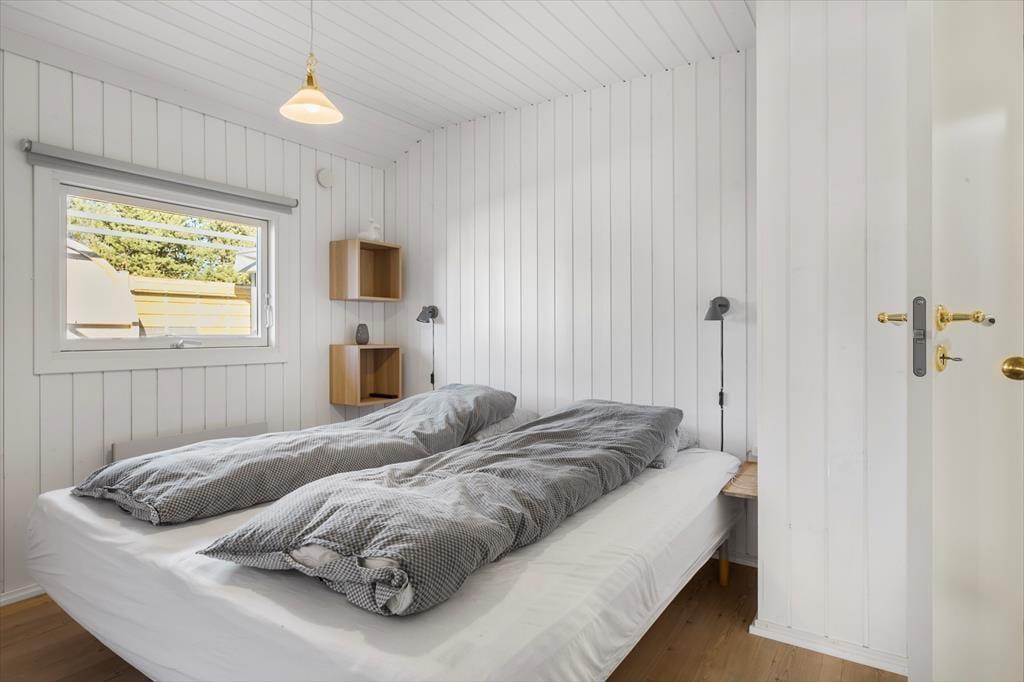 Det 80 m2 store sommerhus er renoveret i 2025, og der er man gået grundigt til værks. Alle rum har derfor en skøn fremtoning med hvidmalede trævægge, hyggeskabende nipsgenstande og flot møblement – med andre ord er det lige sådan, et sommerhus skal være. I stuen er der desuden en brændeovn og et stort fladskærms-tv med Chromecast, og i den ene ende af rummet står spisebordet ved en glaskarnap, der har udsigt til haven og et ekstra godt lysindfald. Et flot og veludstyret køkken ligger også i forbindelse med stuen, og derudover byder planløsningen på tre gode soveværelser og to lækre badeværelser. Det ene badeværelse har direkte udgang til træterrassen, hvor du også finder udebruseren, hvis du har brug for det kolde gys til at starte dagen på. I forbindelse med terrassen ligger annekset hvor du finder de sidste sovefaciliteter. Det er perfekt, hvis familiens teenagere eller jeres besøgende venner fortjener lidt ekstra privatliv.