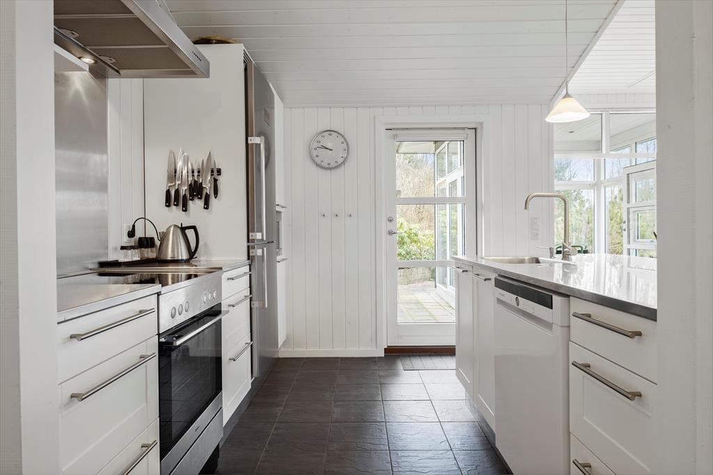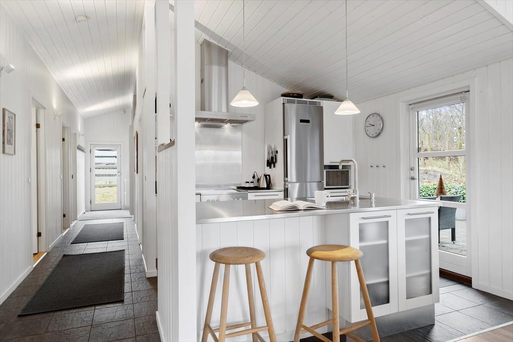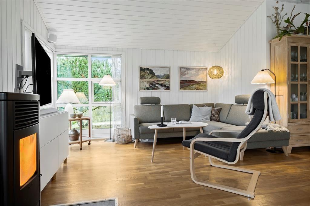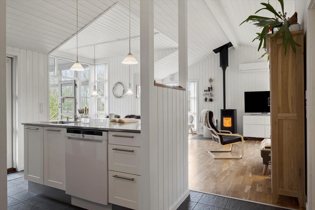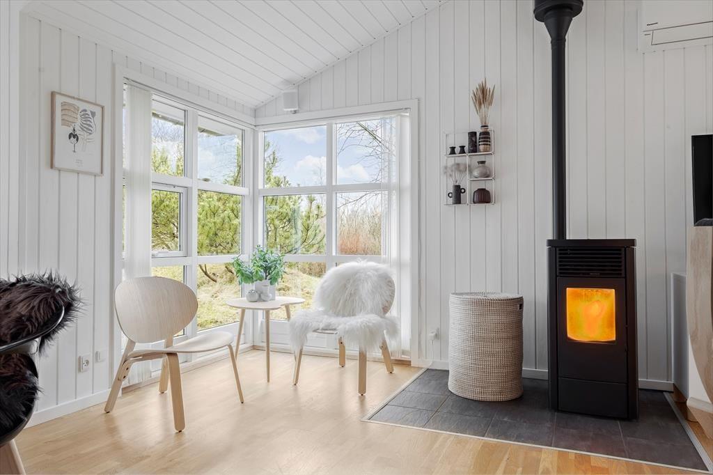 Måske er haven vild og vilter, men der er styr på tingene inden døre. Her venter der dig nemlig en lys og velindrettet feriebolig med pænt møblement og lækre detaljer – inklusiv en brændeovn i stuen såvel som spabad og sauna på det største af de to badeværelser. De fire soveværelser indbyder til både middagslure og en god nattesøvn, men når du vil hygge dig med dine kære, er det sikkert i stuen, at I vil samles for at spille spil, se film sammen eller bare dase side om side. I det flotte køkken kan I sagtens stå flere, hvis madlavningen skal være et fælles projekt, og når det er tid til at dække bord, kan I lige overveje, om måltidet skal indtages ved spisebordet eller ude i den dejlige, lysfyldte udestue.