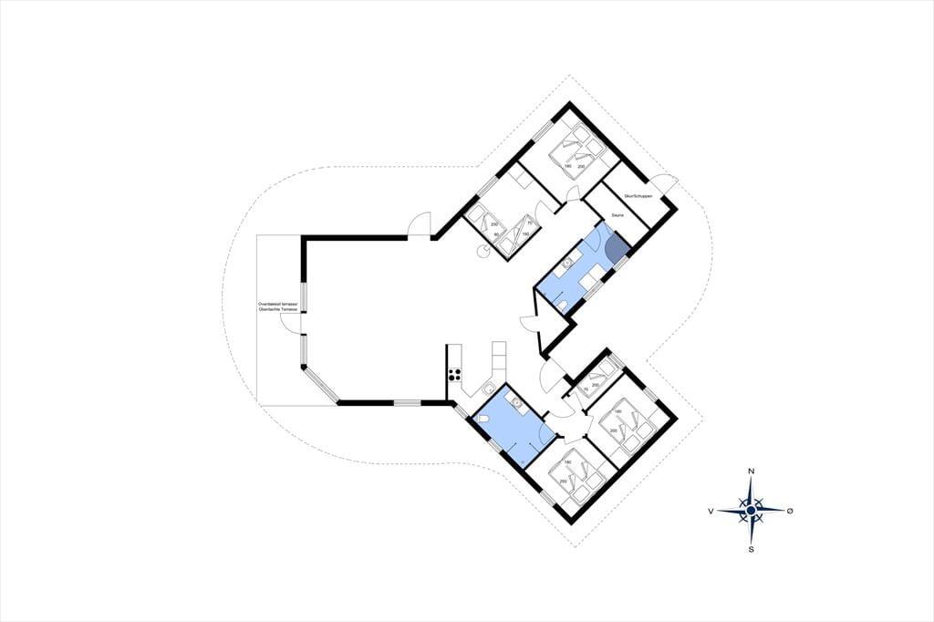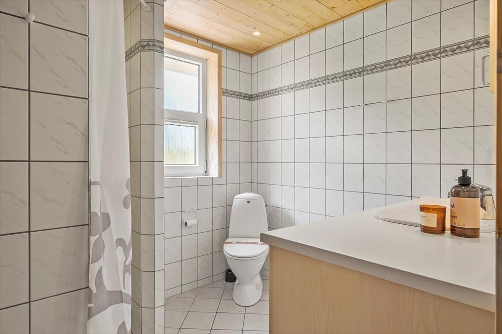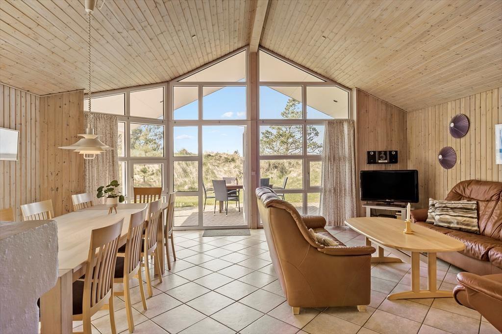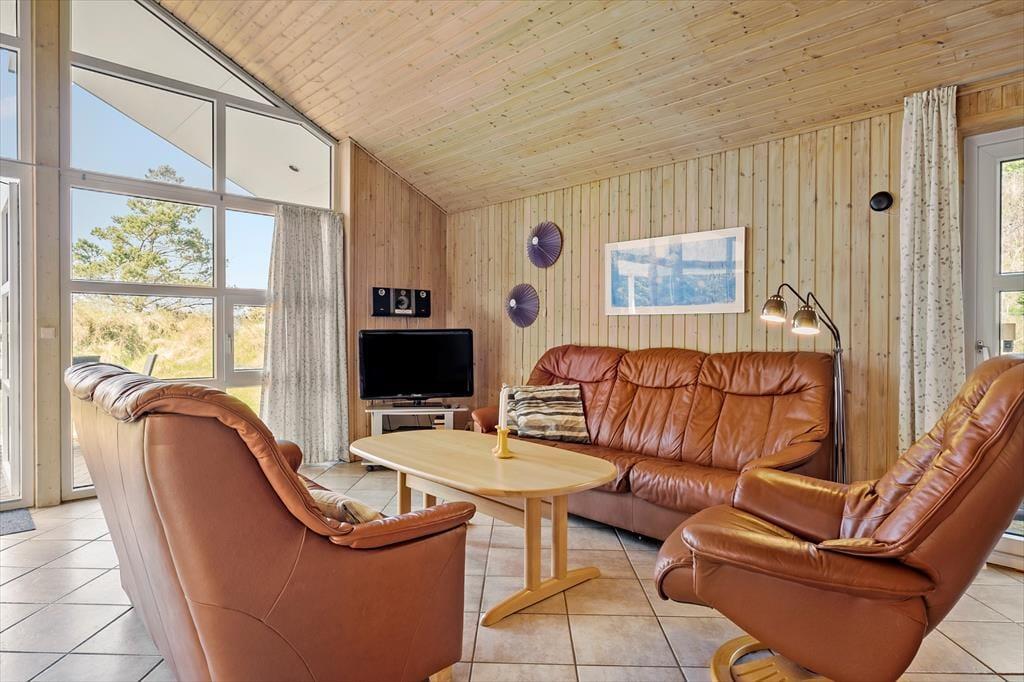 Ved sommerhuset ligger hele fire terrasser, så man er sikker på til enhver tid at kunne finde en solplet i læ for Vestenvinden. Ud for stuen er terrassen overdækket og her kan man sidde tørt og lunt og nyde de lange sommeraftener. Fra den store grund, som er fyldt med små klitter og marehalm, kan man kigge til Vesterhavet i det fjerne.