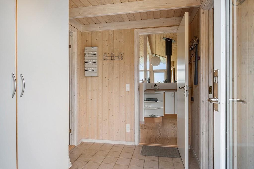 Indenfor mødes du af et lyst og venligt opholdsrum, hvor de mange vinduer trækker naturen helt ind i stuen og giver en skøn udsigt til plantagens grønne omgivelser. Stuen er indrettet med både brændeovn og varmepumpe, så her er hyggeligt og behageligt – uanset årstid. Køkken og opholdsrum ligger i åben forbindelse, hvilket skaber gode rammer for samvær og afslapning efter en dag fuld af oplevelser. Sommerhuset rummer desuden to badeværelser, hvoraf det ene er udstyret med både vaskemaskine og tørretumbler – praktisk og komfortabelt på ferien.