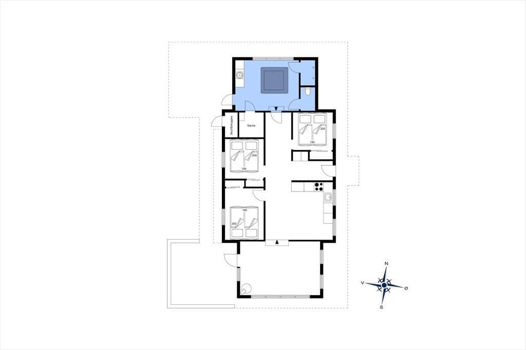 I den bagerste del af sommerhuset finder man det skønne spa-rum med en stor standvandsspa med plads til 5 personer. Da det store bassin står inde, kan man bruge det året rundt; tænk at sidde her efter en lang dag ved stranden eller i skoven og nyde udsigten til den smukke natur lige udenfor døren. Brusere og sauna er en del af rummet, og man har desuden adgang til den del af terrassen.