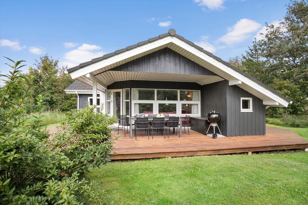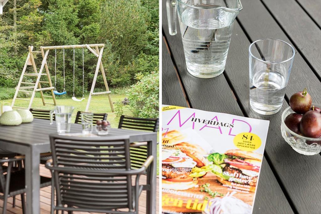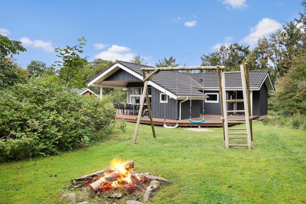 Rundt om sommerhuset er flere dejlige terrasser, bl.a. en overdækket del på sydsiden, hvor man kan lave mad på Weber-grillen og udnytte de lune og ekstra lange sommeraftener. Børnene har masser af plads til at lege og spille bold på den store naturgrund; helt ideelle udendørsfaciliteter.