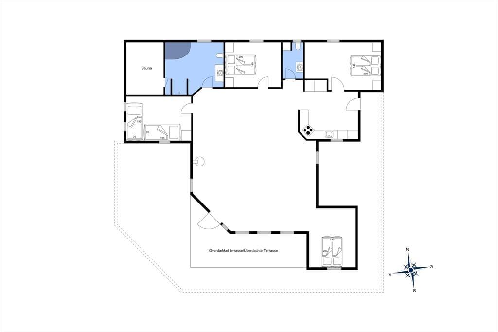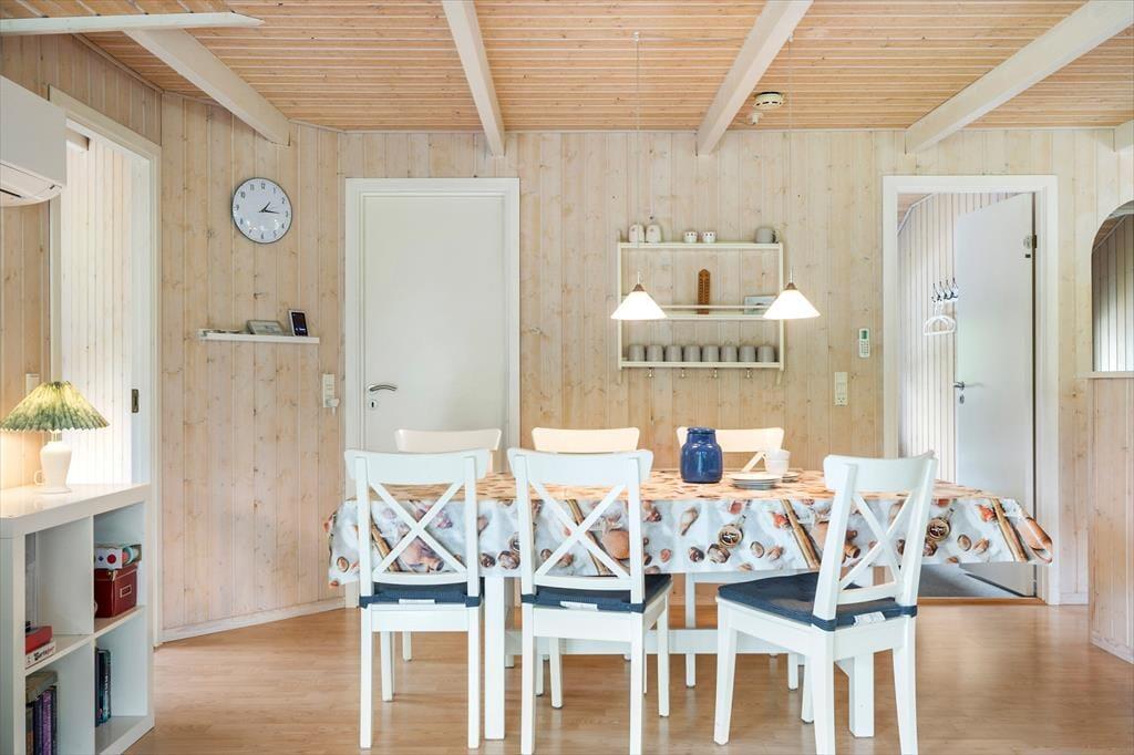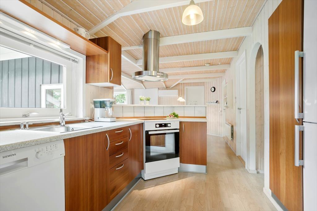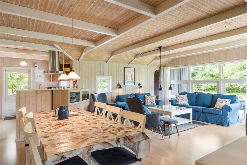 Sommerhuset er både flot og praktisk indrettet og her er plads til en stor familie. Man kommer ind gennem det veludstyrede køkken, som ligger i åben forbindelse med det store opholdsrum. Her kan hele familien samles til madlavning, hyggelige måltider og afslapning foran tv’et med ild i den flotte brændeovn. Rummet har et skønt lysindfald fra de store vinduer, og i det ene hjørne kan børnene lege hule eller tage en middagslur i den indbyggede alkove. Derudover råder sommerhuset over tre soveværelser, et gæstetoilet med vaskemaskine, og et stort og lækkert badeværelse, hvor man kan koble helt af i spabadet eller saunaen. Sommerhuset har installeret et gratis og trådløst internet, så medbring gerne pc eller tablet hjemmefra, så det er nemt at finde oplysninger om områdets mange muligheder.