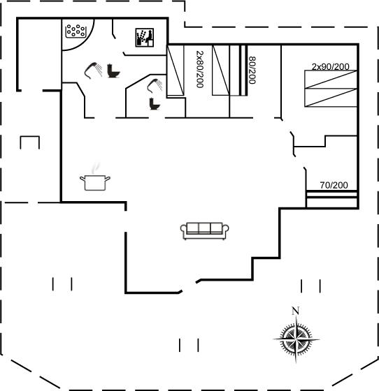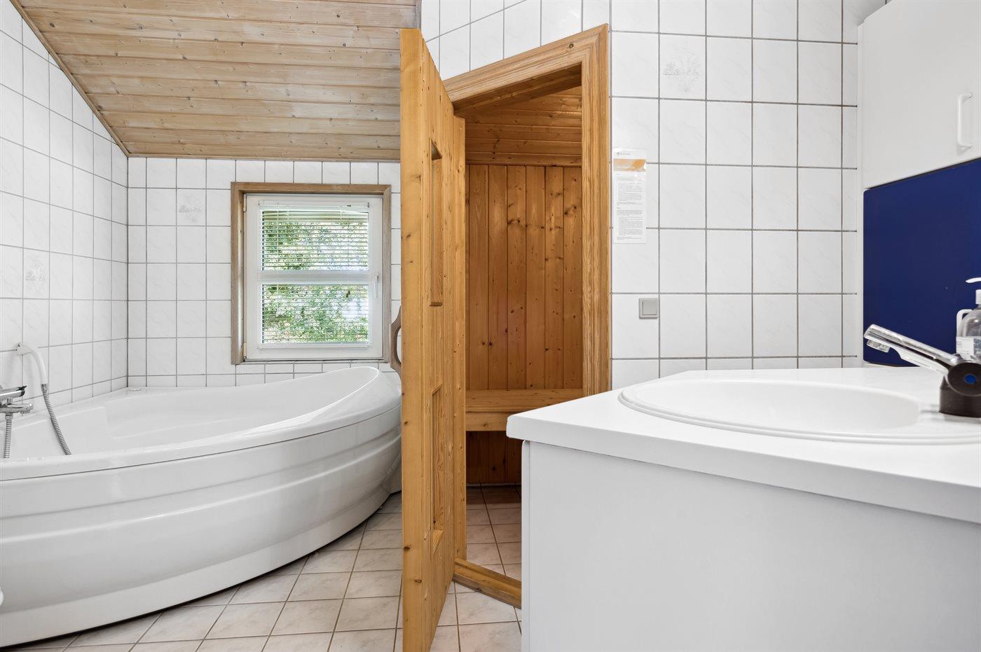 Der er 2 badeværelser med bruseniche og 2 toiletter. Der er gulvvarme på 1 badeværelse. I saunaen er der mulighed for afslapning.