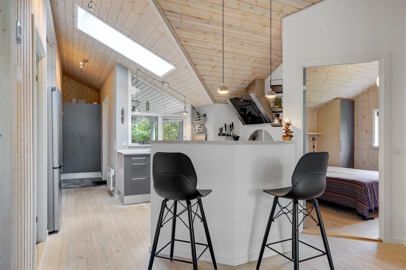 Køkkenet er udstyret med 1 køleskab. Der er 4 induktionskogeplader, varmluftovn, mikrobølgeovn samt opvaskemaskine.