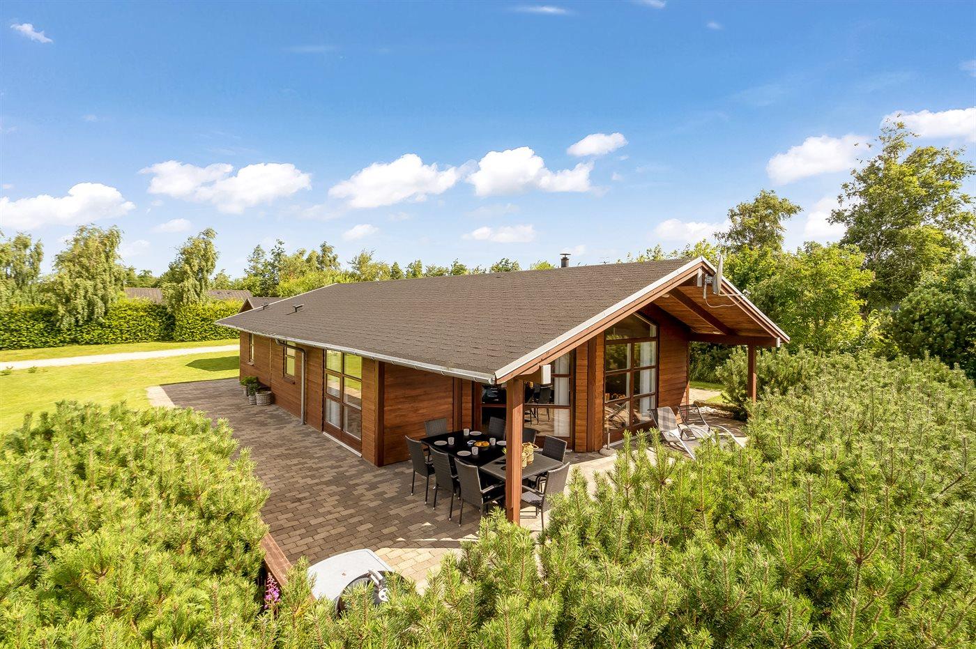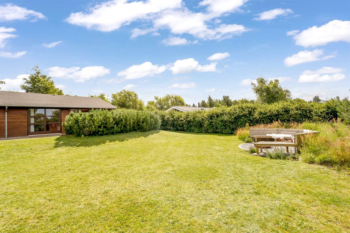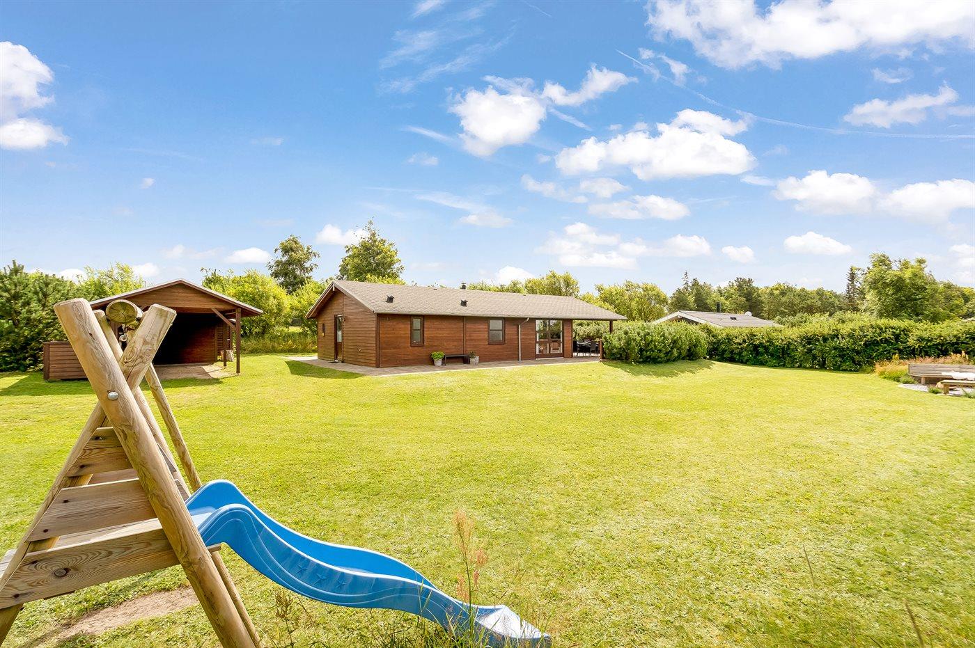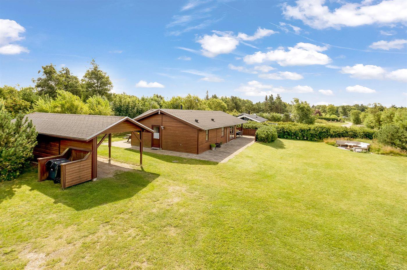 Ferieboligen er beliggende på en 1153 m² stor naturgrund. Der er 3500 m til havet. Nærmeste forretning er beliggende i en afstand af 1200 m. Der er en golfbane i en afstand af 3000 m. Til ferieboligen hører åbent terrasseareal. Desuden er der overdækket terrasse. Der er redskabsrum. Gynge. Rutchebane. Bålsted. Grill til rådighed. Der er carport til rådighed. Parkering ved ferieboligen.