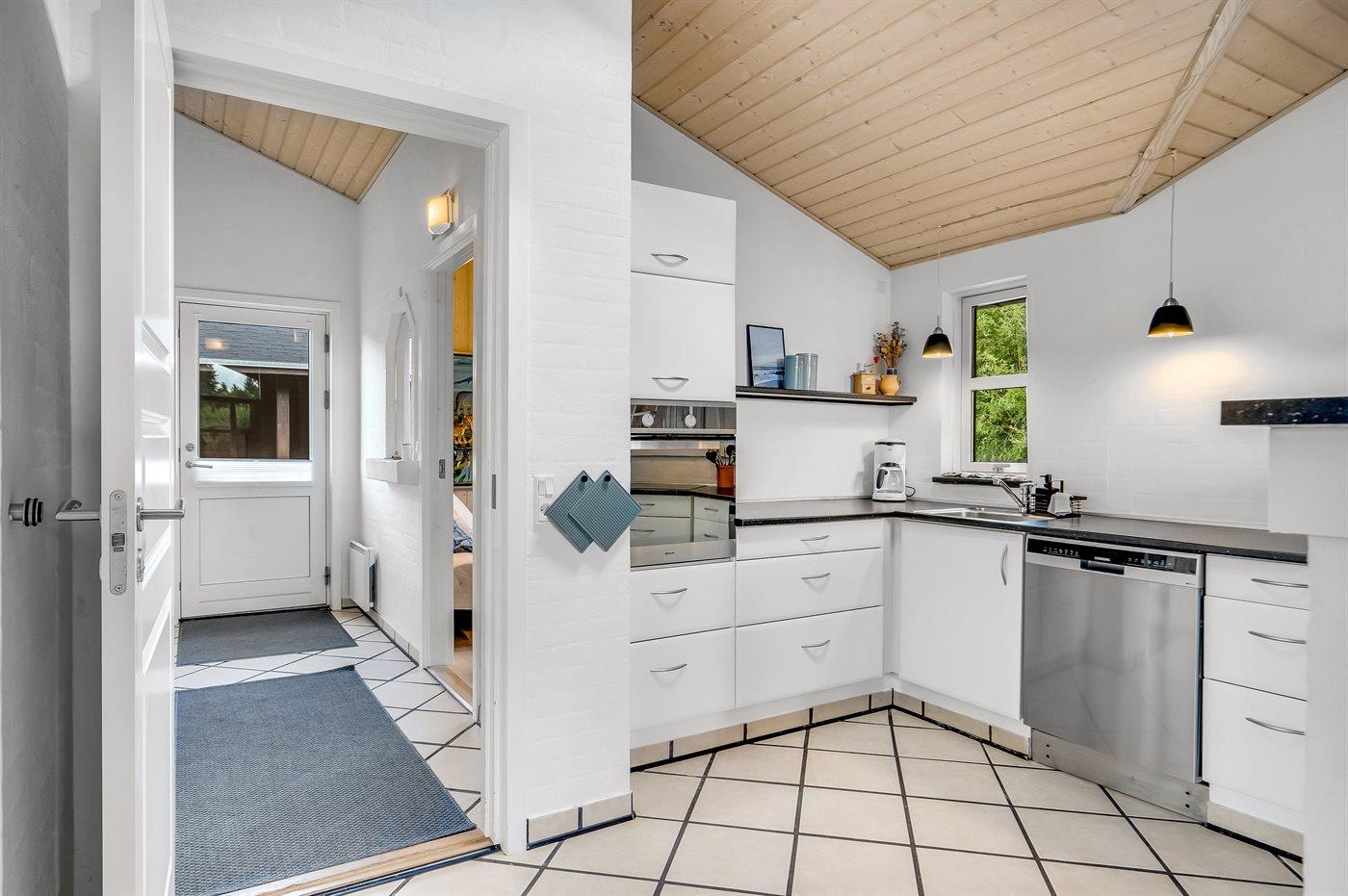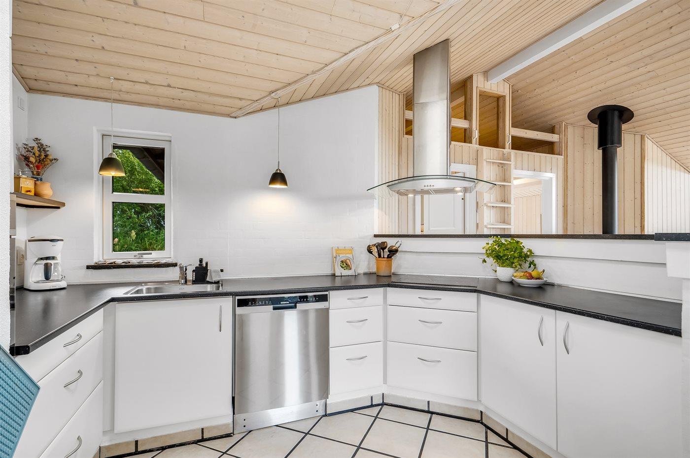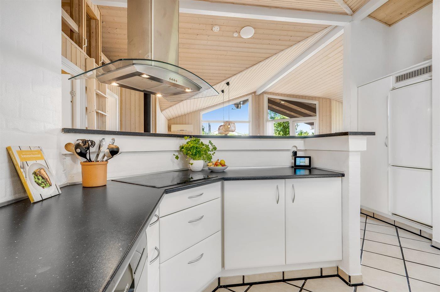Køkkenet er udstyret med 1 køleskab. Der er 4 keramiske kogeplader, varmluftovn, mikrobølgeovn samt opvaskemaskine.