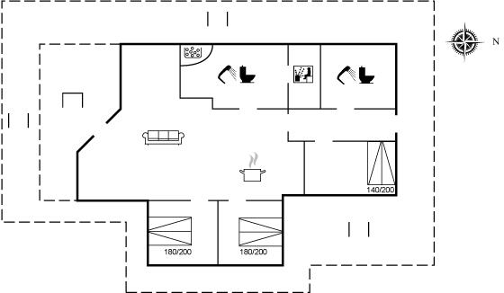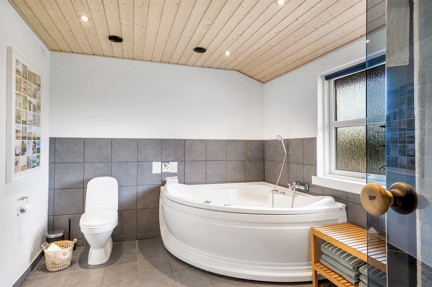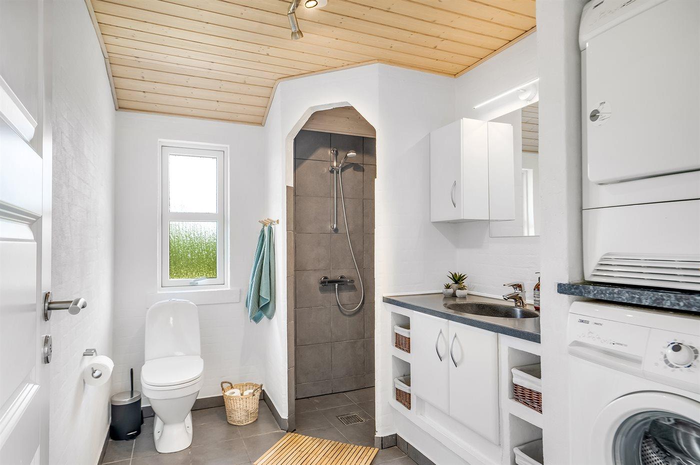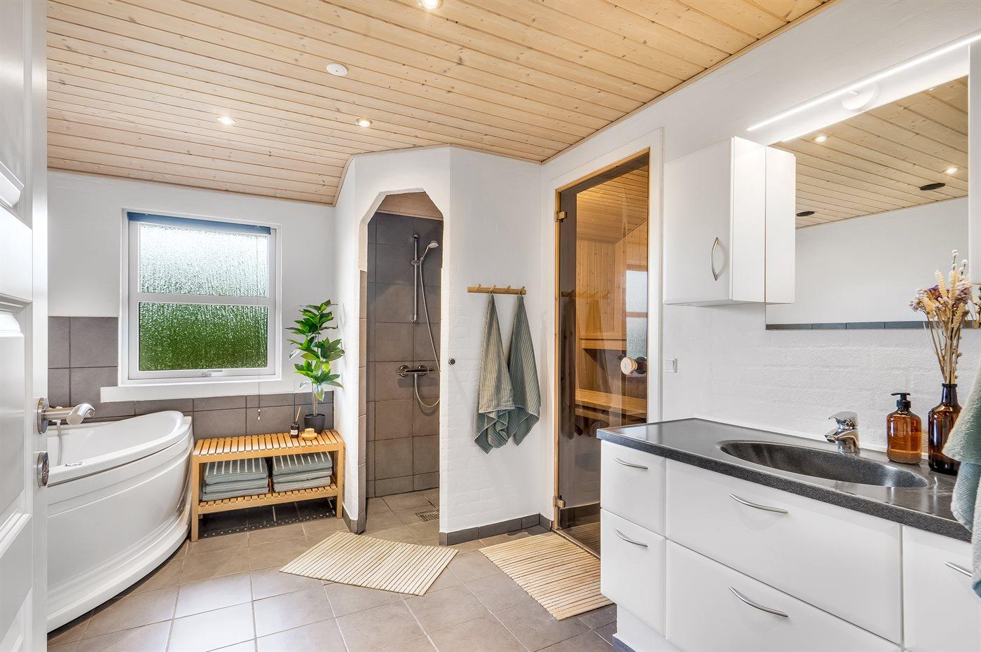 Der er 2 badeværelser med bruseniche og 2 toiletter I saunaen er der mulighed for afslapning.