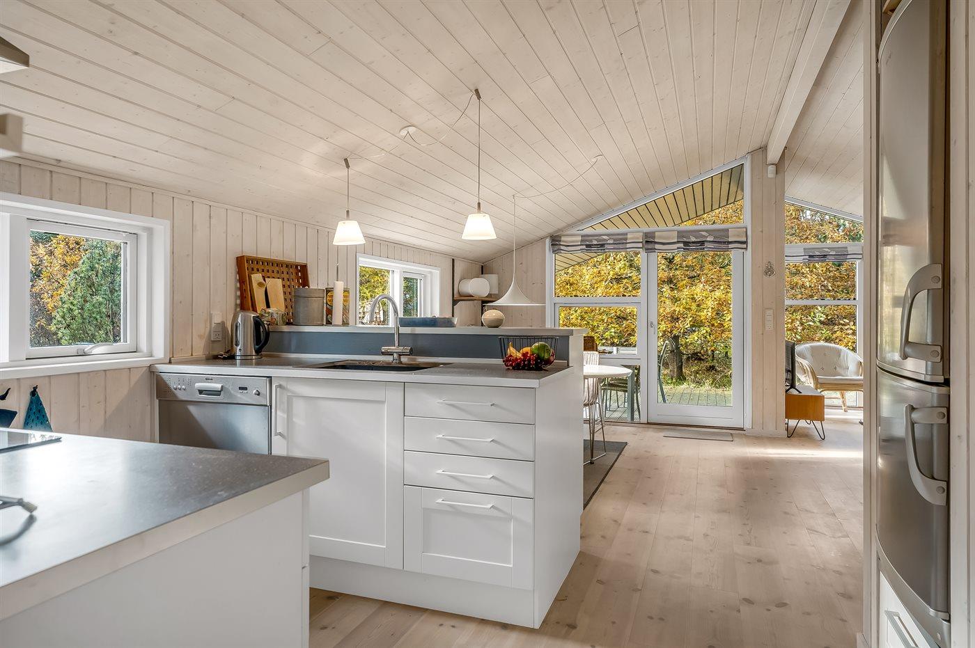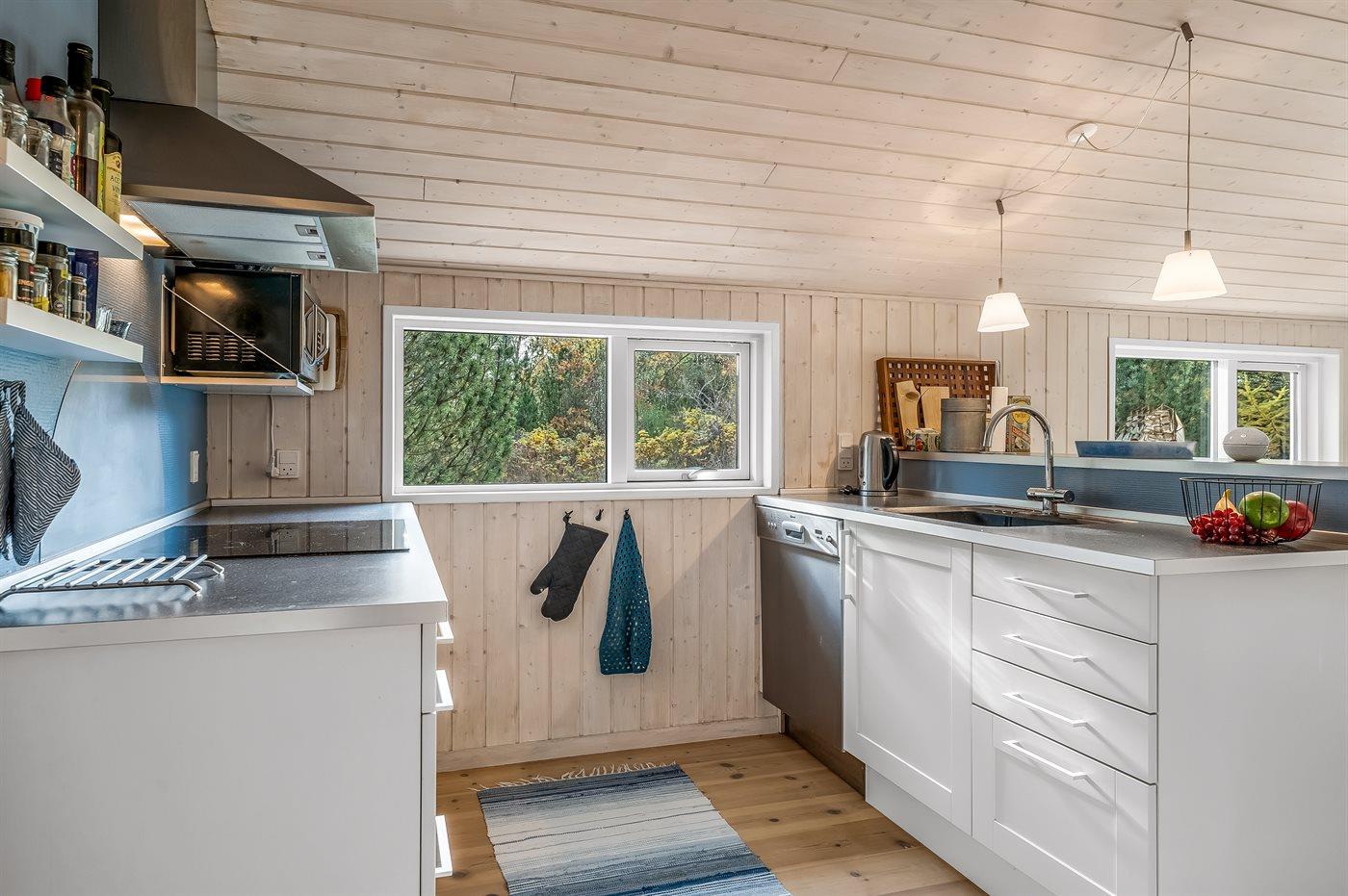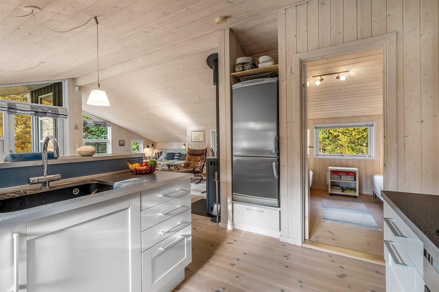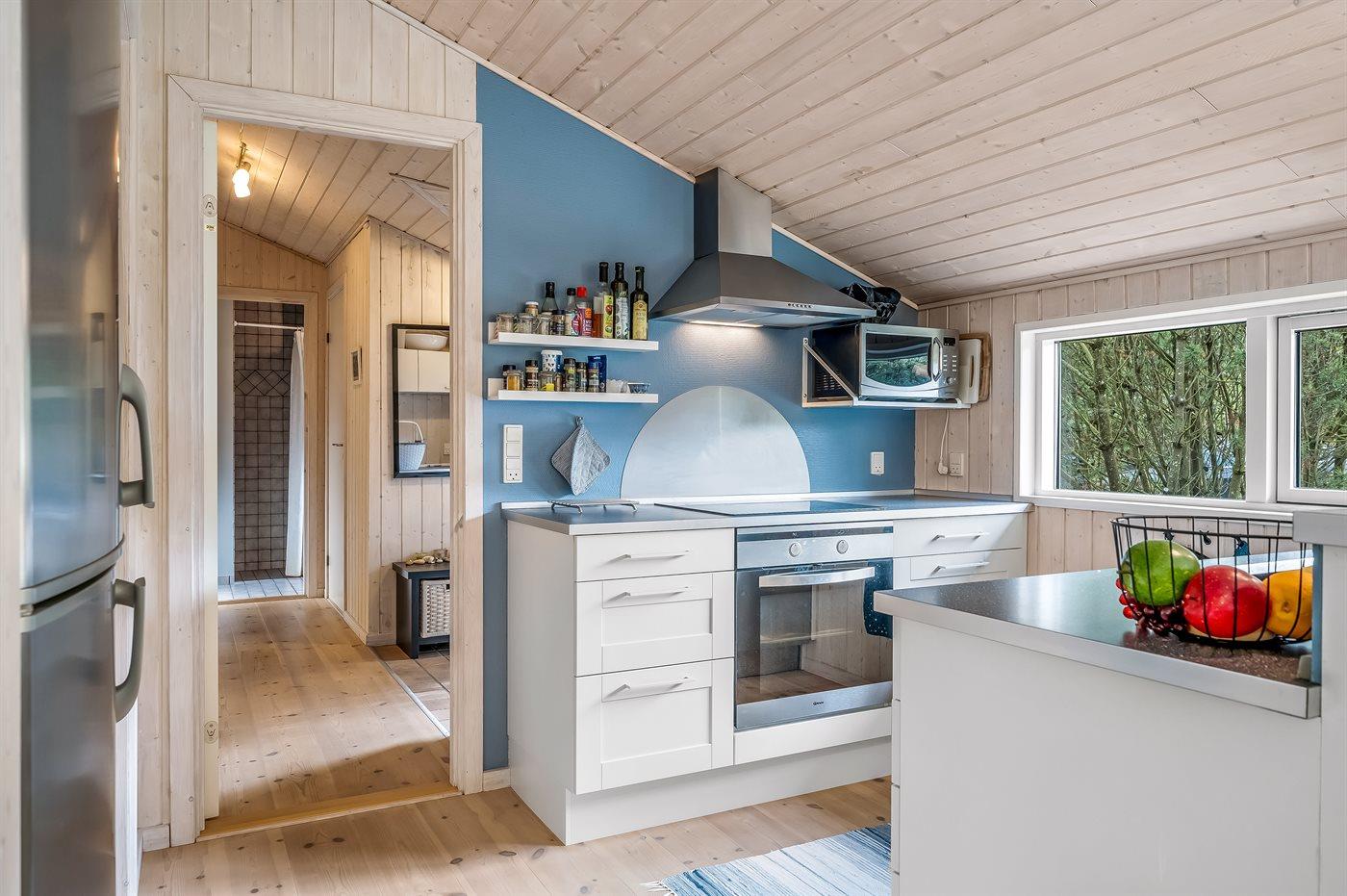 Køkkenet er udstyret med 1 køleskab. Der er 4 induktionskogeplader, varmluftovn, mikrobølgeovn samt opvaskemaskine.