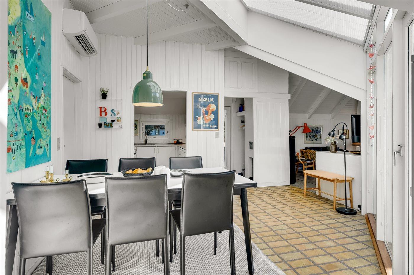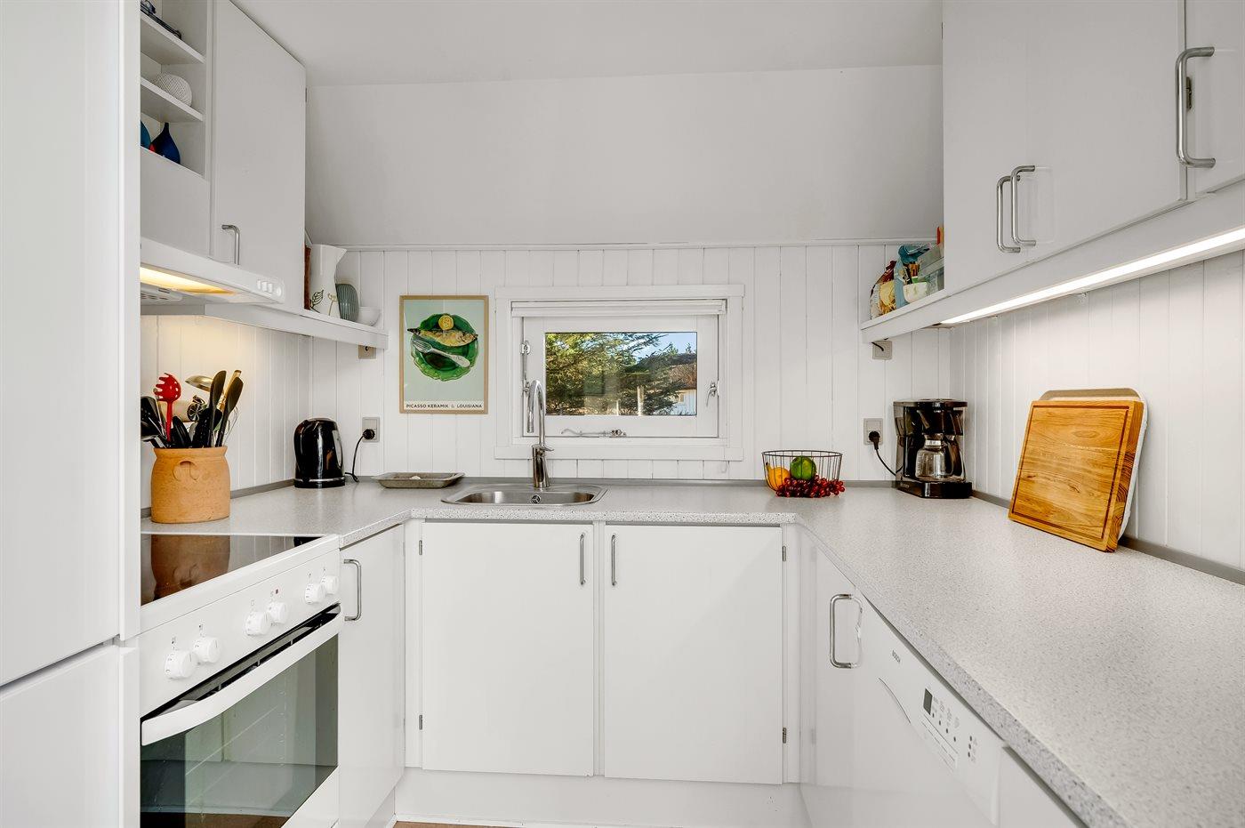 Køkkenet er udstyret med 1 køleskab. Der er 4 keramiske kogeplader, varmluftovn, mikrobølgeovn samt opvaskemaskine.