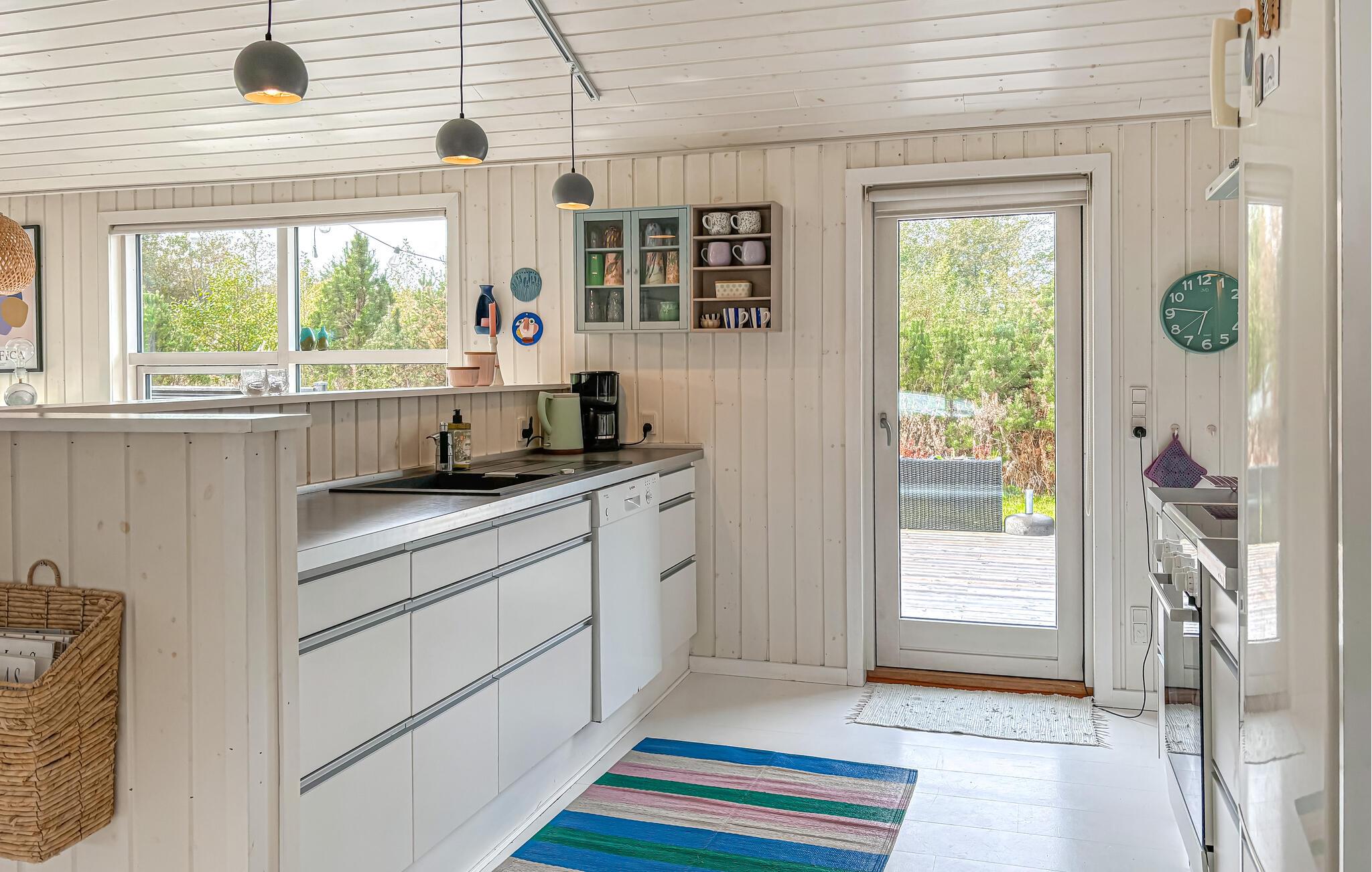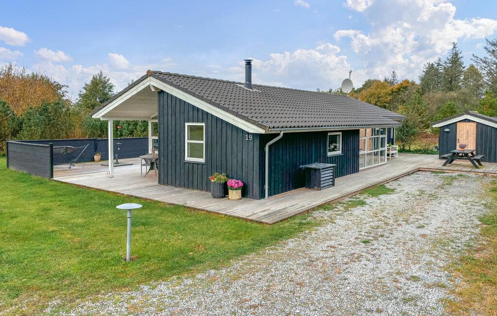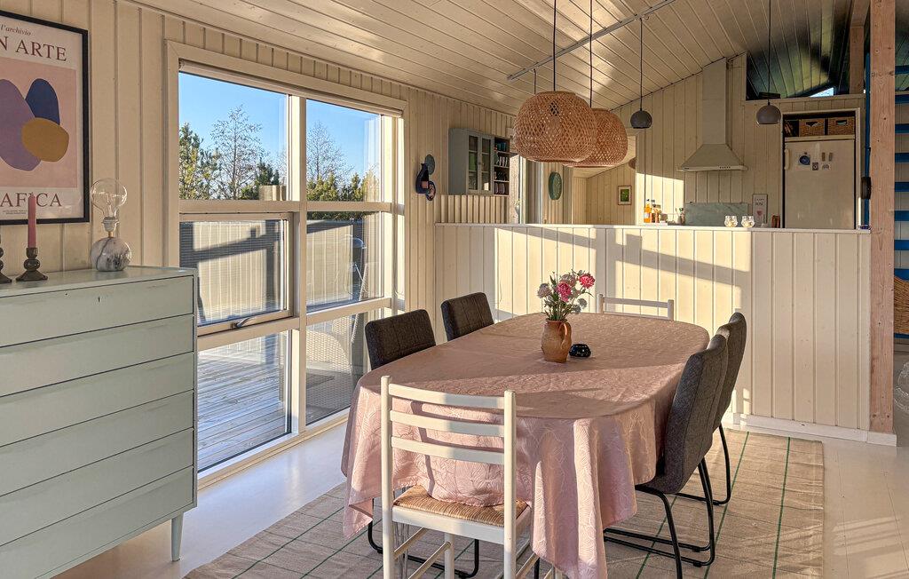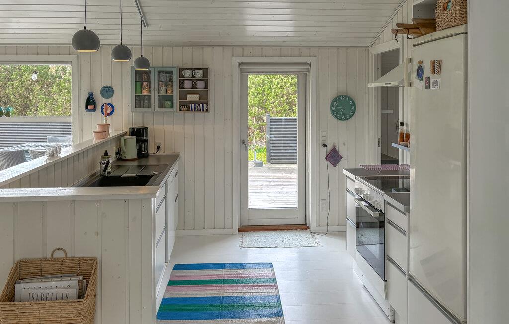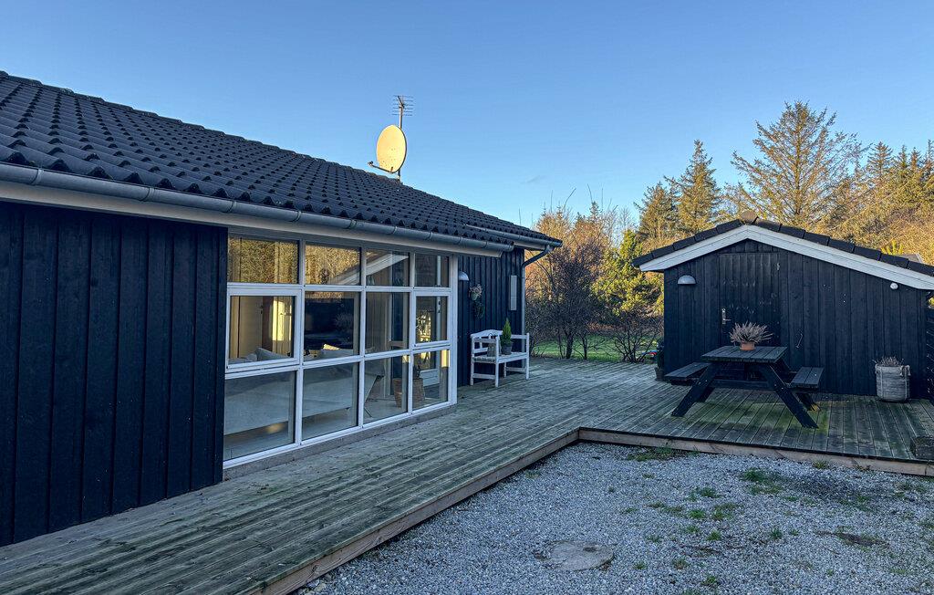 Dette feriehus tilbyder stilfulde indretningsløsninger, masser af lys og plads til hele familien – ideelt til en afslappende ferie ved den jyske vestkyst. Bliv budt velkommen af ??den indbydende atmosfære. Store vinduer giver rigeligt naturligt lys og en smuk udsigt over de omkringliggende grønne områder. Find jer til rette i den hyggelige sofa eller nyd måltiderne sammen ved spisebordet. Brændeovnen sørger for hyggelig varme på kølige dage, mens det åbne køkken lægger op til at lave mad sammen. Spabadet på badeværelset tilbyder ekstra afslapning.