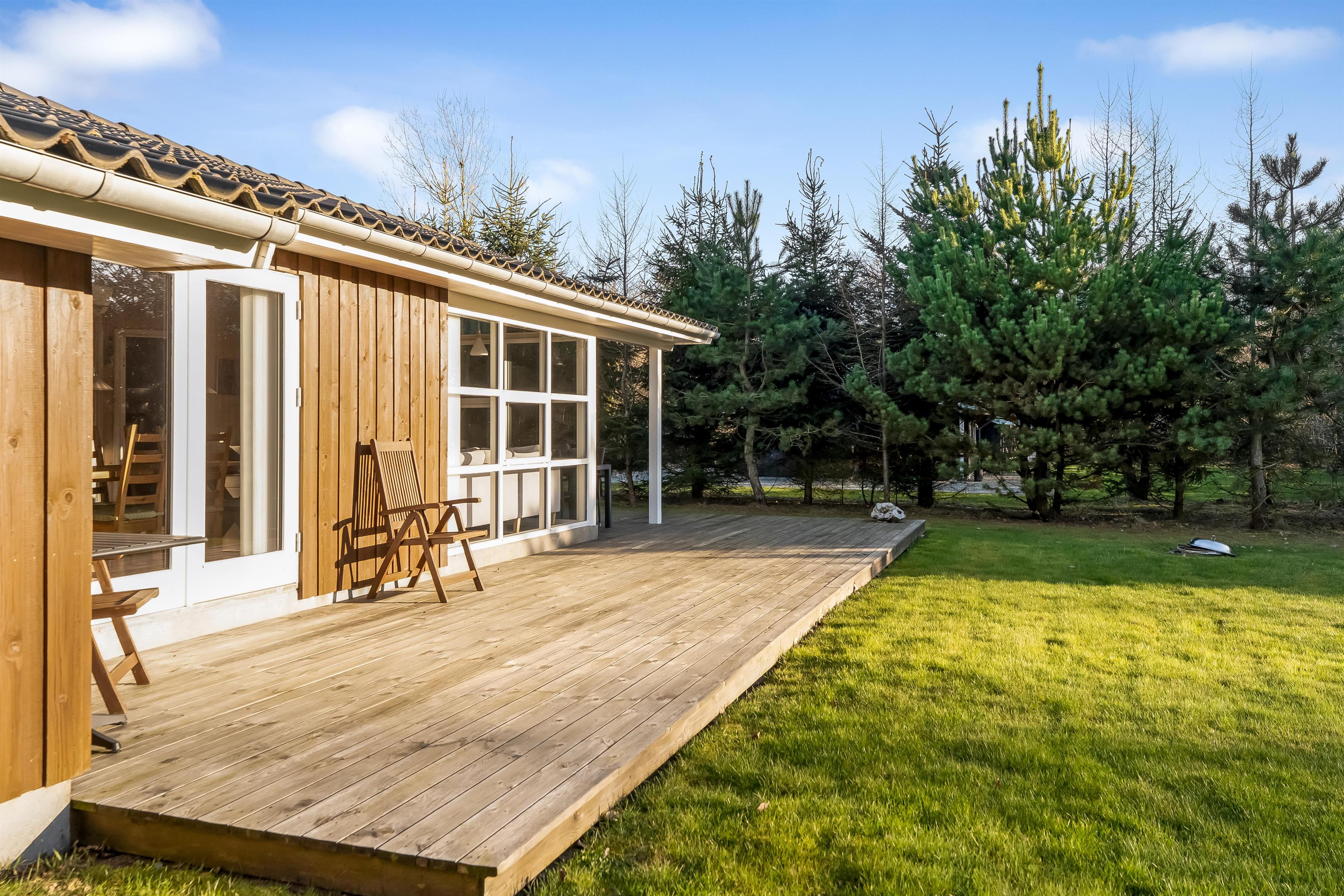 Udelivet er en stor del af oplevelsen her. Den overdækkede terrasse og den åbne terrasse giver jer flere gode steder at nyde solen, spise ude eller tænde op i grillen på lange sommeraftener. Grunden omkring huset giver plads til leg og afslapning, og det praktiske skur samt el-lader med CEE-stik gør opholdet ekstra bekvemt for moderne feriegæster. Her er også tænkt på de mindste med barneseng og barnestol, så familier kan rejse lettere.