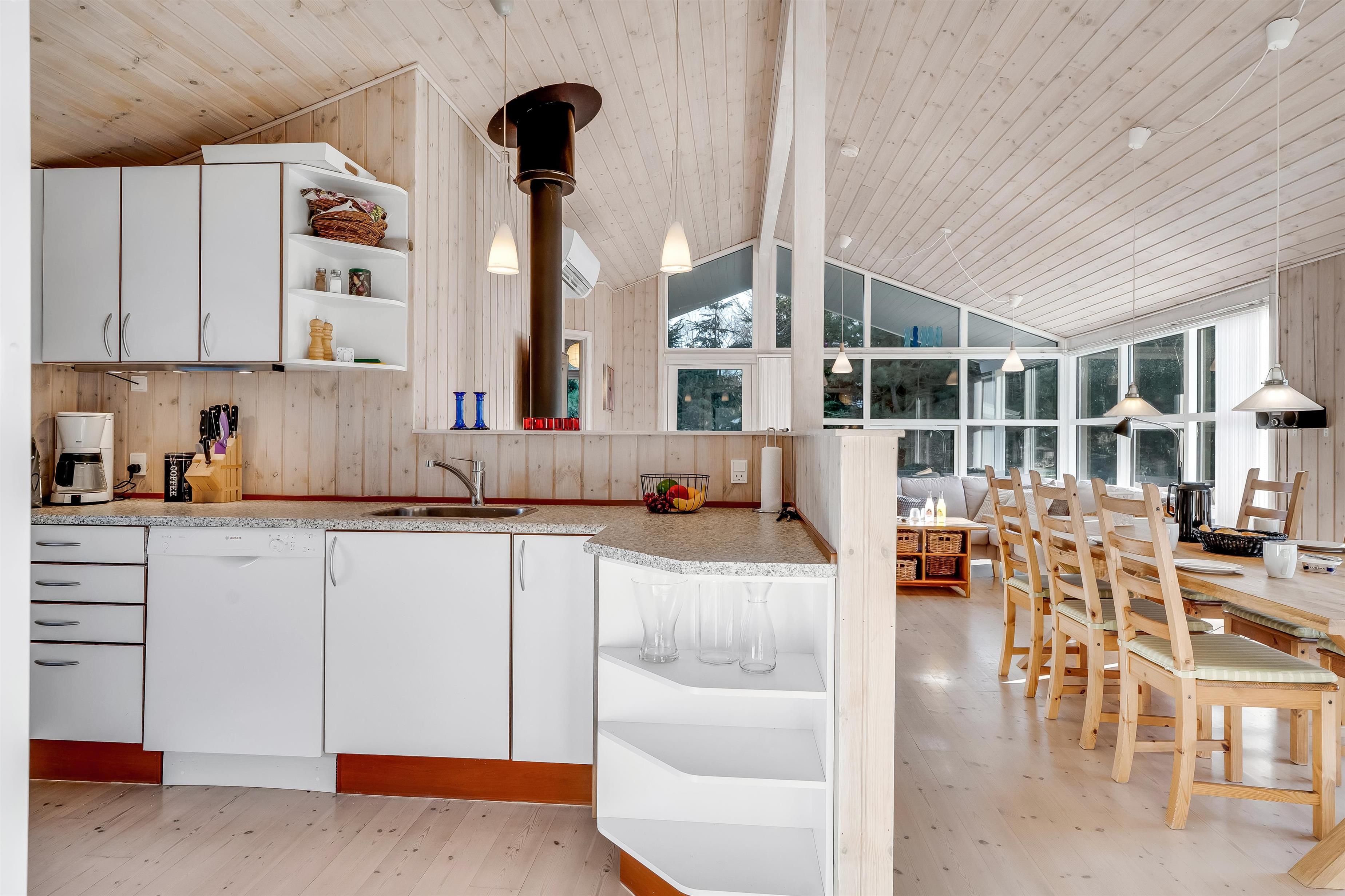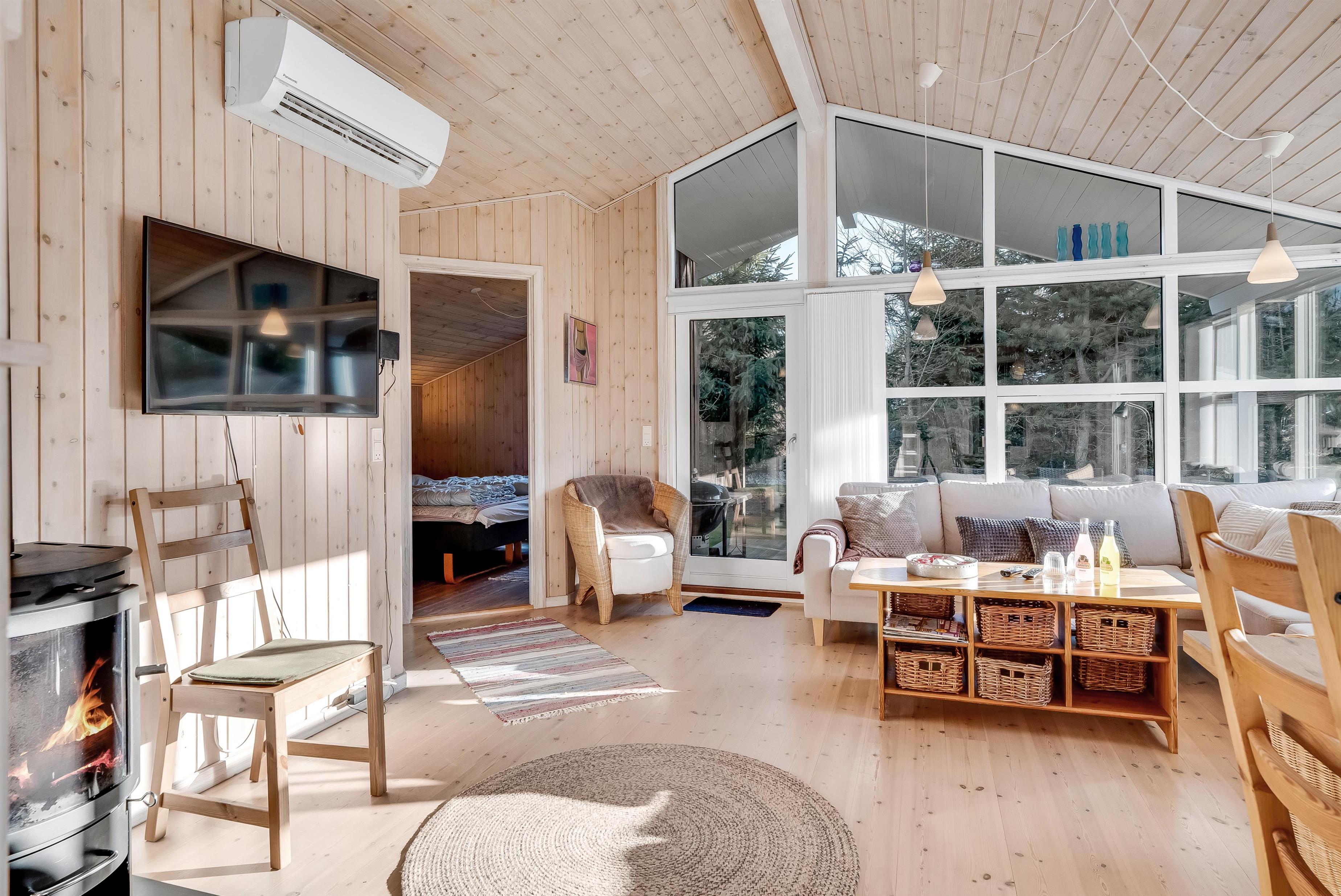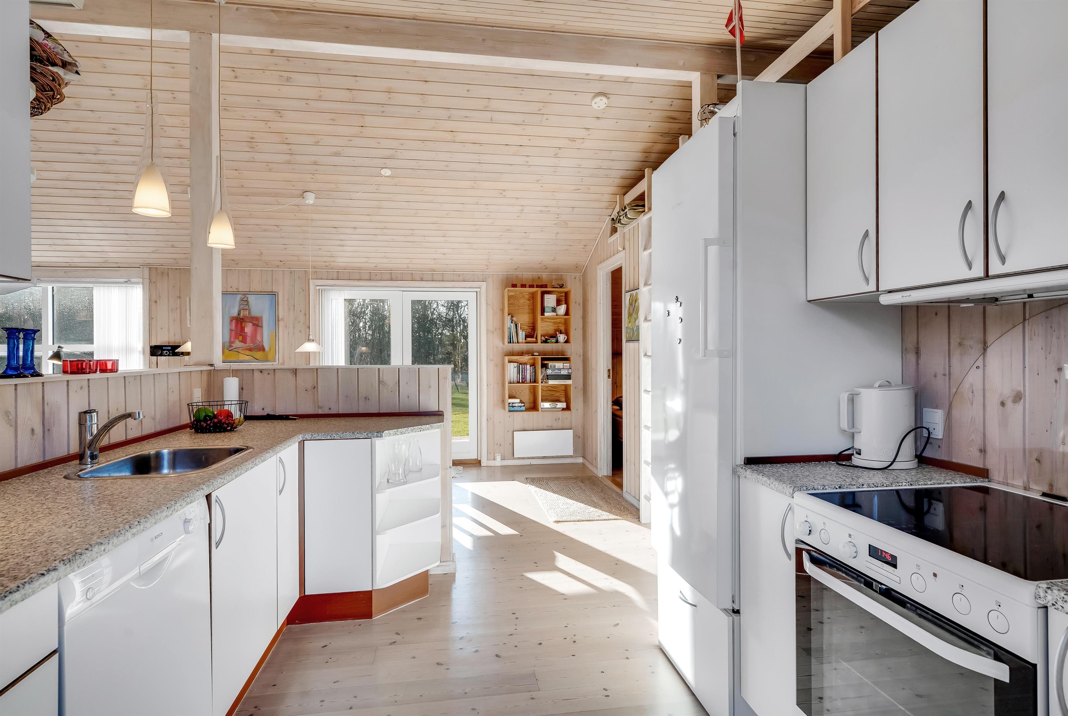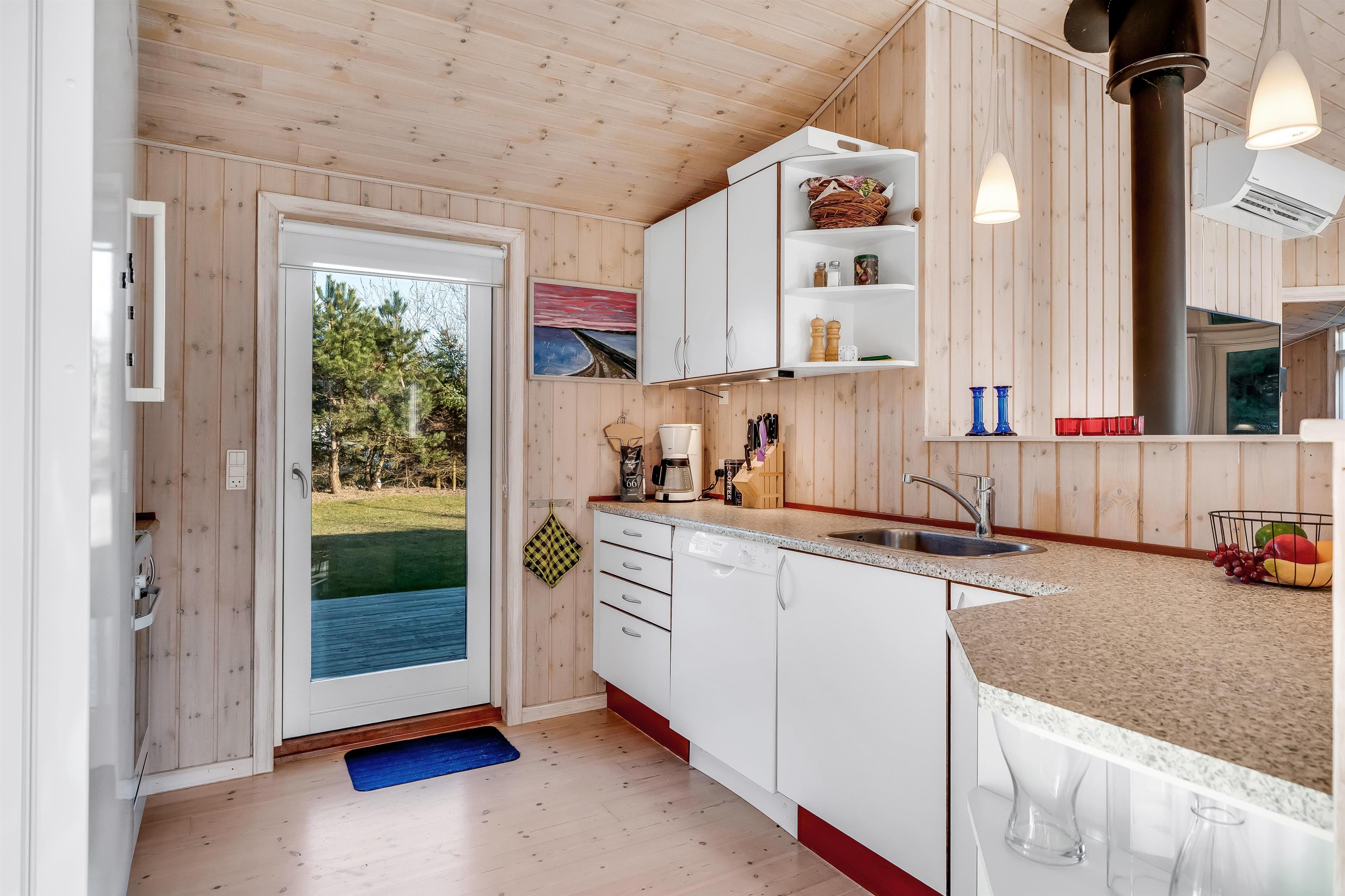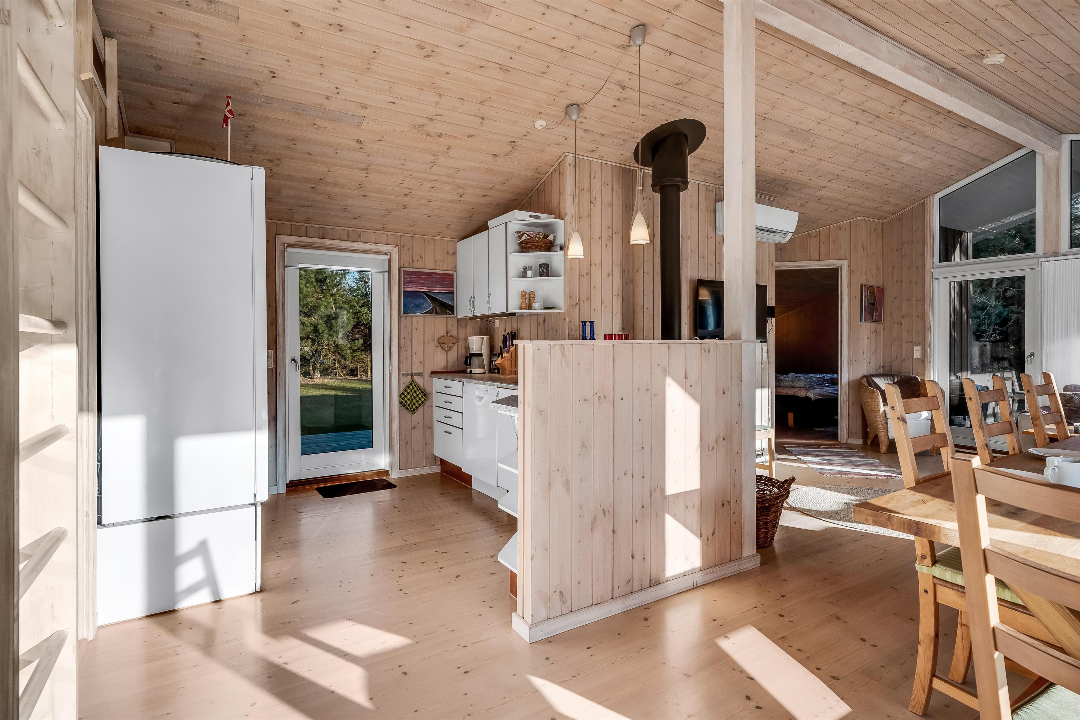 Indenfor mødes I af et lyst og funktionelt feriehus med tre soveværelser, alle indrettet med dobbeltsenge, så der er god plads til en familie eller en gruppe venner. Husets badeværelse har toilet og bruser samt gulvvarme, som giver en behagelig start på dagen. Køkkenet er veludstyret med induktionskomfur, ovn, køleskab, fryser på 10 liter, opvaskemaskine og kaffemaskine, så både morgenkaffen og fælles måltiderne kan klares uden besvær. Den hyggelige stue samler jer omkring husets TV med både danske og tyske kanaler samt trådløst internet, mens både brændeovn og den energibesparende varmepumpe, der også kan fungere som aircondition, sikrer et behageligt indeklima året rundt.