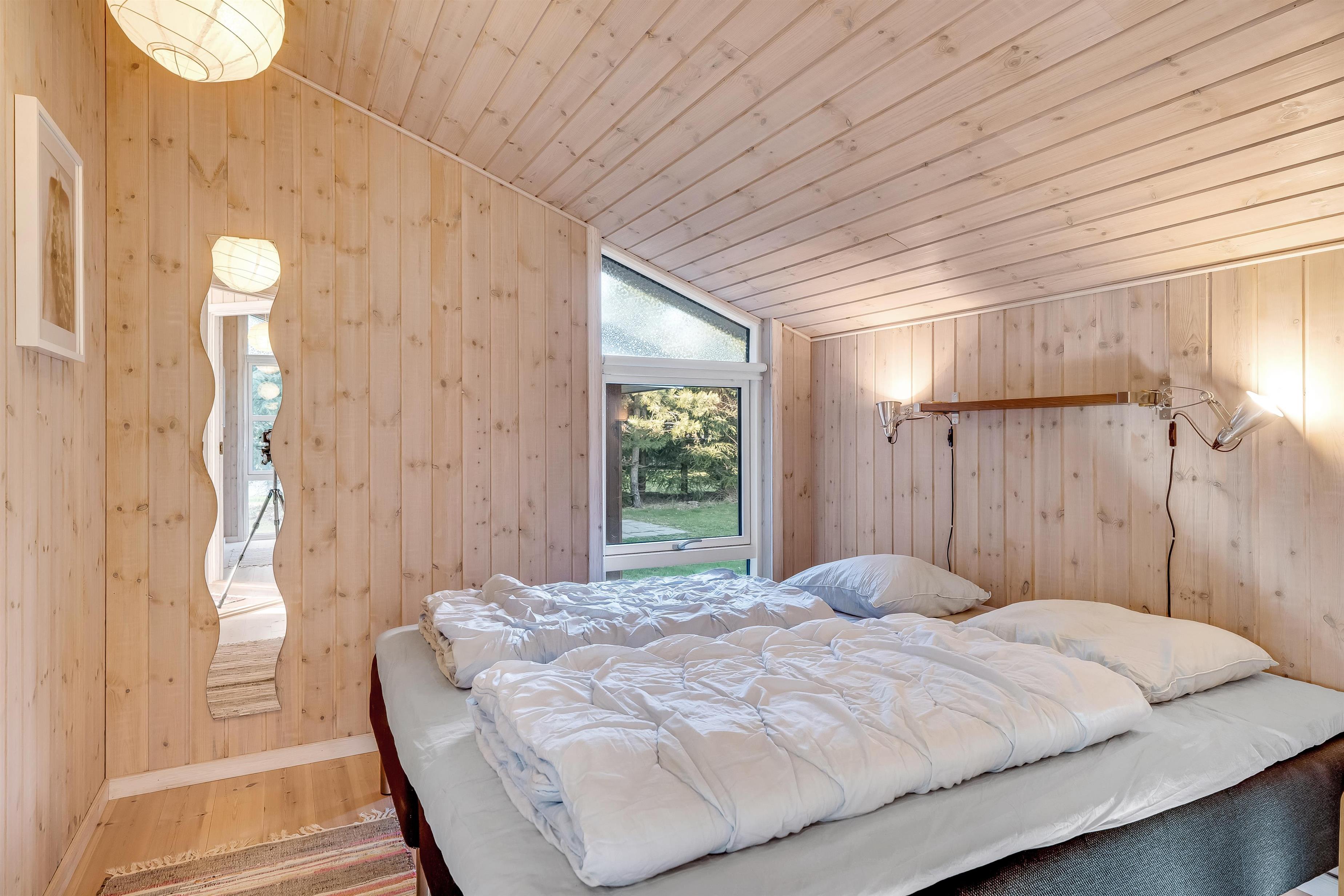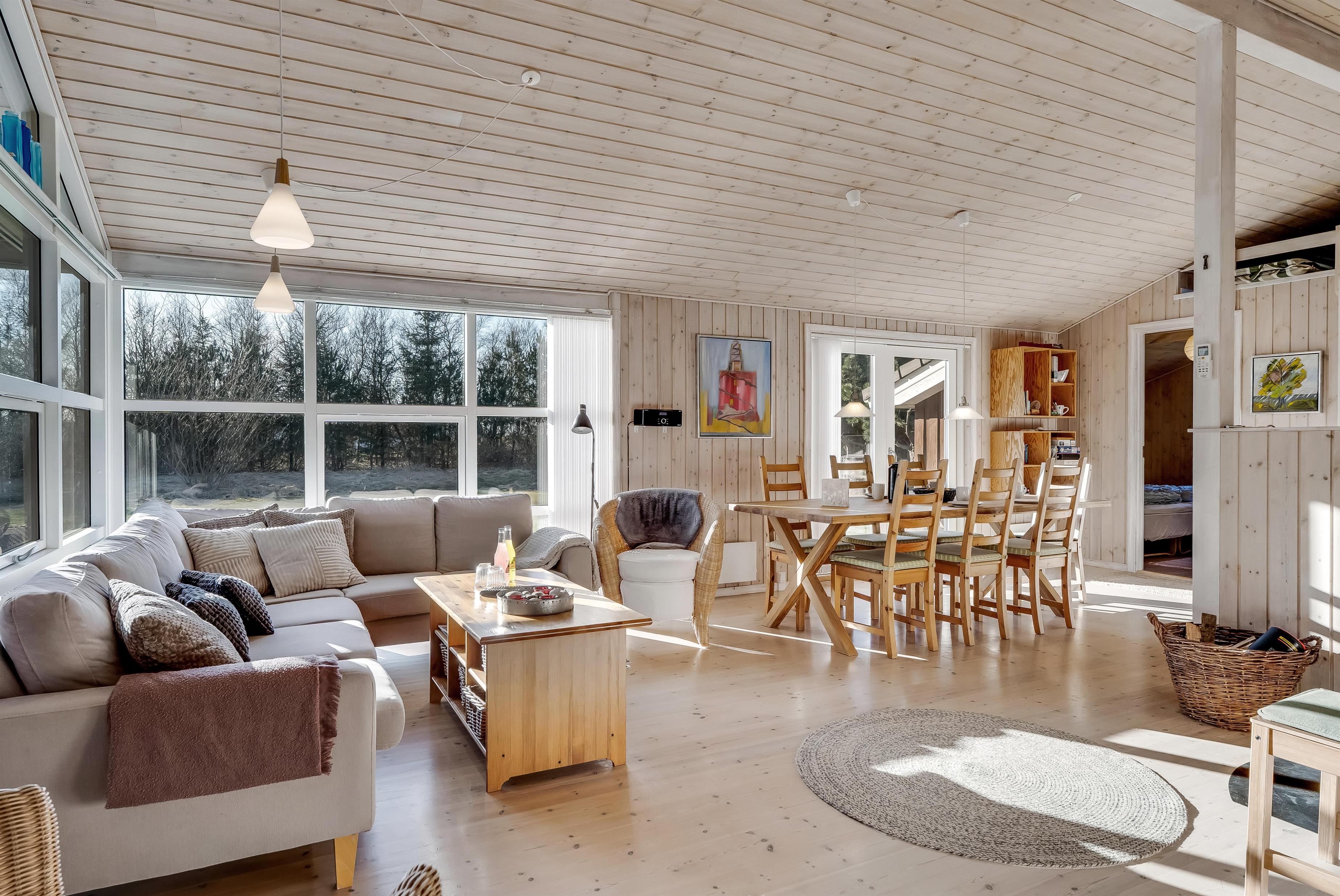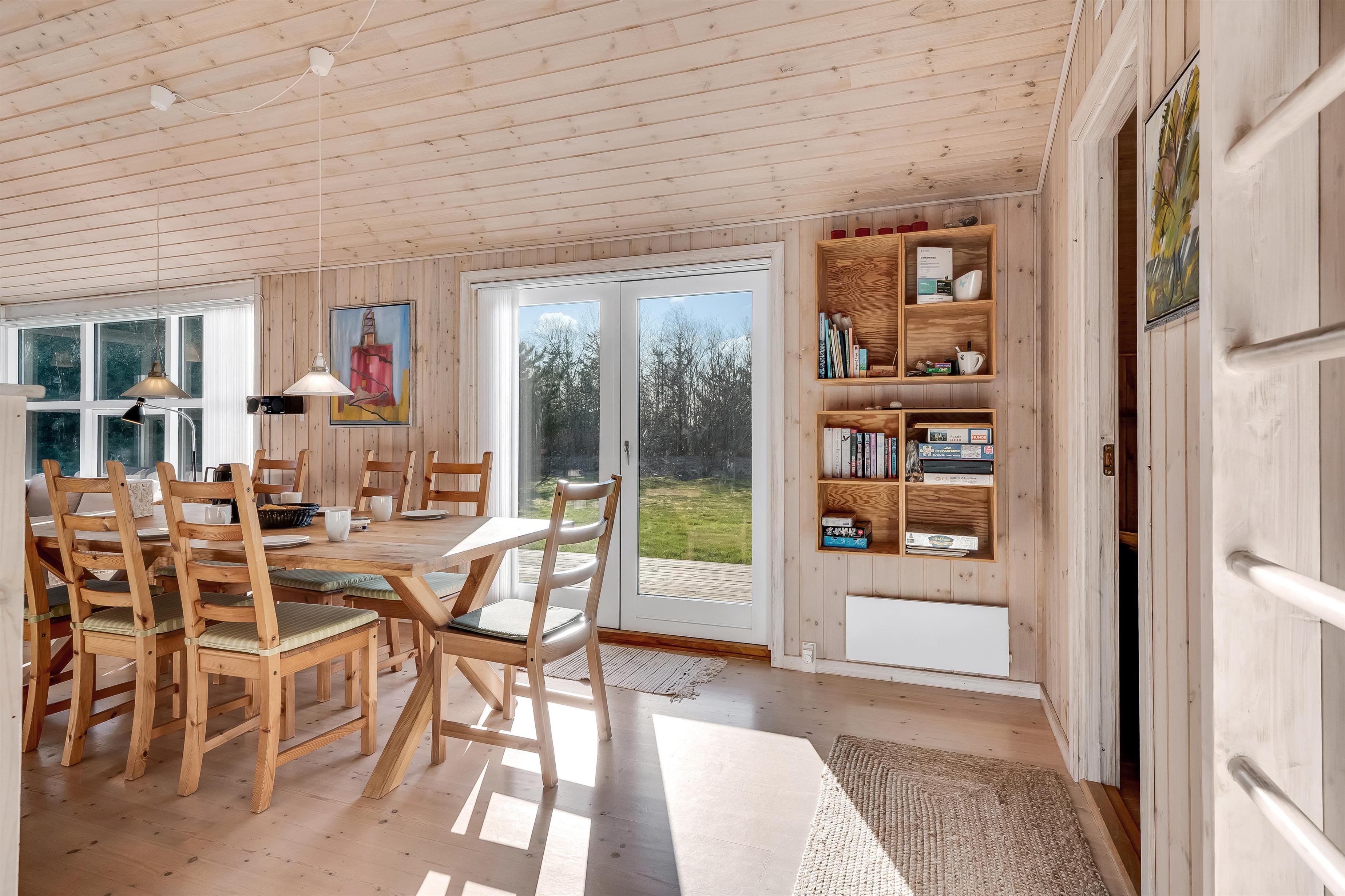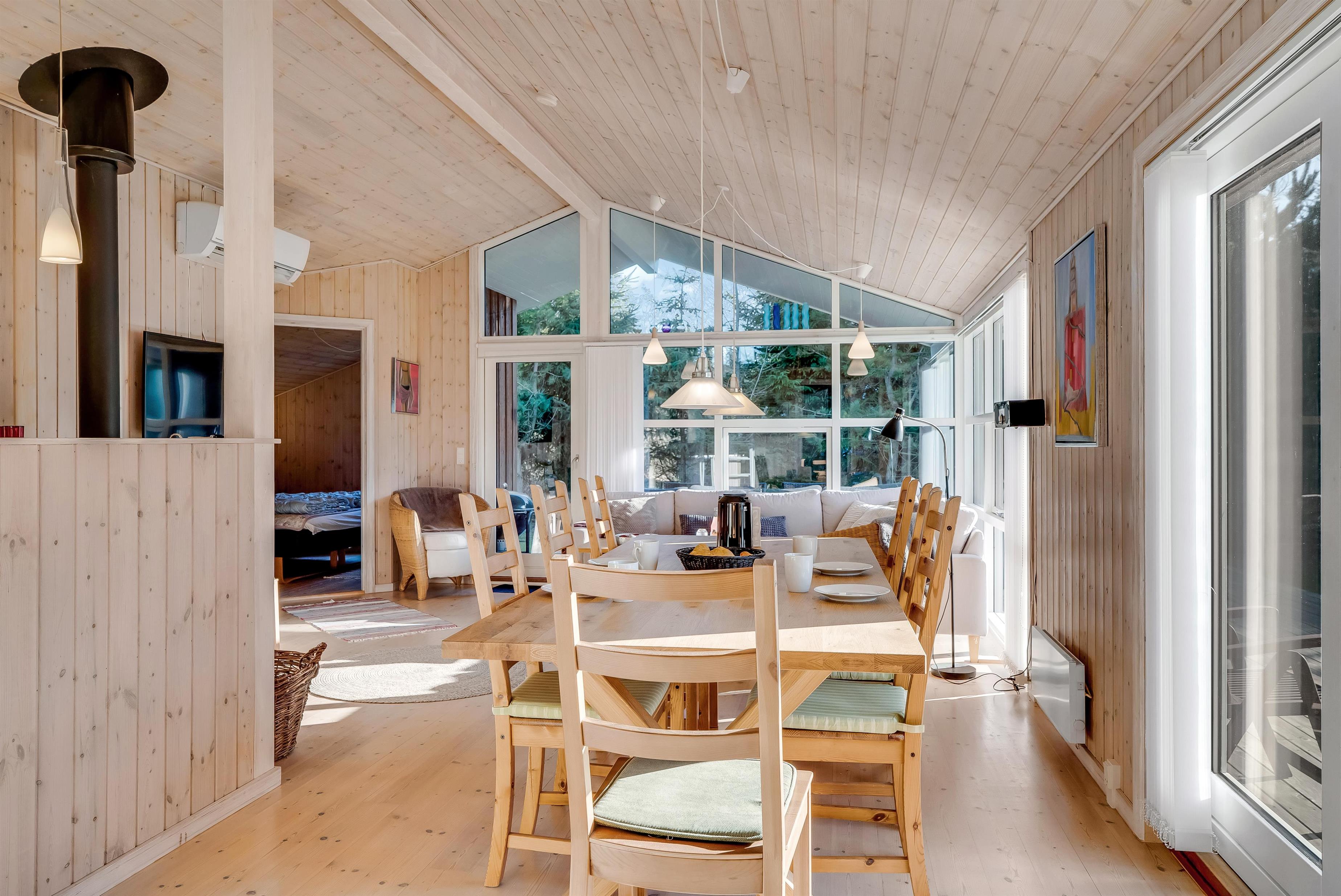 Indenfor mødes I af et lyst og funktionelt feriehus med tre soveværelser, alle indrettet med dobbeltsenge, så der er god plads til en familie eller en gruppe venner. Husets badeværelse har toilet og bruser samt gulvvarme, som giver en behagelig start på dagen. Køkkenet er veludstyret med induktionskomfur, ovn, køleskab, fryser på 10 liter, opvaskemaskine og kaffemaskine, så både morgenkaffen og fælles måltiderne kan klares uden besvær. Den hyggelige stue samler jer omkring husets TV med både danske og tyske kanaler samt trådløst internet, mens både brændeovn og den energibesparende varmepumpe, der også kan fungere som aircondition, sikrer et behageligt indeklima året rundt.