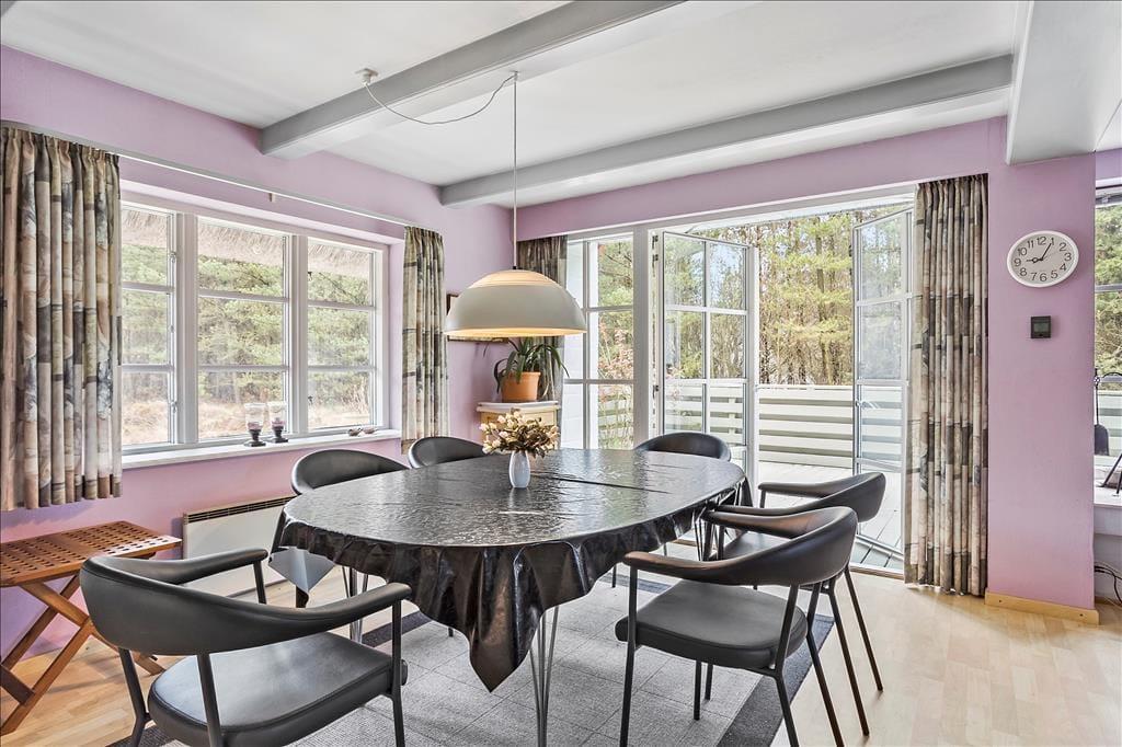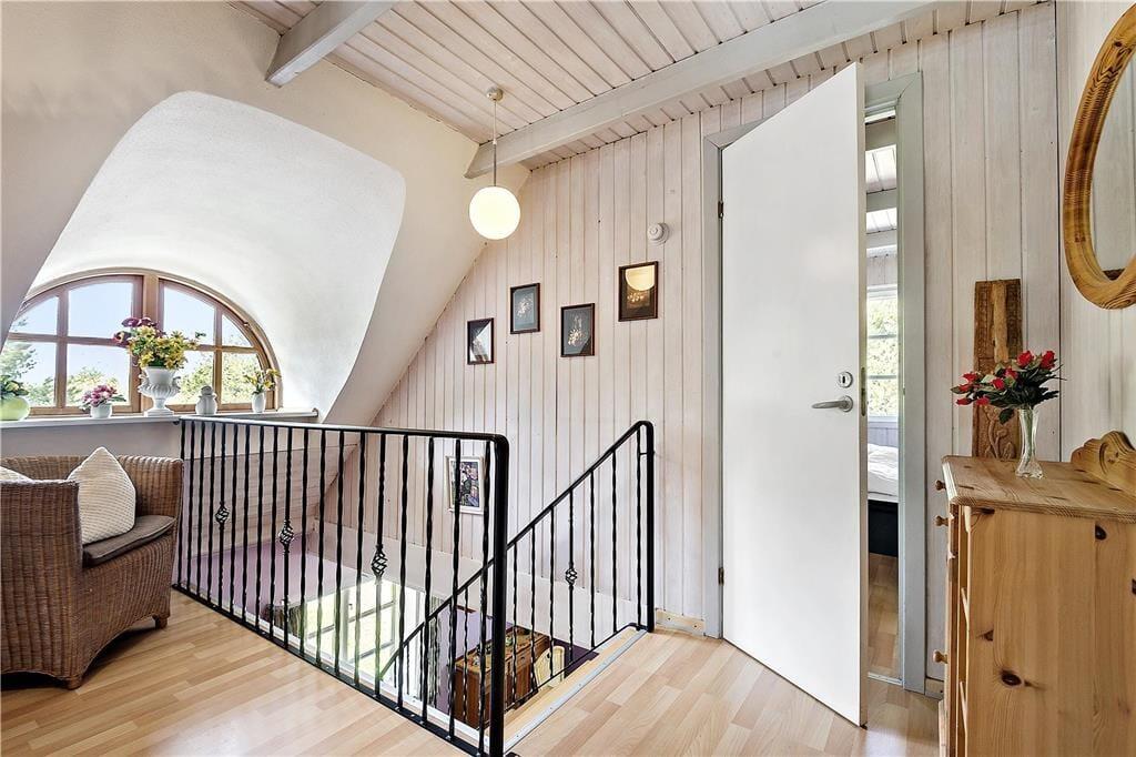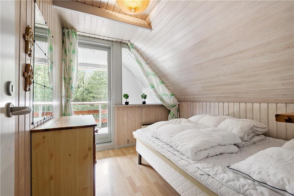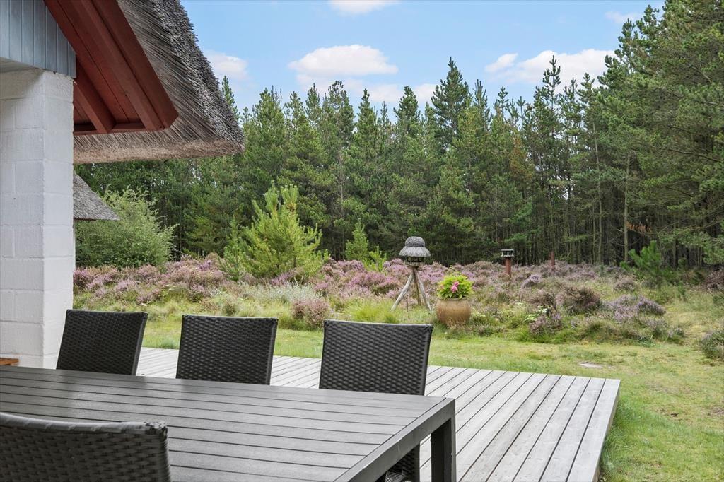 Udearealerne er skønne, for sommerhuset er placeret på en stor naturgrund, der skærmes af fyrretræer. På en del af grunden får beplantningen lov til at vokse mere vildt. Endelig er der terrassen, som breder sig om flere sider af sommerhuset og tilbygningerne. Uanset tidspunktet på dagen er det nemt at finde en solrig opholdsplads, og hvis I hellere vil have skygge, kan I slå parasollen op eller sætte jer på førstesalens overdækkede altan.