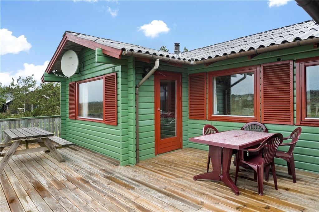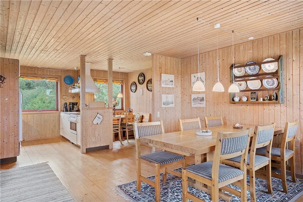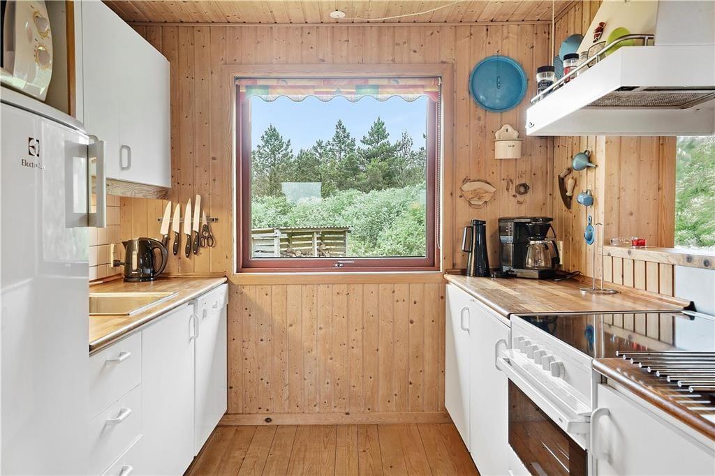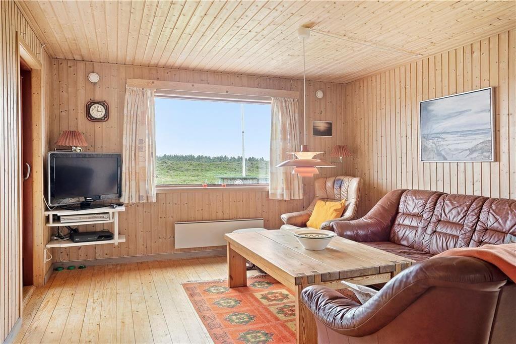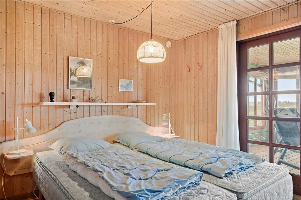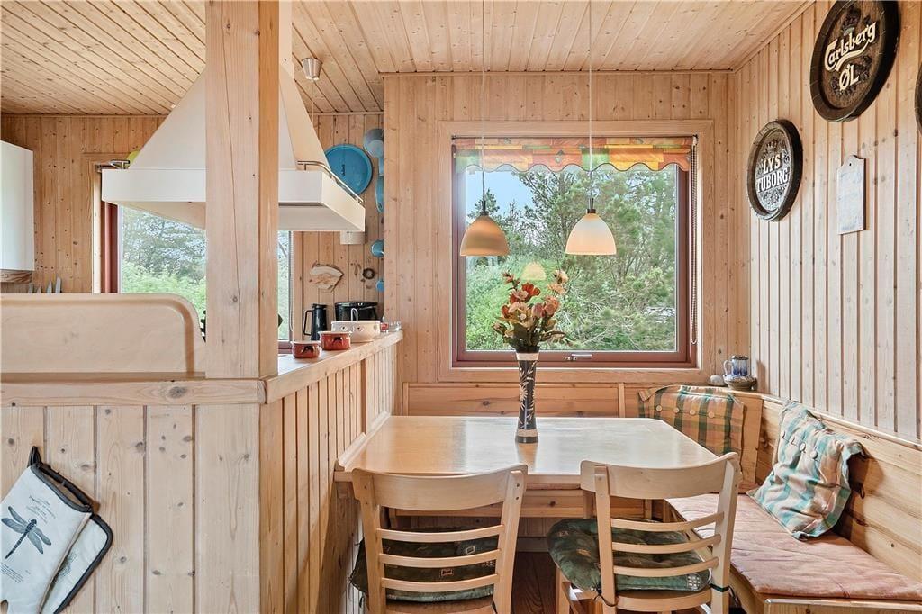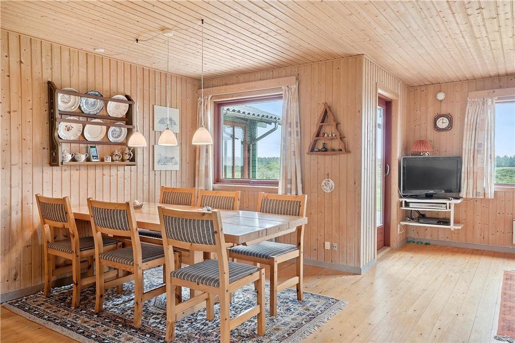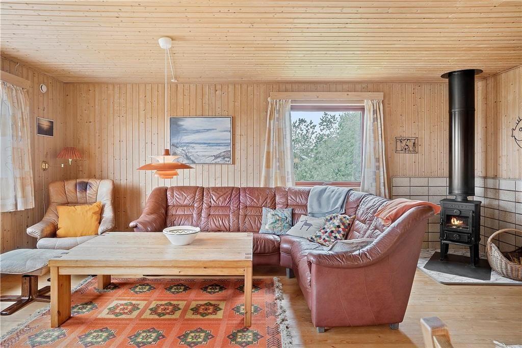 Inden døre er atmosfæren lys og let, for de mange vinduer åbenbarer ikke bare udsigten, men sørger også for et skønt lysindfald. I bedste sommerhusstil er der umalede trælister på væggene og brændeovn i stuen, og det hyggelige møblement bidrager til den gode stemning. Stue og køkken danner tilsammen et stort og herligt opholdsrum, hvor I kan hygge jer med madlavning, brætspil, en god film eller andre fælles ferieaktiviteter. Hyggestunderne kan alternativt foregå i udestuen, hvor panoramaudsigten virkelig imponerer – og hvis det er køligt udenfor, kan I forkæle jer selv med en tur i husets sauna. Planløsningen består derudover af et badeværelse og tre soveværelser, og alle rum præsenterer sig på pæn og velholdt vis.