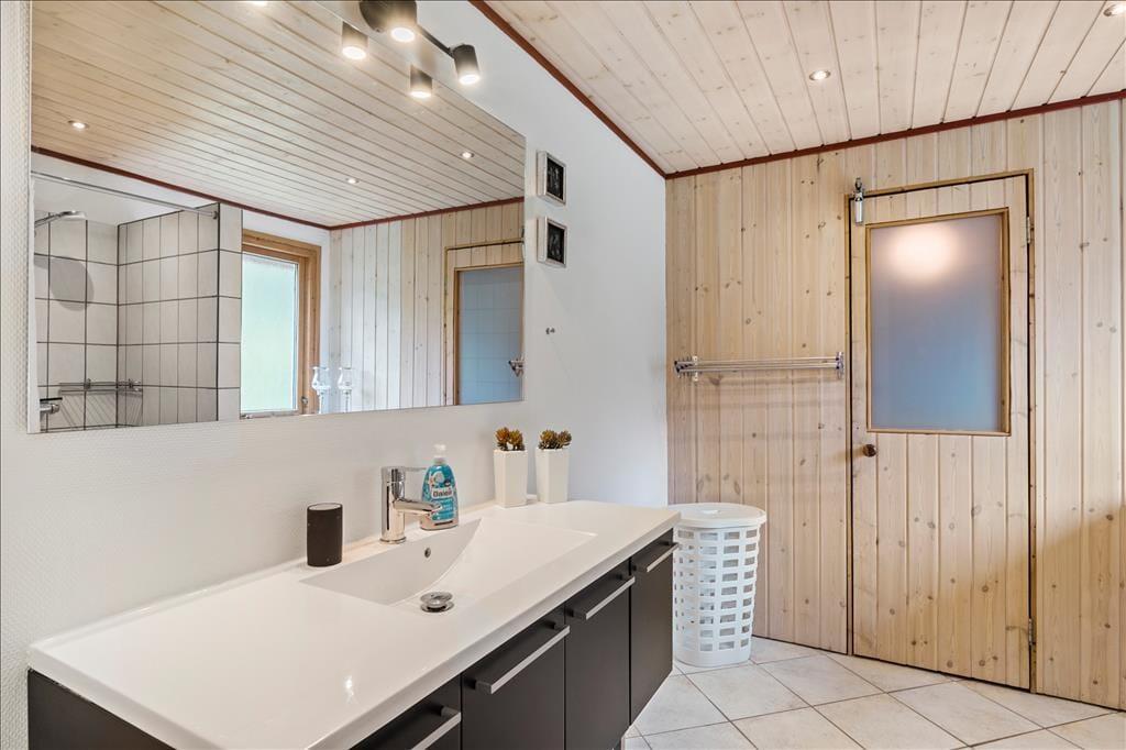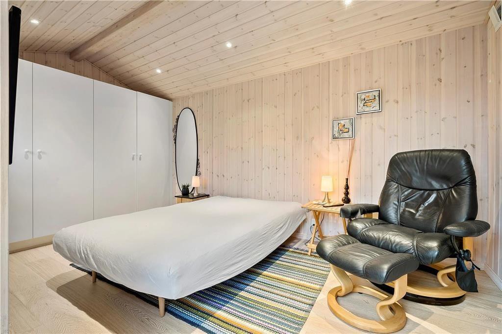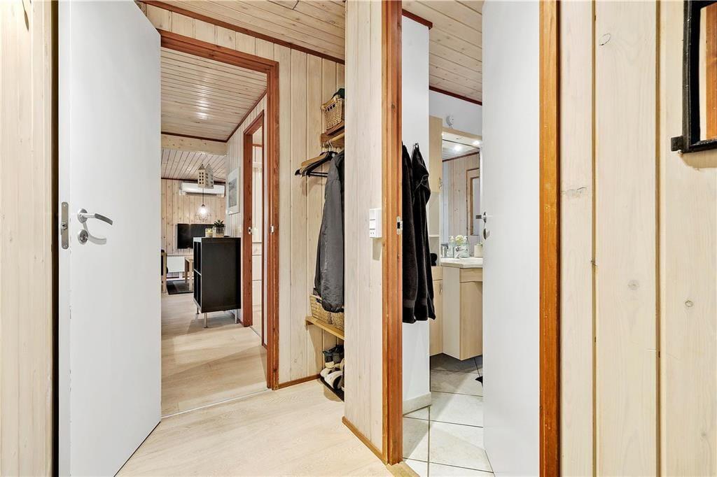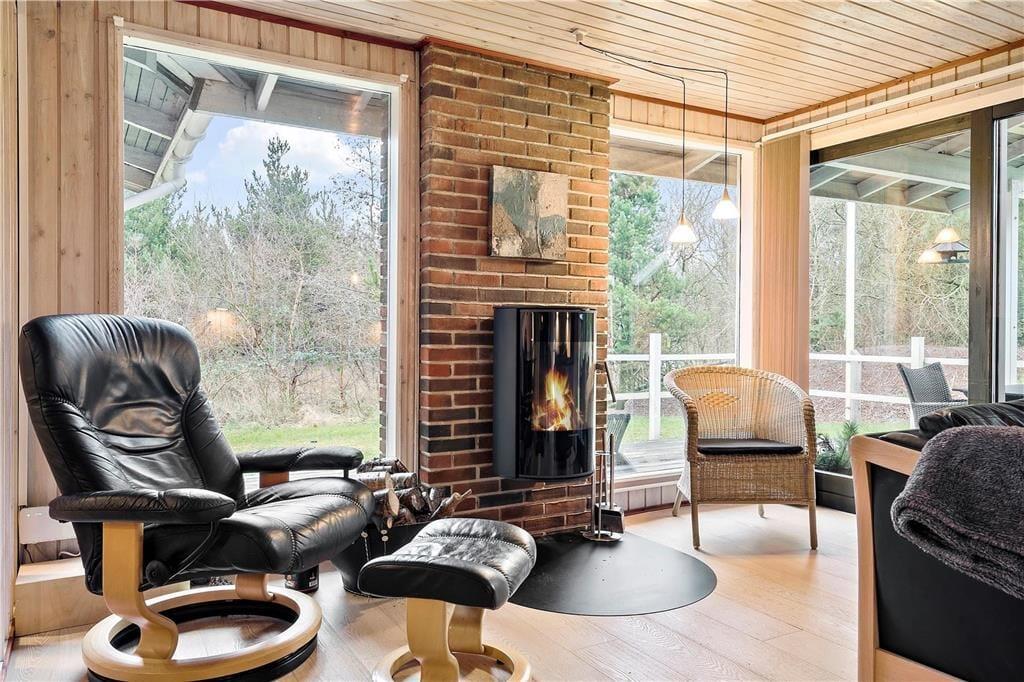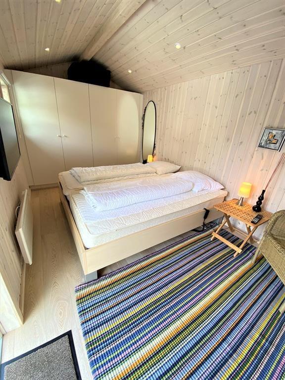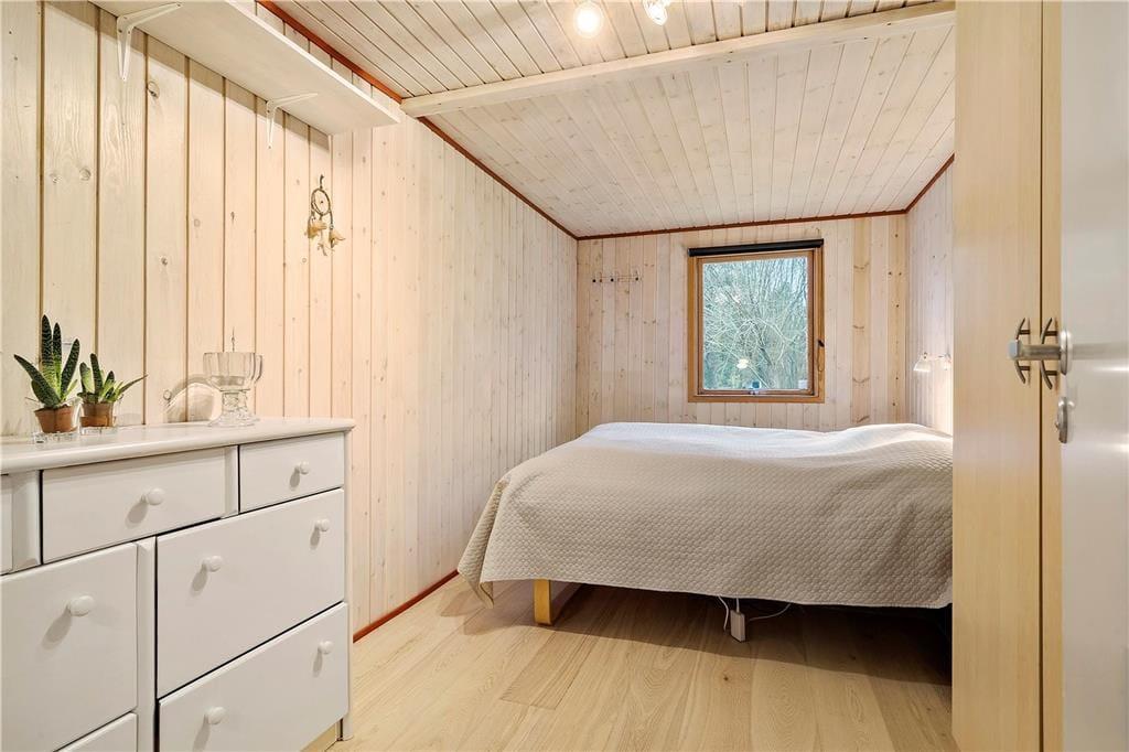 Der er virkelig lagt op til indendørs kvalitetstid i sommerhuset, der er et pænt og velholdt træsommerhus med rødmalet facade. Alle rum fremstår lyse og indbydende – selv bryggerset og badeværelset, hvoraf sidstnævnte er udstyret med vaskemaskine, tørretumbler og endda en sauna. Soveværelser er der to af, og dertil kommer et ekstra soverum i annekset, hvilket i alt giver plads til seks personer. De sociale hyggestunder kan udspille sig i sommerhusets flotte opholdsrum, der består af stue og køkken i åben forbindelse. I stuen er der brændeovn, flere gode siddemøbler og TV med danske og internationale kanaler – og hvis familien har modstridende ønsker, når I zapper gennem udvalget af programmer, er der for øvrigt også TV i annekset.