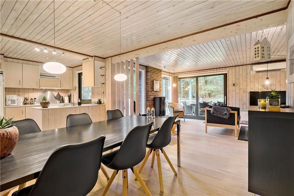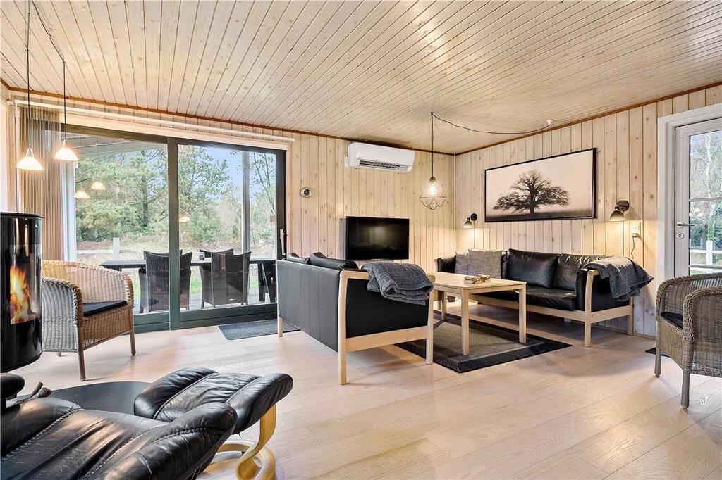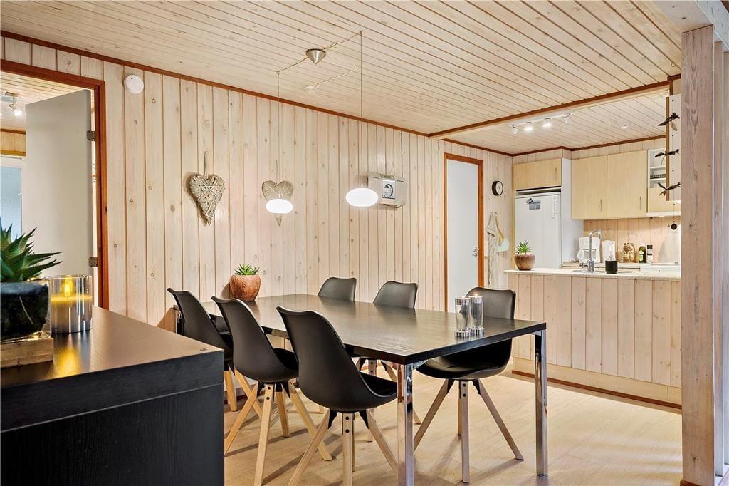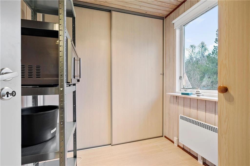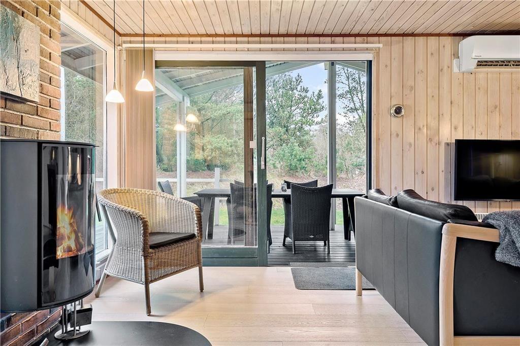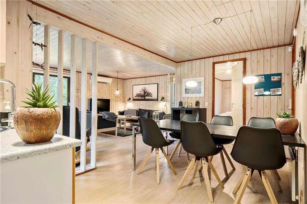 Der er virkelig lagt op til indendørs kvalitetstid i sommerhuset, der er et pænt og velholdt træsommerhus med rødmalet facade. Alle rum fremstår lyse og indbydende – selv bryggerset og badeværelset, hvoraf sidstnævnte er udstyret med vaskemaskine, tørretumbler og endda en sauna. Soveværelser er der to af, og dertil kommer et ekstra soverum i annekset, hvilket i alt giver plads til seks personer. De sociale hyggestunder kan udspille sig i sommerhusets flotte opholdsrum, der består af stue og køkken i åben forbindelse. I stuen er der brændeovn, flere gode siddemøbler og TV med danske og internationale kanaler – og hvis familien har modstridende ønsker, når I zapper gennem udvalget af programmer, er der for øvrigt også TV i annekset.