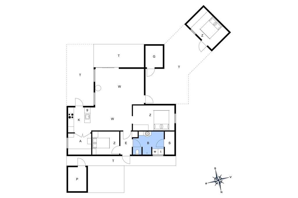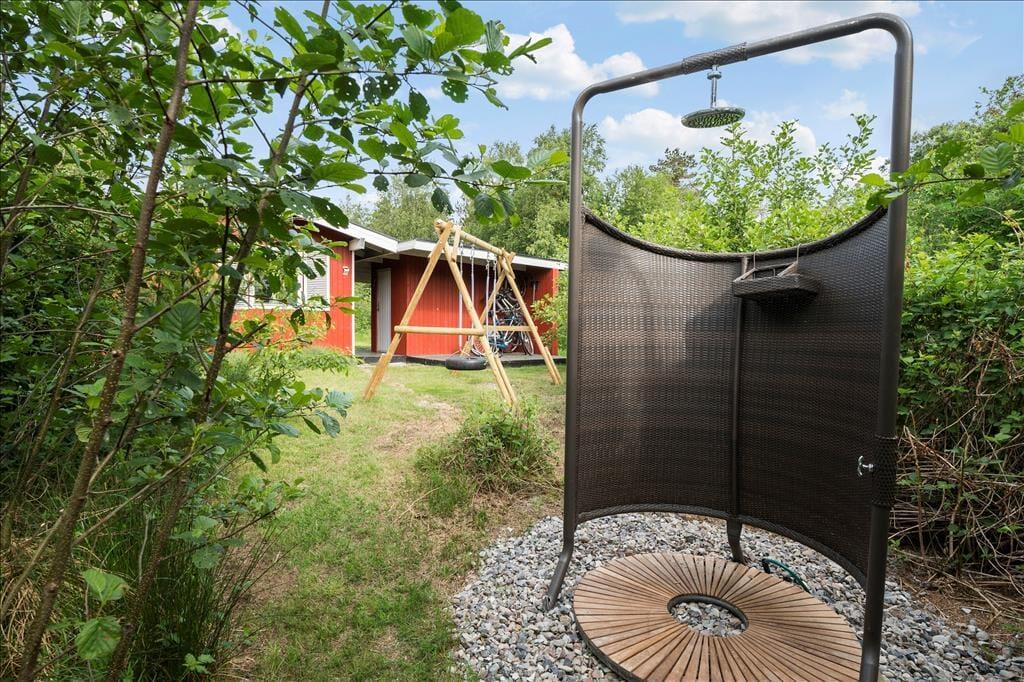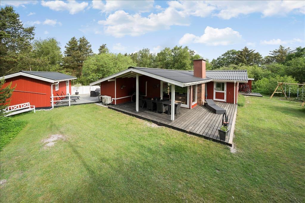 Sommerhus og anneks forbindes af en stor træterrasse, der er orienteret mod sydvest. Sydøst for huset ligger endnu en terrasse, der er delvist overdækket, så med andre ord kan I nemt finde den perfekte opholdsplads uanset tidspunktet og solforholdene. På grunden er der også en græsplæne med plads til leg og havespil, og bilen kan parkeres i carporten.