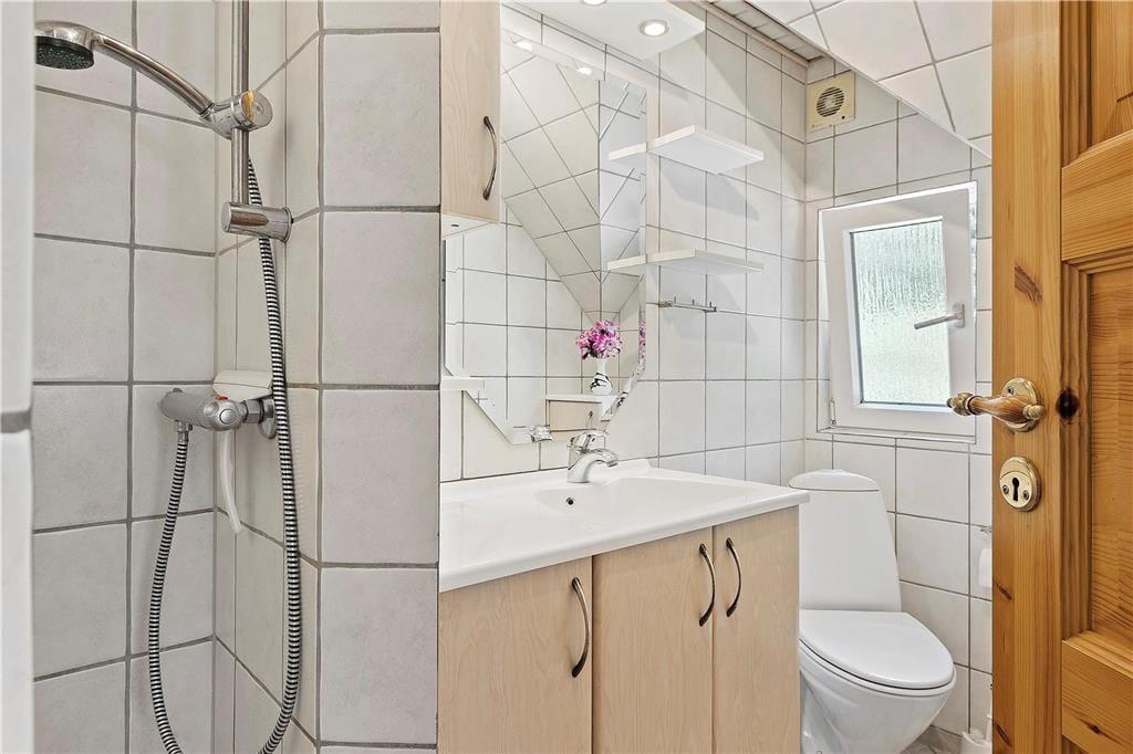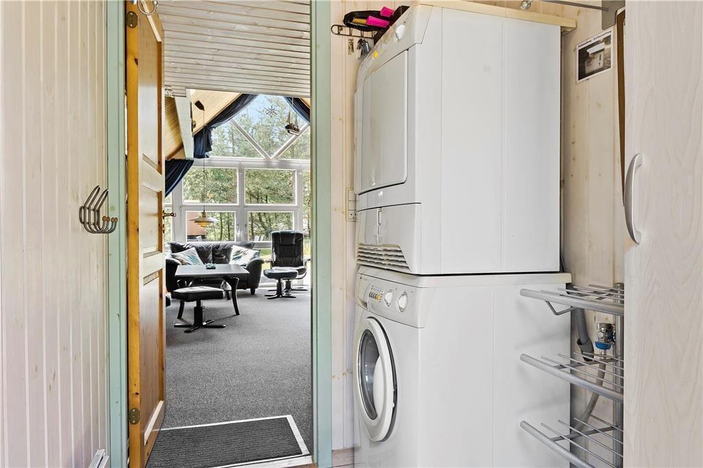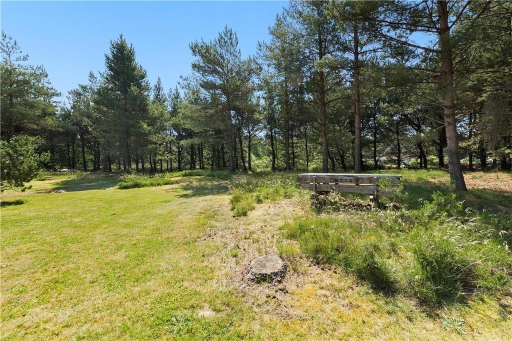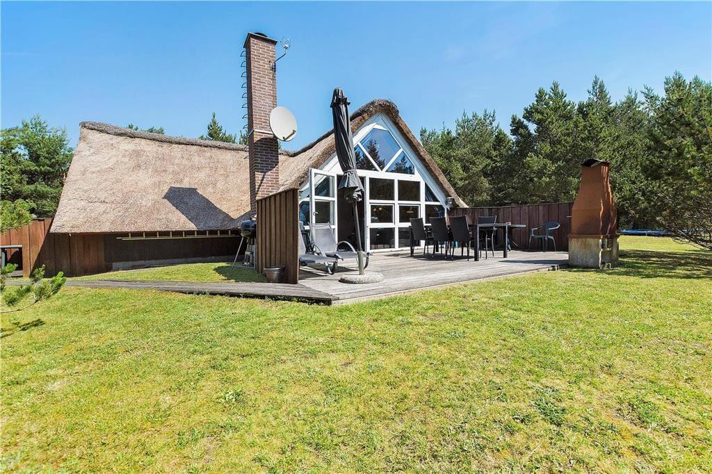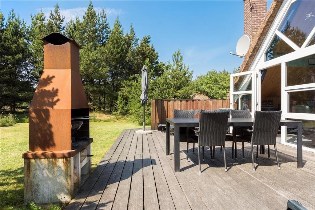 Fra stuen er der direkte adgang til en sydvendt træterrasse, som blandt andet er udstyret med en udendørs pejs. Takket være plankeværket kan det udendørs driverliv foregå helt ugeneret, og naturgrundens nåletræer giver læ og samtidig en køn udsigt. Trænger I til at skifte opholdsplads, kan I slå jer ned på den vestvendte terrasse – medmindre det er på tide at komme op af havestolene for at spille bold på grundens store græsplæne. Til de yngre feriegæster findes der desuden flere legefaciliteter, inklusiv gynge, trampolin og klatrestativ.