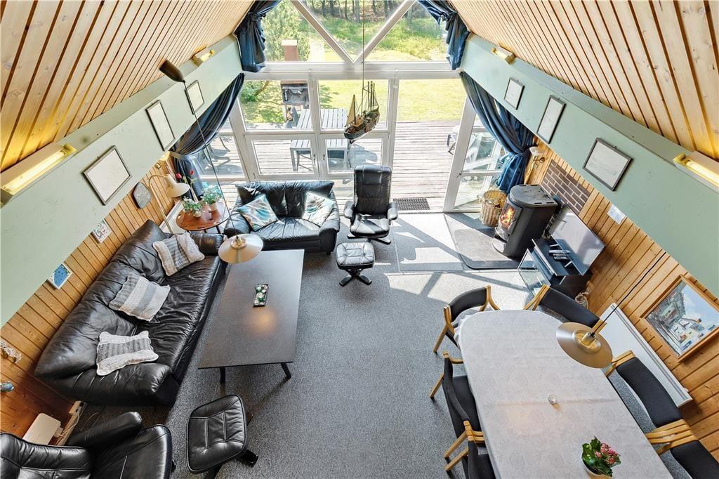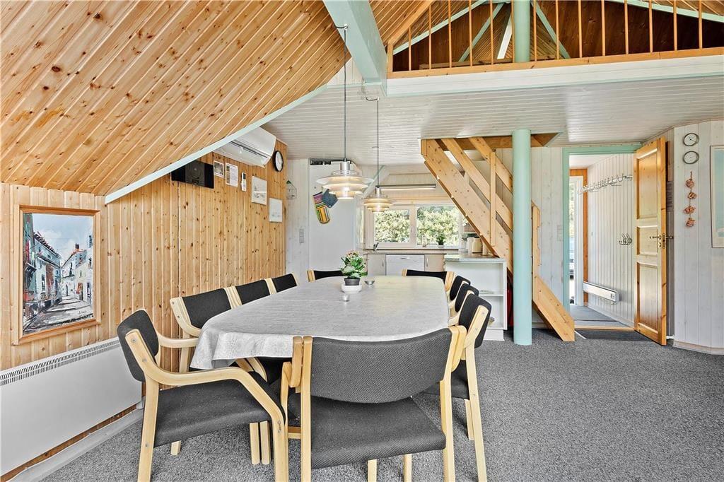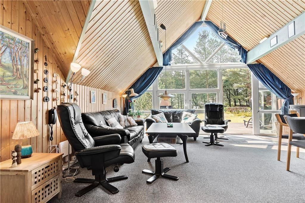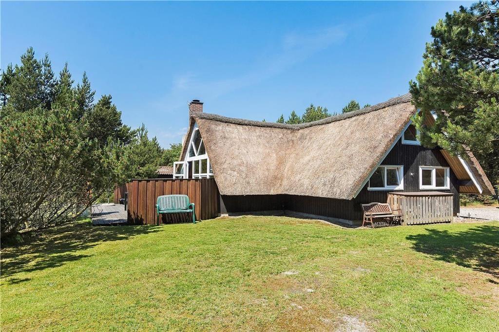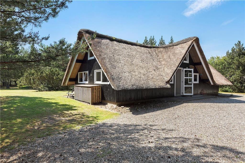 Med sit høje stråtag og mørke træfacade passer sommerhuset perfekt ind i de naturskønne omgivelser. Det er det helt rette sted at komme ned i ferietempo og slappe fuldstændig af – hvilket blandt andet kan foregå i husets spabad og sauna. Samtidig er det også stedet, hvor I kan samle hele familien, for det flotte hus kan nemt rumme 10 personer. De sociale afslapningsstunder kan foregå i opholdsrummet, der ligger midt i sommerhuset. Her er der brændeovn, loft til kip og komfortable siddemøbler, og et kæmpestort vinduesparti sørger for et glimrende lysindfald. Køkkenet er integreret med stuen, mens tre soveværelser og to badeværelser er fornuftigt fordelt i to soveafdelinger. Tager I trappen ovenpå, er der god plads til leg og hygge på hemsen, som desuden er indrettet med to ekstra soverum.