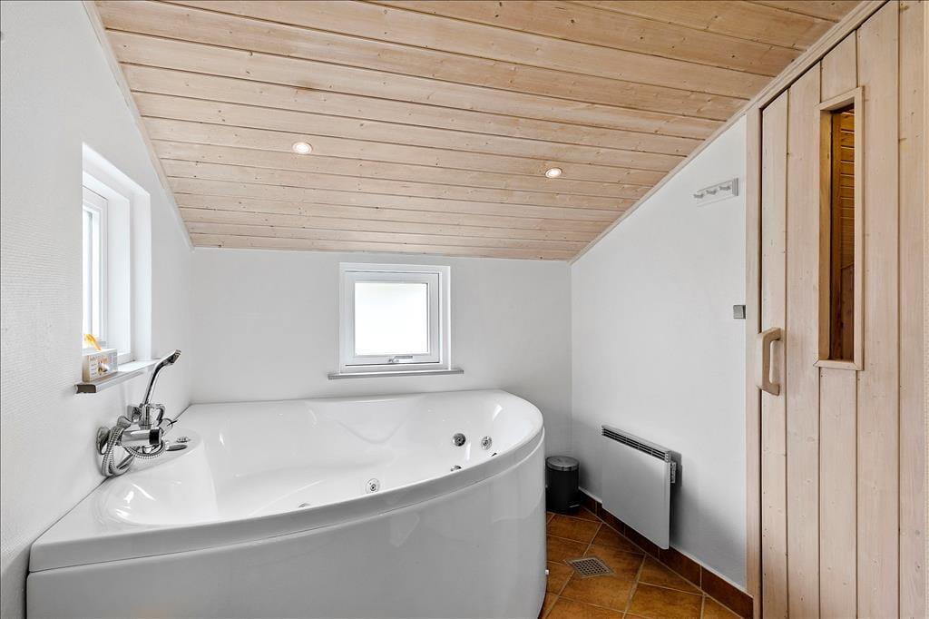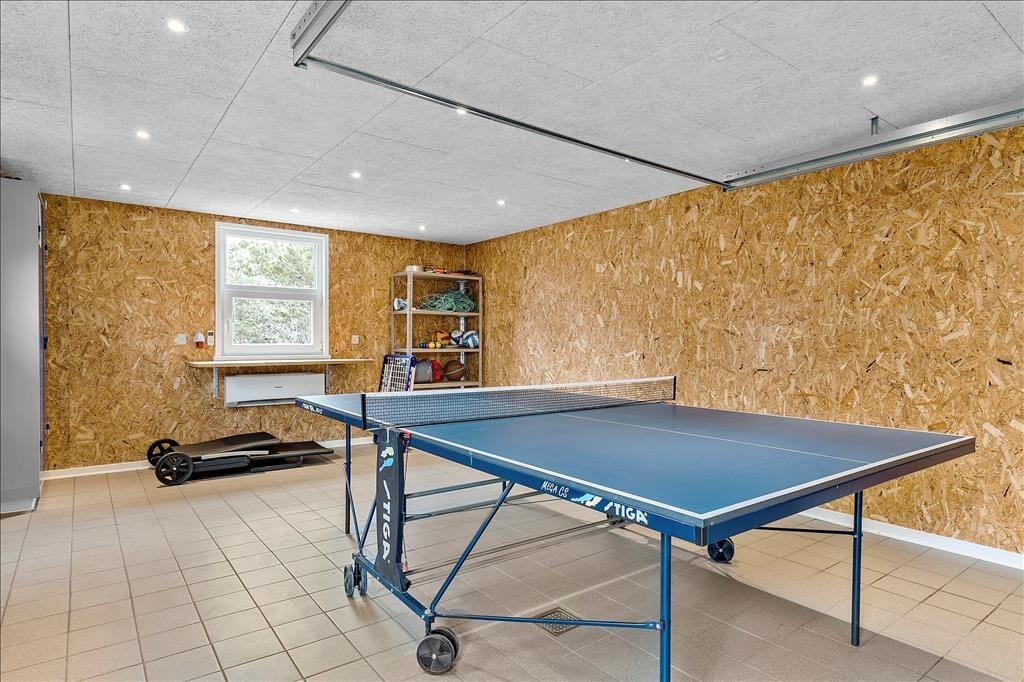 Med så mange kvadratmeter er det oplagt at invitere familie og venner med på ferien. Inden døre er der plads til ni feriegæster fordelt på fem gode soveværelser: To værelser er indrettet med dobbeltseng, et med to enkeltsenge og et med køjeseng, mens det femte værelse byder på en enkeltseng. Som en betænksom detalje er værelserne fordelt i begge ender af huset – og når I er mange samlet, er det desuden rart, at der hører både et badeværelse og et gæstetoilet med til planløsningen. Badeværelset er luksuriøst indrettet med spabad og sauna, så I har mulighed for at gøre klar til en rigtig wellnessaften. Afslapningsstunderne kan også foregå i den store stue med integreret køkken. Det indbydende opholdsrum er udstyret med både brændeovn og varmepumpe, og de store vinduespartier sørger for et skønt lysindfald og en fin udsigt til de grønne omgivelser. Trænger I til at røre jer lidt, kan I gå over i annekset, hvor I kan spille bordtennis i aktivitetsrummet.