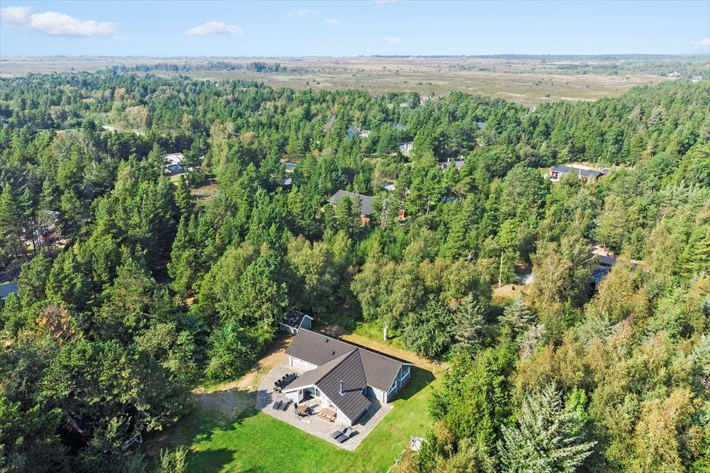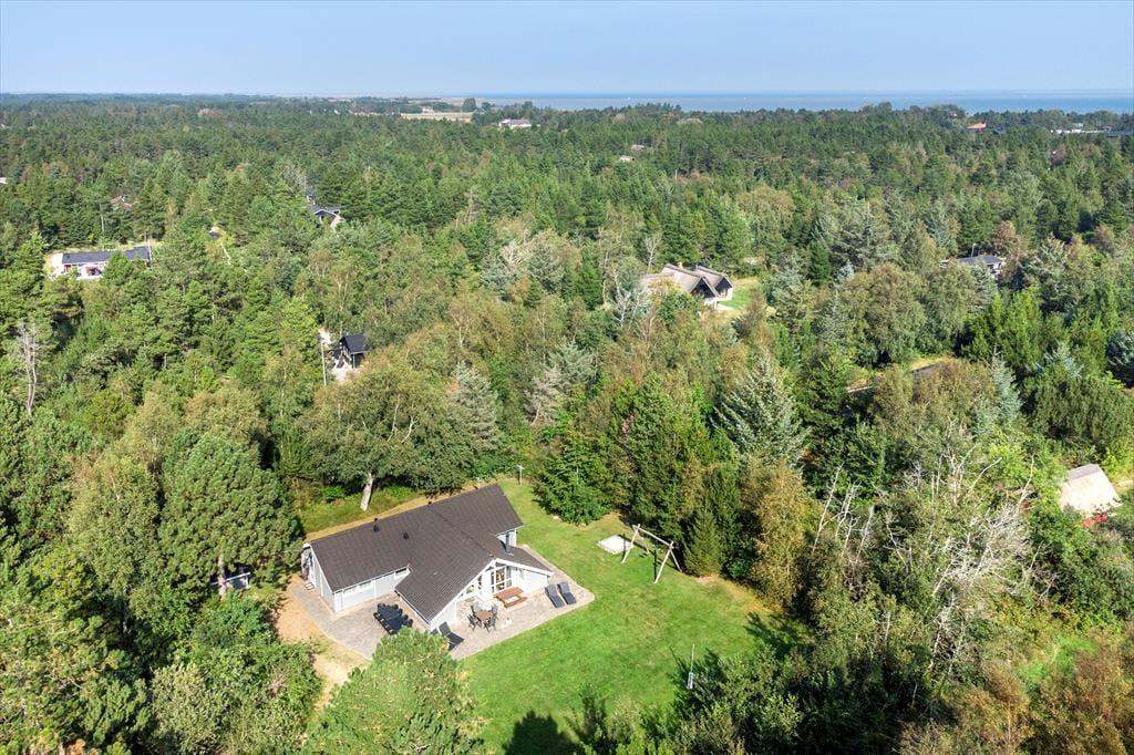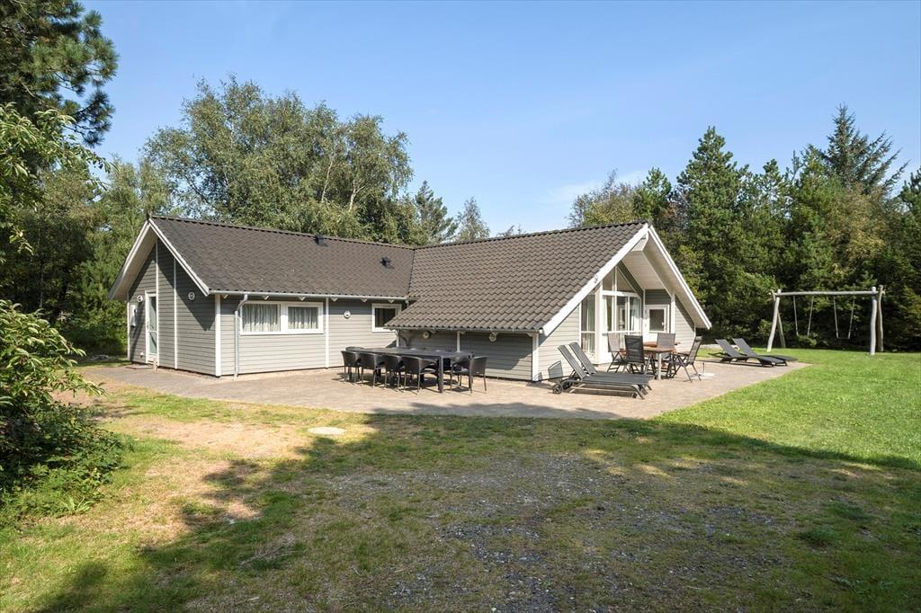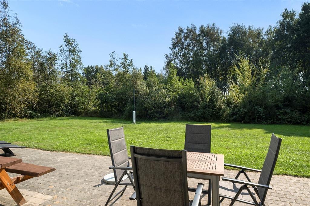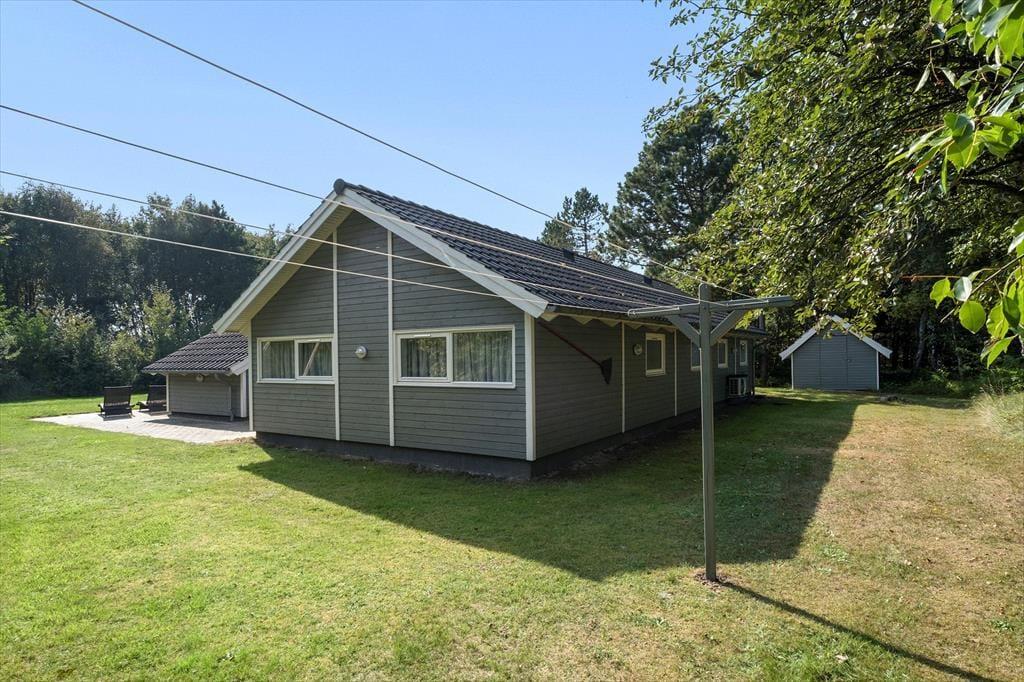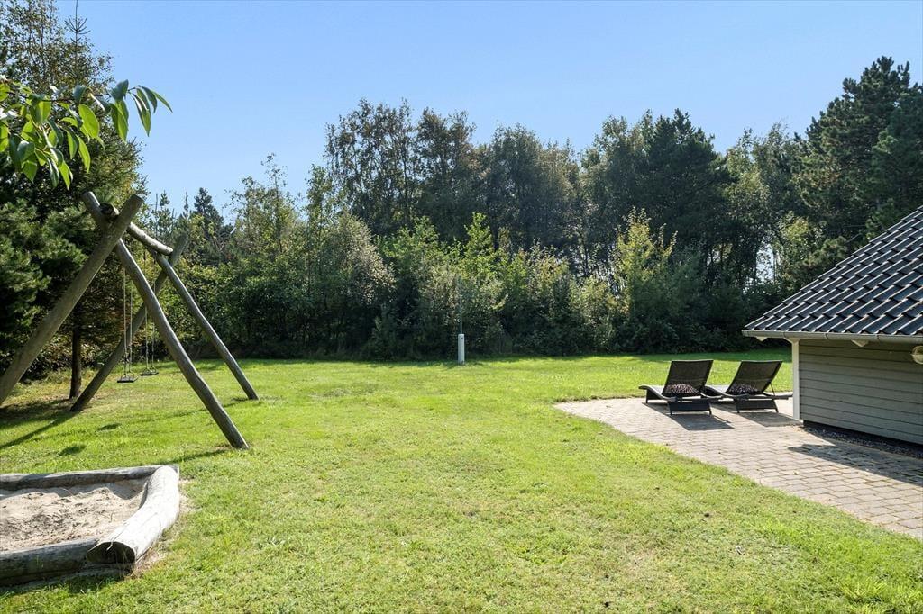 Der er masser af plads til at lege og slappe af ude i det fri på den 2500 m2 store, ugenerede grund, der skærmes af flotte træer til alle sider. Til de yngste er der sandkasse og gyngestativ, og græsplænen kan oplagt anvendes til boldspil, for der er også fodboldmål til rådighed. Den store, delvist overdækkede fliseterrasse, der smyger sig både syd, øst og vest for sommerhuset, vil formentlig mest blive brugt til tilbagelænet afslapning, solbadning og sommermåltider omkring havebordene.