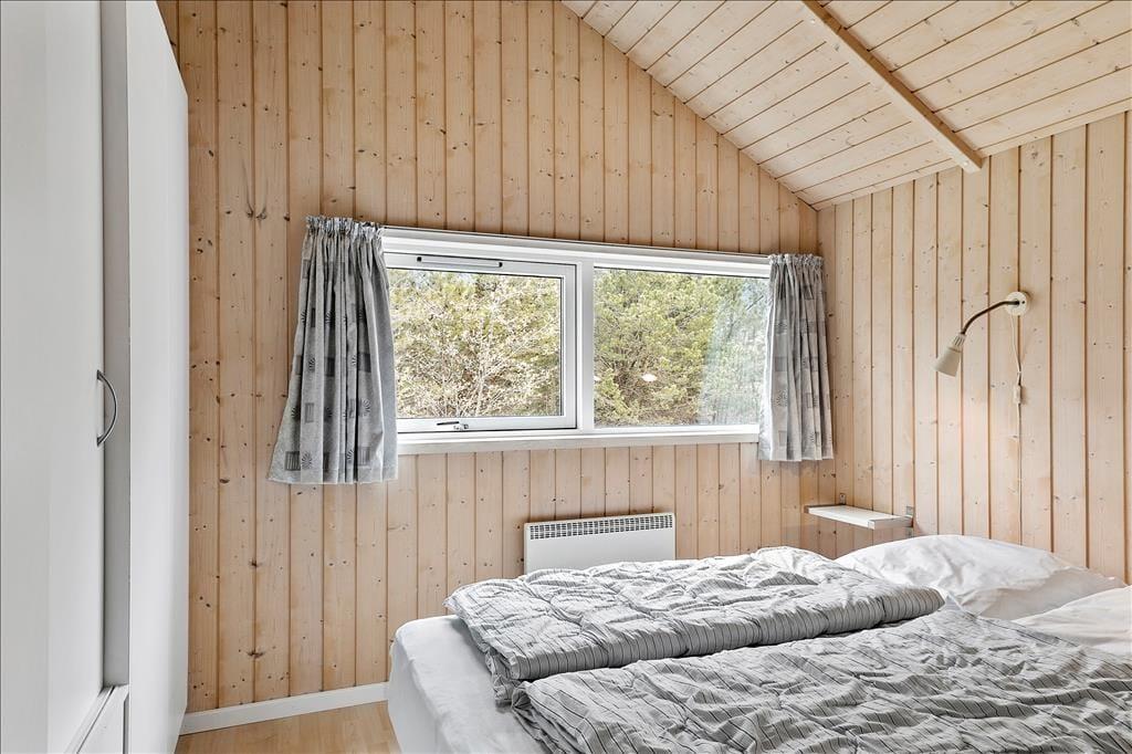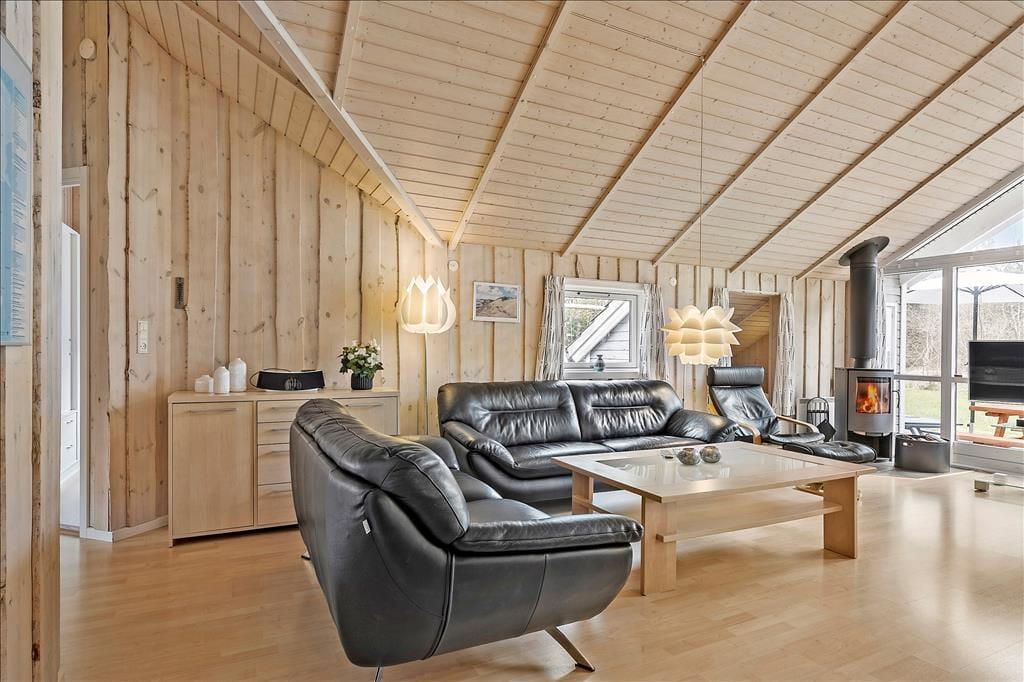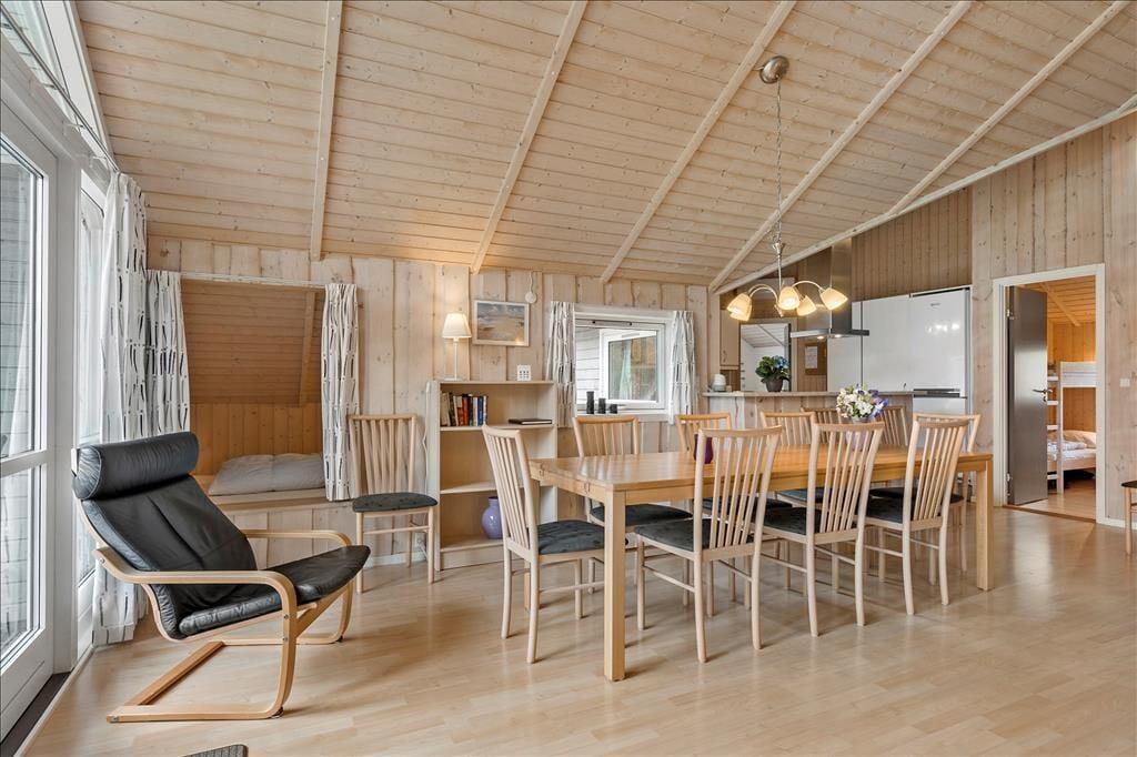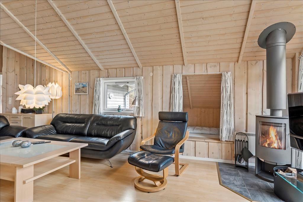 Lys, enkel og indbydende – sådan kan indretningen af sommerhuset, der er opført i 2008, helt kort beskrives. Og selvom der er hele 132 m2 at brede sig på, er den klassiske sommerhusatmosfære i top, for detaljer som lyse trævægge og loft til kip giver nemlig rummene et særdeles hyggeligt præg. Takket være de store vinduespartier får I glæde af dagslyset og udsigten til den grønne have, selvom I hygger jer inden døre nær stuens brændeovn. Netop stuen er et skønt opholdsrum med integreret køkkenafdeling, langbord, bløde siddemøbler, hems og endda to alkover. Sidstnævnte kan bruges som supplement til sommerhusets fire gode soveværelser, hvis I er mange samlet. På det praktiske plan er det rart, at der er to badeværelser i huset – og der er både spabad og sauna på det ene.