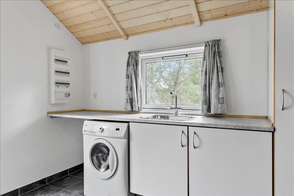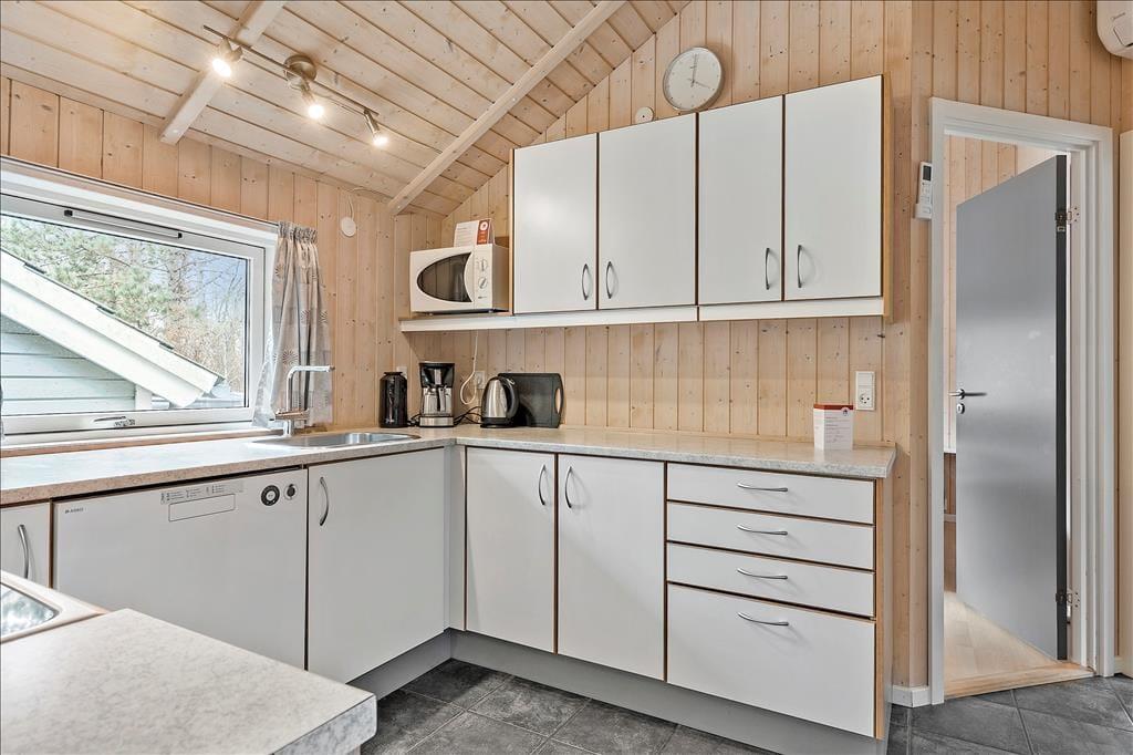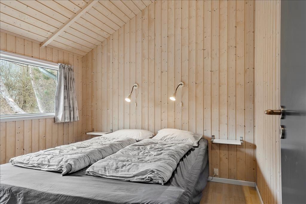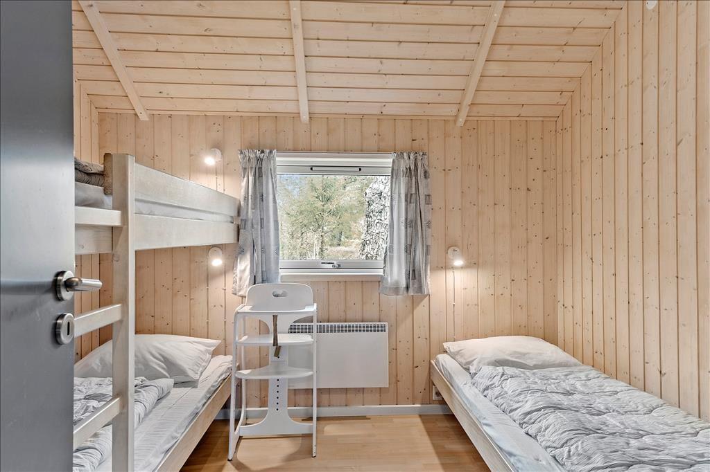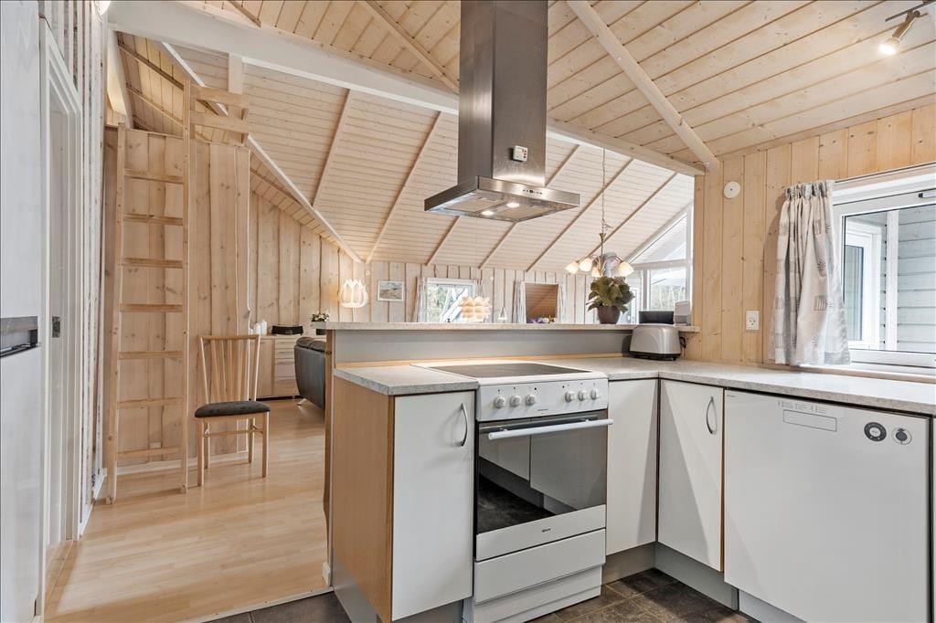 Lys, enkel og indbydende – sådan kan indretningen af sommerhuset, der er opført i 2008, helt kort beskrives. Og selvom der er hele 132 m2 at brede sig på, er den klassiske sommerhusatmosfære i top, for detaljer som lyse trævægge og loft til kip giver nemlig rummene et særdeles hyggeligt præg. Takket være de store vinduespartier får I glæde af dagslyset og udsigten til den grønne have, selvom I hygger jer inden døre nær stuens brændeovn. Netop stuen er et skønt opholdsrum med integreret køkkenafdeling, langbord, bløde siddemøbler, hems og endda to alkover. Sidstnævnte kan bruges som supplement til sommerhusets fire gode soveværelser, hvis I er mange samlet. På det praktiske plan er det rart, at der er to badeværelser i huset – og der er både spabad og sauna på det ene.