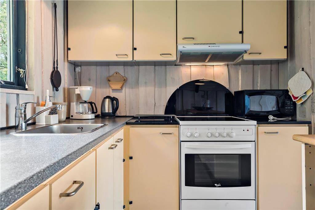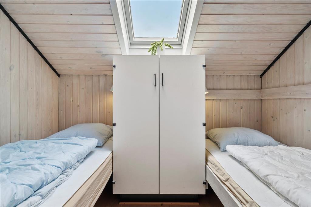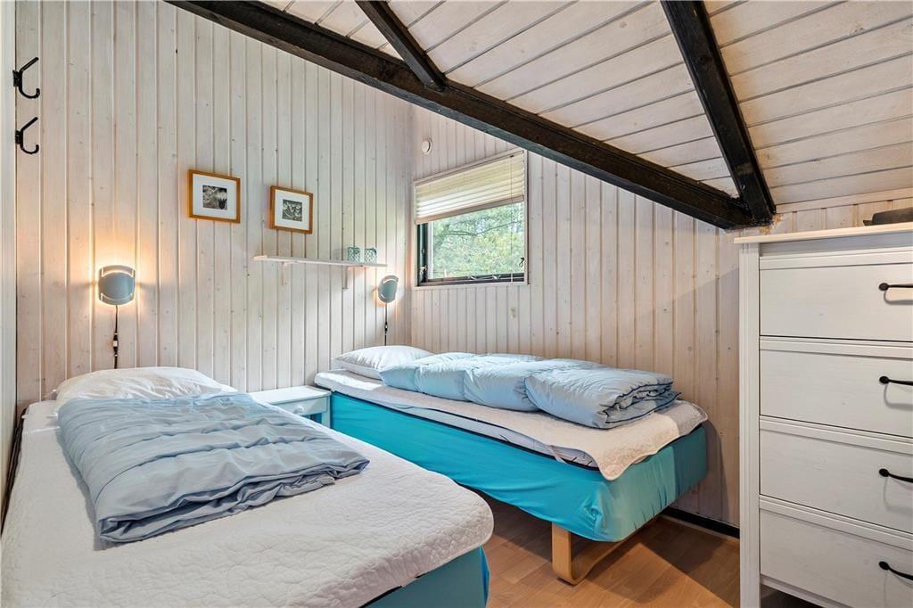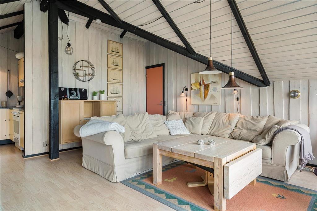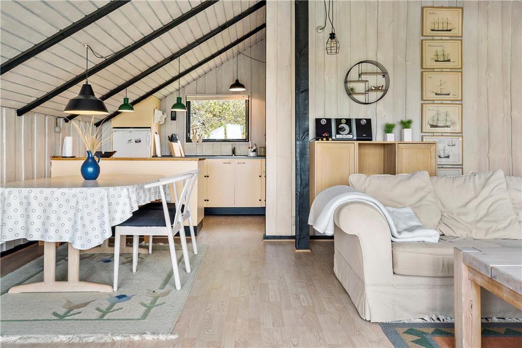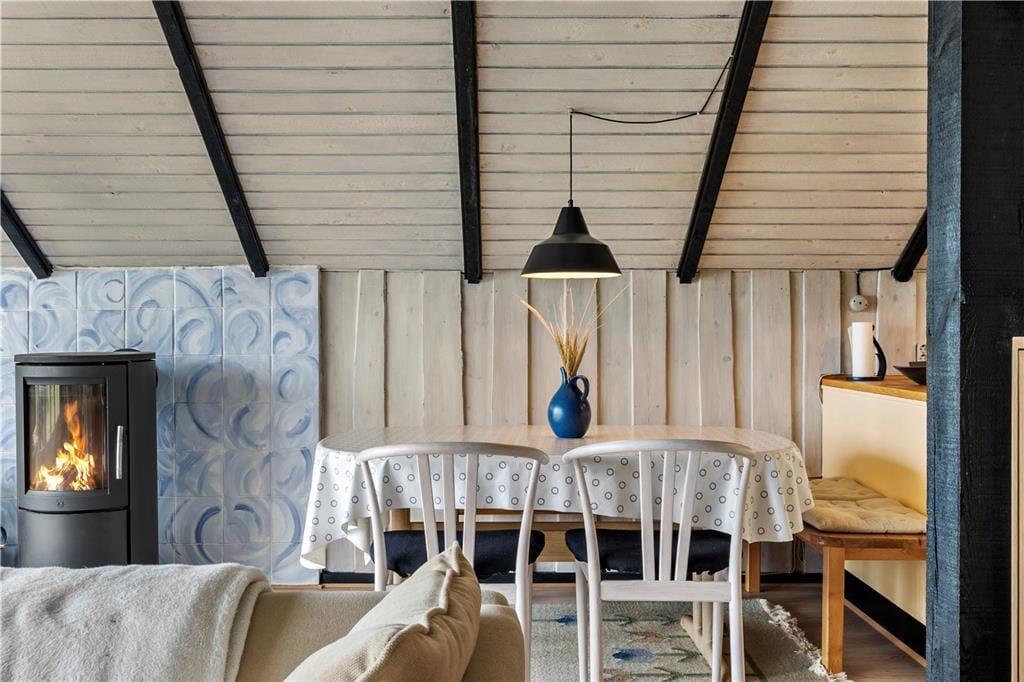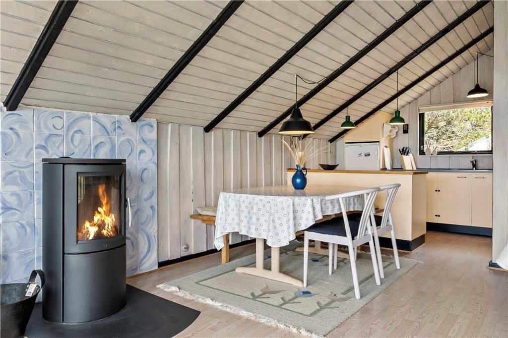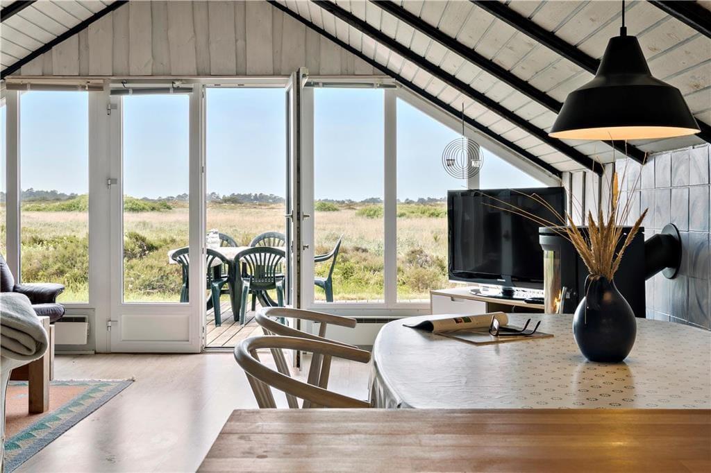 I stuen går det sydvestvendte gavlvindue fra væg til væg, så panoramaudsigten over det åbne landskab kan nydes i fulde drag, når I slapper af i den bløde hjørnesofa eller sidder samlet ved spisebordet. Med så stort et vinduesparti er lysindfaldet glimrende, og ikke mindst ved solnedgangstid får I en naturoplevelse udover det sædvanlige. Lysindfald og udsigt er bestemt ikke de eneste kvaliteter, for sommerhuset er nemlig et flot opdateret eksemplar med en hyggelig indretning og lækre detaljer – inklusive brændeovn og et integreret køkken i stuen samt sauna på badeværelset. To soveværelser hører også med til planløsningen, så i alt kan I være fire feriegæster i huset.