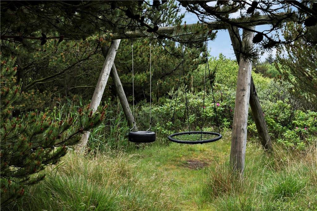 Fra stuen har I direkte adgang til et dejligt terrassemiljø, der breder sig syd og vest for sommerhuset. Her er udsigten selvfølgelig også imponerende, og med fuglesang og solskin fra oven er det et skønt sted at nyde ferielivet. På græsplænen er der god plads til at lege og spille havespil, og til de yngste familiemedlemmer er der sandkasse og gynger.