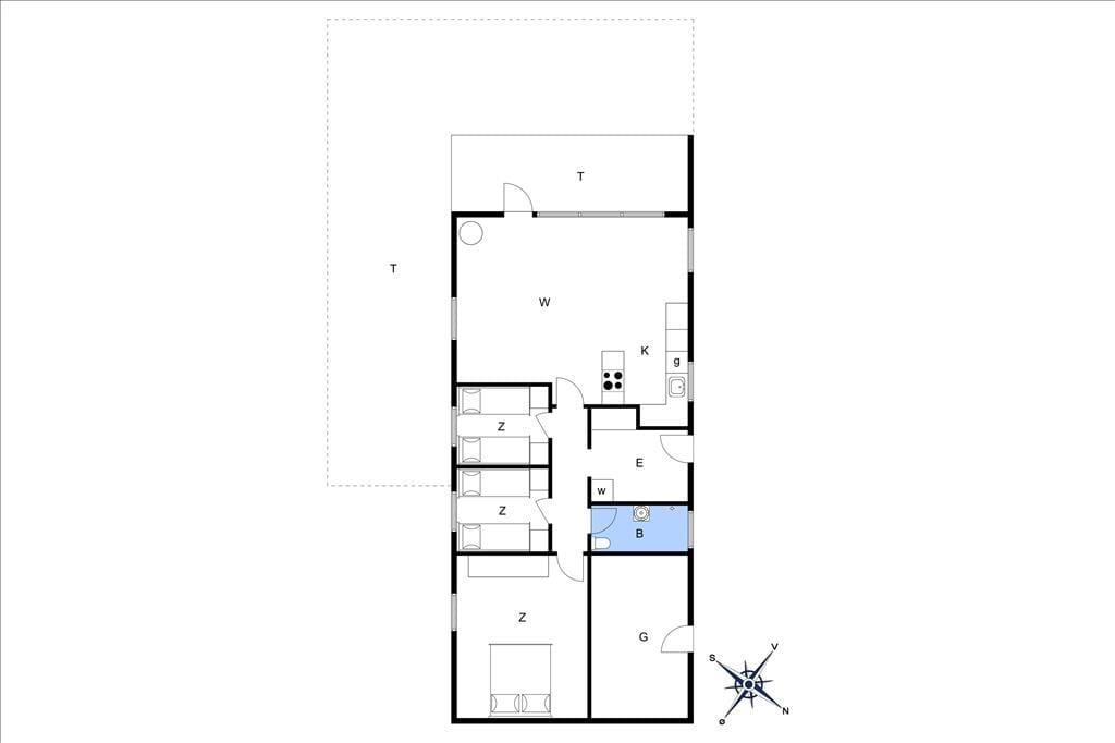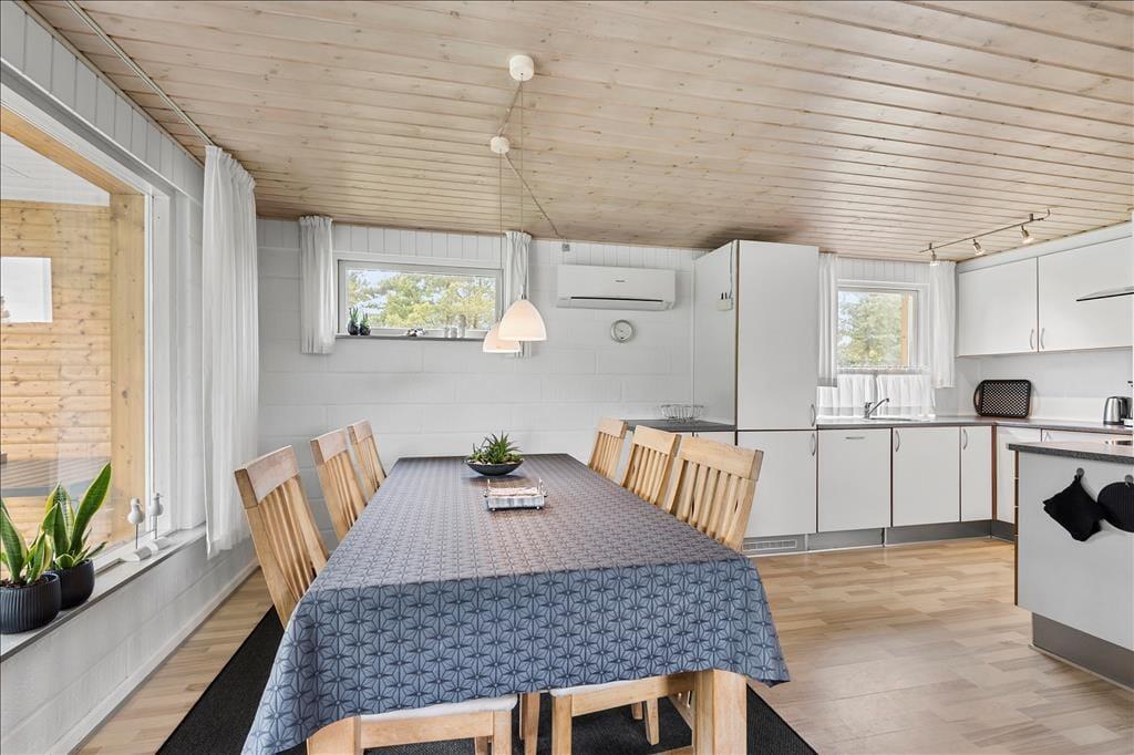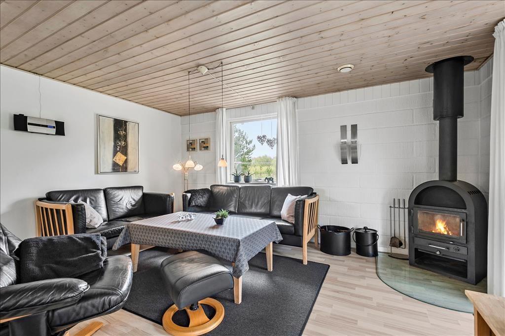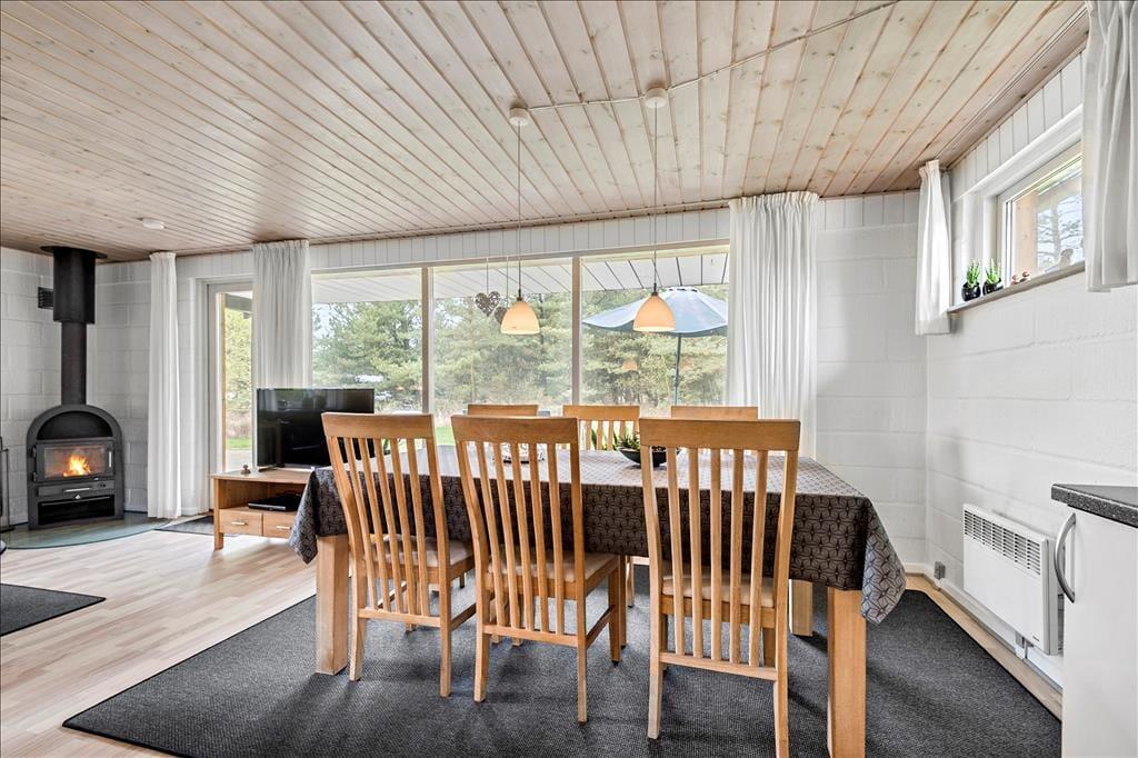 Sommerhuset har ligget her i Kongsmark siden 1970, men der er sket meget i mellemtiden, for i 2016 blev det renoveret og endda også tilbygget. I dag kan I derfor brede jer på 90 velindrettede kvadratmeter, der blandt andet rummer en stor entré med vaskemaskine, et badeværelse med bruseniche samt tre gode soveværelser. I alt er der plads til seks feriegæster, for to af soverummene byder hver især på to enkeltsenge, mens det tredje og største soveværelse er udstyret med en dobbeltseng. Når I vil tilbringe tiden sammen, er det oplagt at mødes i den dejlige stue, hvor I kan slå jer ned ved spisebordet eller hygge jer i sofaafdelingen nær brændeovnen. Sommerhusets køkken ligger som en integreret del af stuen, så madlavningen kan sagtens indgå i de fælles ferieaktiviteter.
