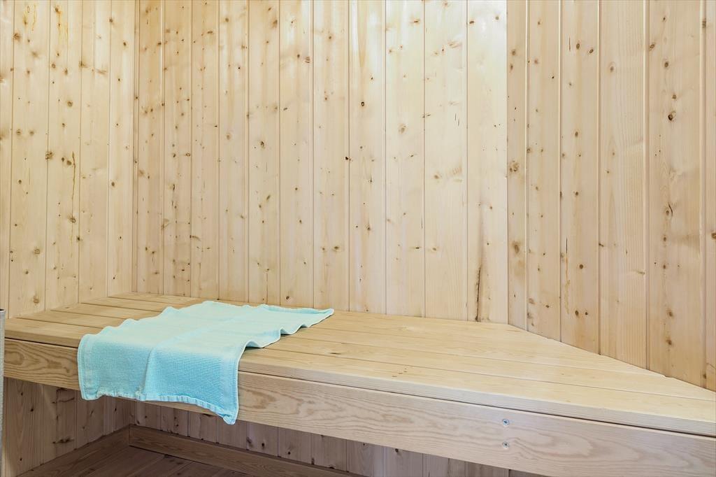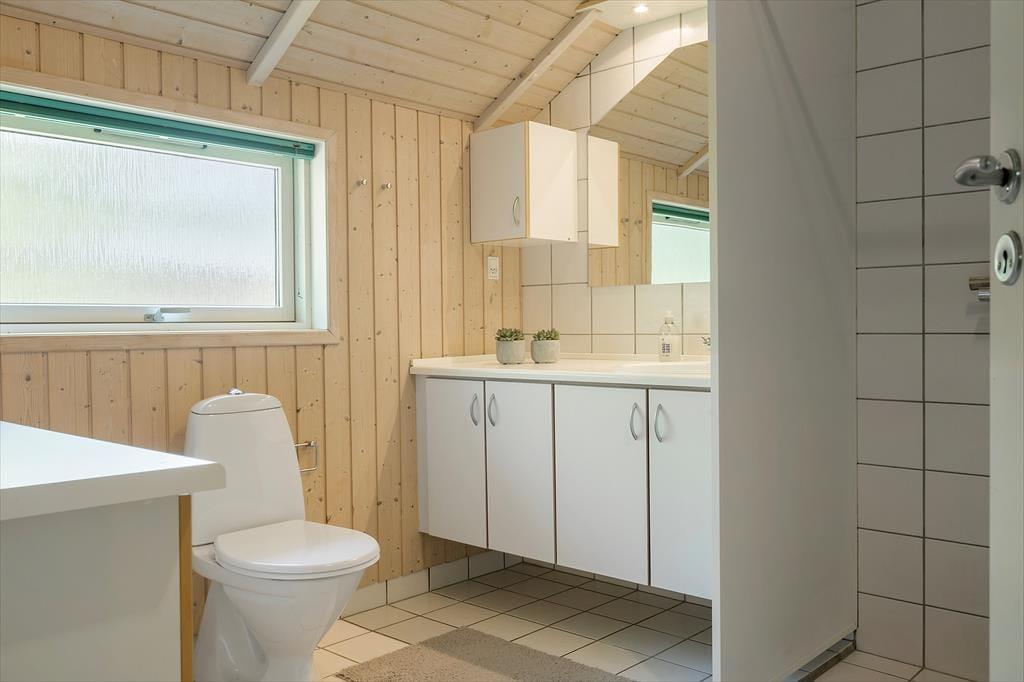Sommerhuset har ligget her på den skønne adresse siden 2001, og ligger med en flot kontrast midt i alt det grønne med sin malede træfacade. Inden døre er der loft til kip og lys træbeklædning på væggene, og møblementet er nøje udvalgt, så det passer godt ind i rummene. Når du står og brygger kaffe i køkkenet, kan du takket være den åbne forbindelse til stuen sagtens følge med i børnenes leg eller hyggesnakke med din bedre halvdel. Brændeovnen er en af stuens hyggelige detaljer, og det er for øvrigt også herligt, at der er sauna på badeværelset, hvis du trænger til at slappe helt af efter dagens udendørs aktiviteter. Ved entréen finder du et gæstetoilet, og på de tre soveværelser er der alt i alt plads til syv feriegæster.