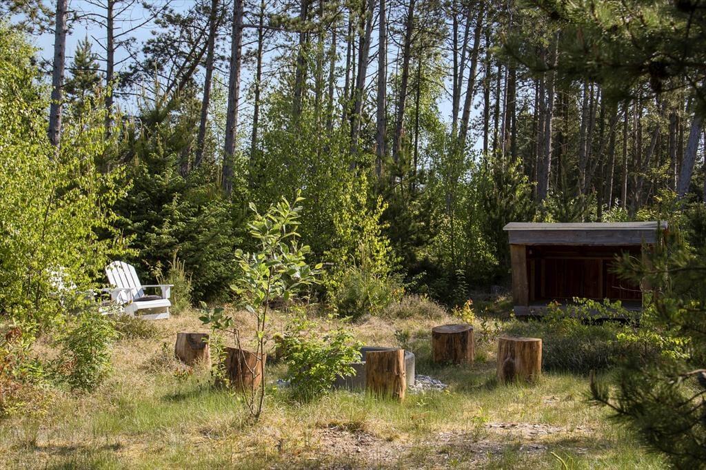 Fra opholdsafdelingen har du direkte adgang til en 115 m2 stor og solrig træterrasse, så hvis du vil have avisen og en kop kaffe med ud i det fri, er det nemt at komme ud. Det er fristende at blive i timevis i liggestolene, og man kan jo flytte efter solen hele dagen. Men der er nu også meget andet skønt at tage sig til på naturgrunden, der er en stor og skøn oase med en velholdt græsplæne og mere viltre områder. Børnene kan hygge sig med at gynge og bygge slotte i sandkassen, og shelteret er også et hyggeligt sted at lege for de mindste – hvis ikke I ligefrem bliver fristet til at sove herude på de stille aftner, hvor I har hygget jer omkring bålet og nydt godnatsangene fra områdets vilde fugle. Shelteret er udstyret med myggenet.