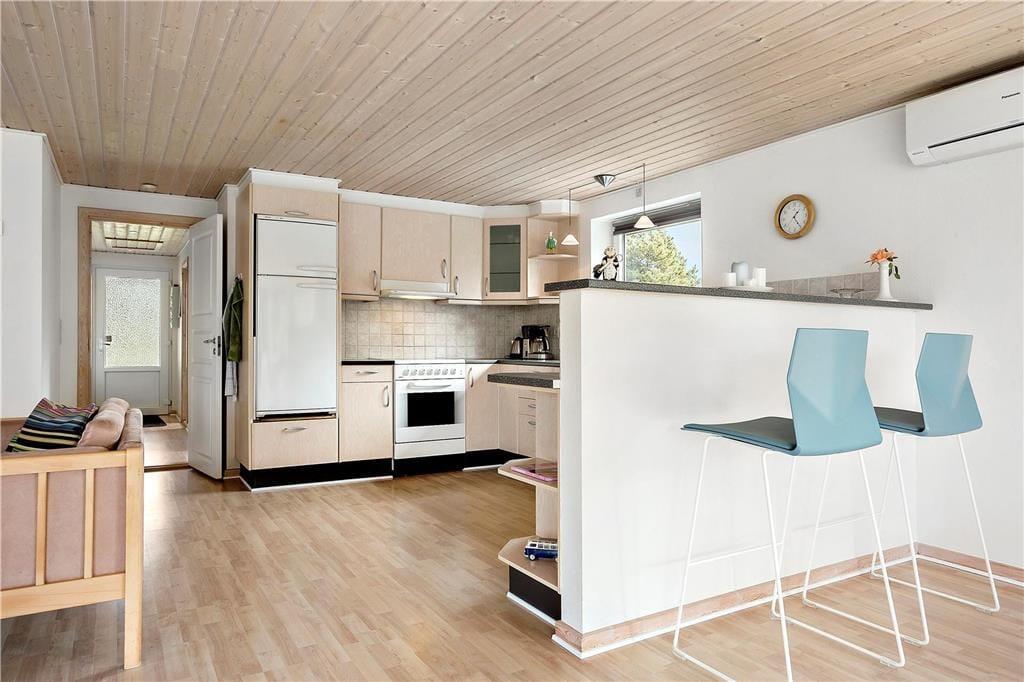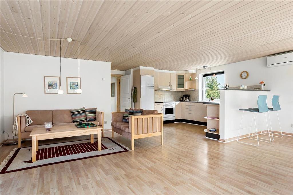 Det klassiske træsommerhus er opført i 1973, og takket være omsorgsfuld renovering fremstår det velplejet og indbydende. For eksempel er et dejligt nyere badeværelse med gulvvarme del af planløsningen, og tre gode soveværelser sørger for, at seks feriegæster kan sove trygt og godt i sommerhuset. En stor del af kvadratmeterne er dog dedikeret til en særdeles stor stue med integreret køkkenafdeling. Det er et skønt opholdsrum, hvor I kan sætte jer godt til rette i de bløde siddemøbler, hygge nær brændeovnen og nyde et godt måltid mad ved spisebordet. Takket være rummets mange vinduer kan I nyde det dejlige lysindfald fra tre verdenshjørner og på samme tid beundre de grønne omgivelser.