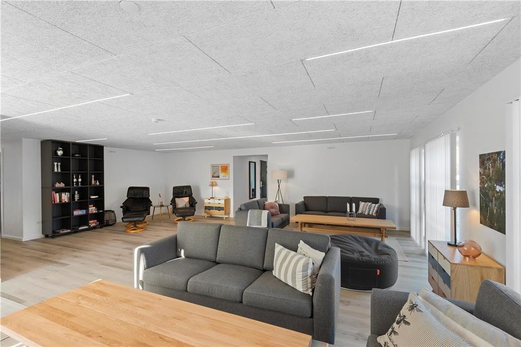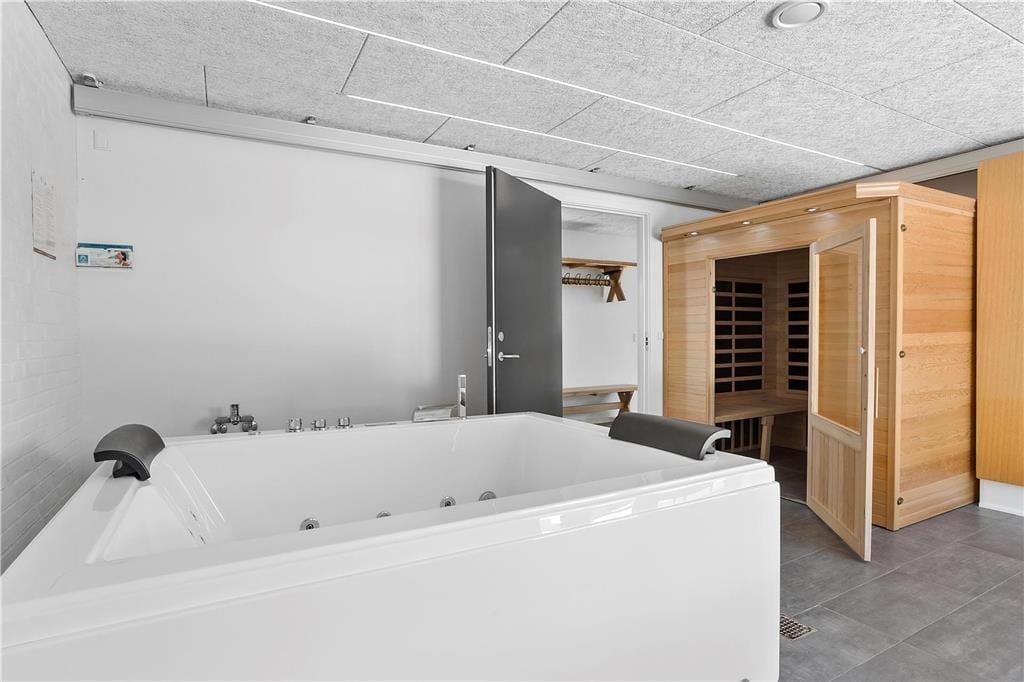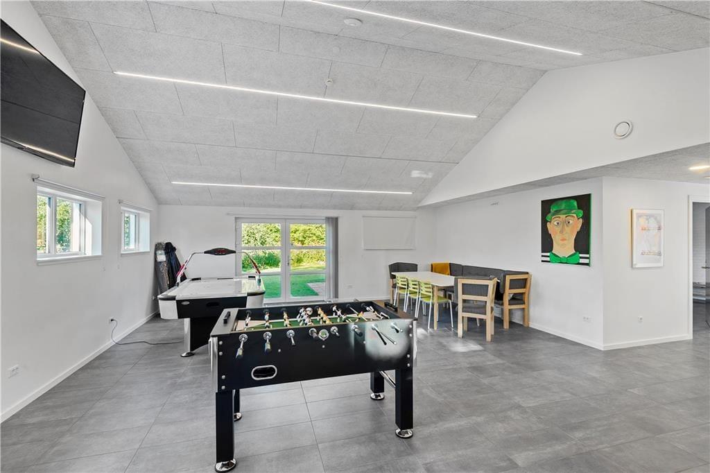 Når man er mange mennesker afsted på ferie sammen, er det ikke altid, at alle har lyst til det samme. Her byder huset på hele tre opholdsrum – et køkkenalrum, hvor man kan spille spil ved de store spiseborde, en opholdsstue med to sofagrupper og flere hyggekroge, hvis man vil trække sig lidt tilbage, samt et aktivitetsrum med bl.a. bordfodbold og sauna.