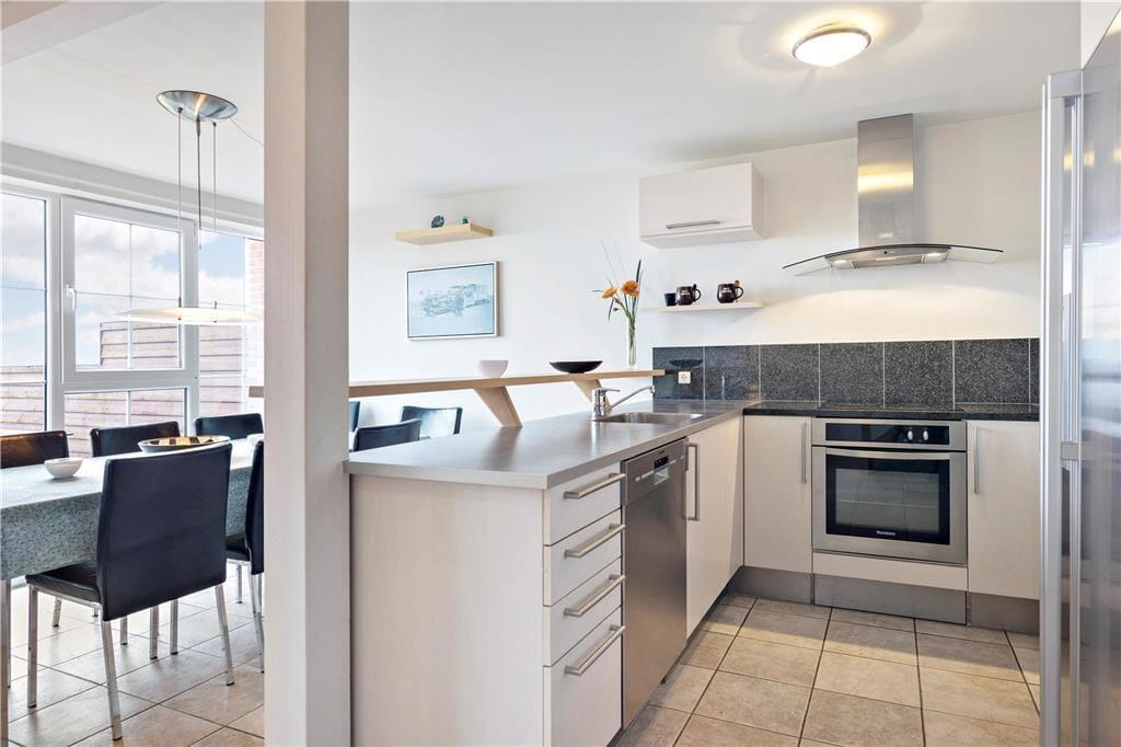 Med stråtag og rød murstensfacade kan rækkehuset oplagt beskrives som et moderne byggeri med en klassisk fremtoning. Opførelsesåret er 2005, og som et vaskeægte kvalitetsbyggeri er huset indrettet med smagfuldt og komfortabelt interiør i både stueetagen og på førstesalen. Det veludstyrede køkken og de to badeværelser – hvoraf det ene er udstyret med et dejligt spabad – er tydelige eksempler på husets høje klasse, og så er der for øvrigt gulvvarme i det meste af stueplan som en mindre synlig, men bekvem detalje. Tre gode soveværelser, som i alt kan rumme seks personer, er praktisk fordelt på begge etager, og derudover er der plads til to ekstra feriegæster på hemsen helt i husets top. Førstesalen byder desuden på en dejlig opholdsstue med fladskærms-TV og brændeovn, og ikke bare herfra, men også fra stueplanens køkken-alrum kan du nyde den vidunderlige vadehavsudsigt.