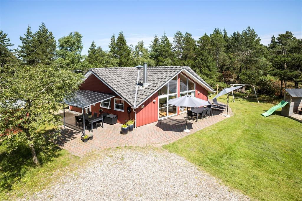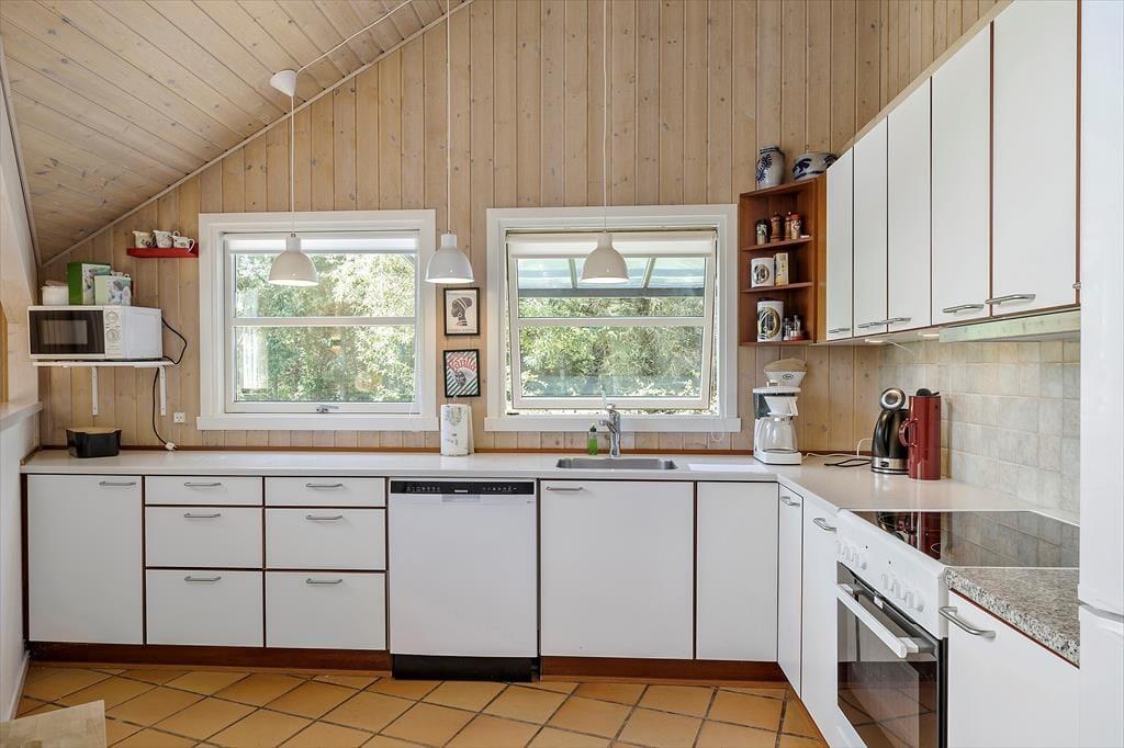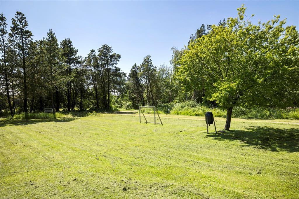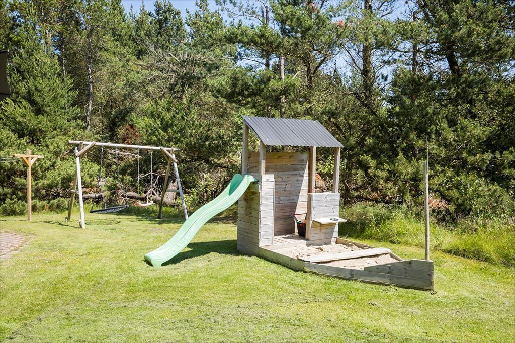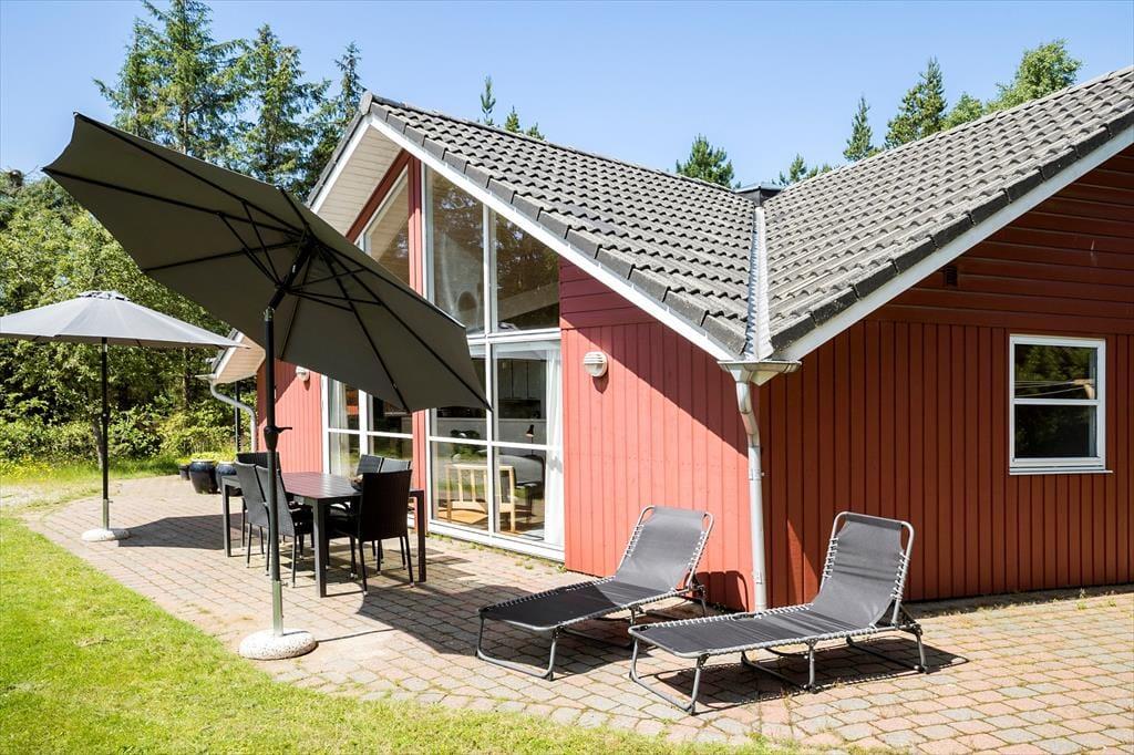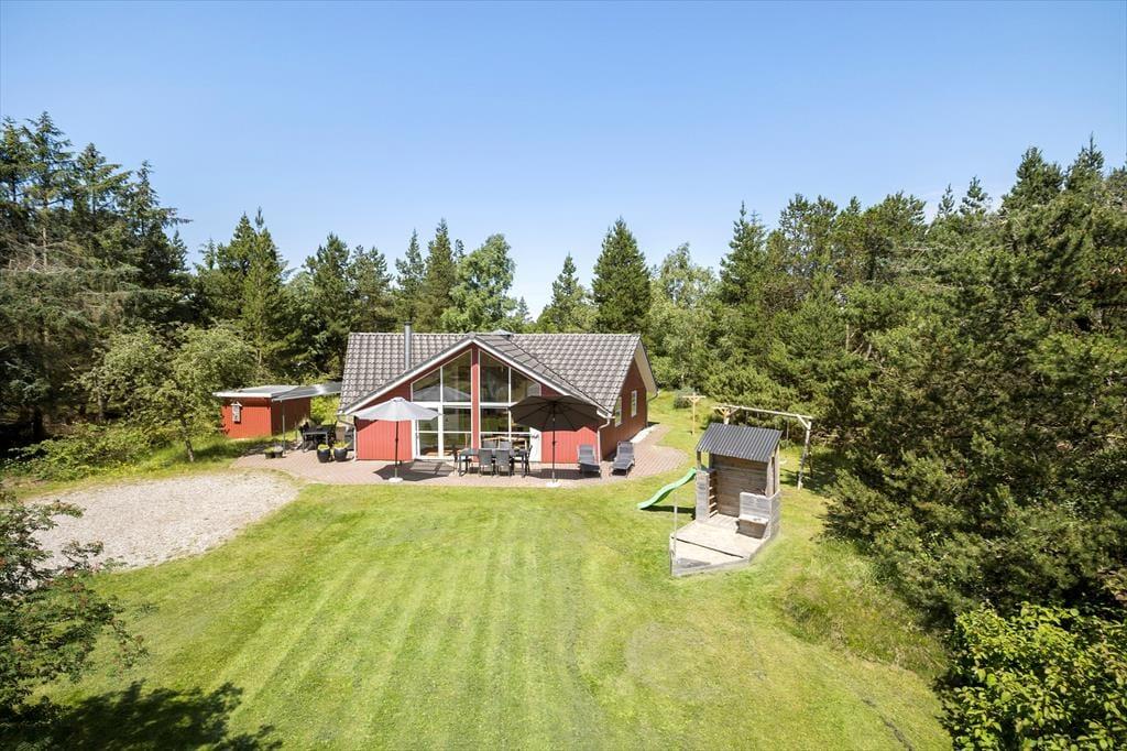 På den 2650 m2 store naturgrund er der afskærmende randbeplantning og en grusbelagt indkørsel, og en velanlagt græsplæne indbyder til vandkamp, frisbee og fodbold. Børnene kan også hygge sig med at gynge, rutsje og lege i den bådformede sandkasse, og når I alle vil samles til en god frokost eller et lækkert aftensmåltid tilberedt på grillen, kan I slå jer ned på en af terrasserne. Flisebelægningen breder sig rundt om sommerhuset, så der er flere dejlige steder at sidde – inklusiv et overdækket areal, hvis du drømmer om at sidde længe ude om aftenen, mens tusmørket langsomt breder sig.