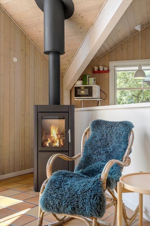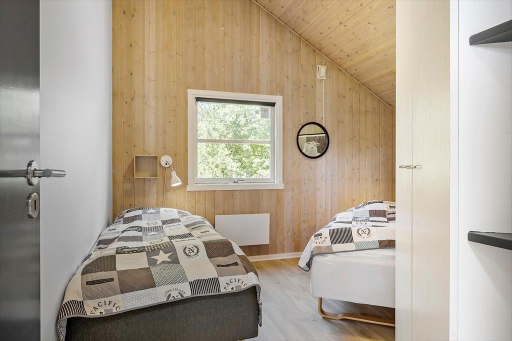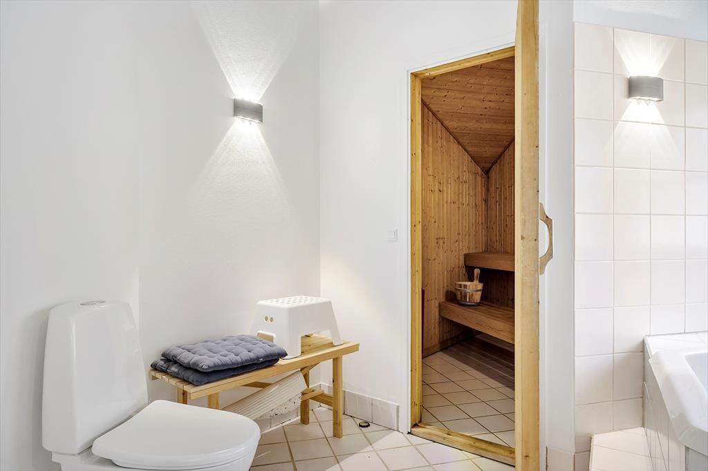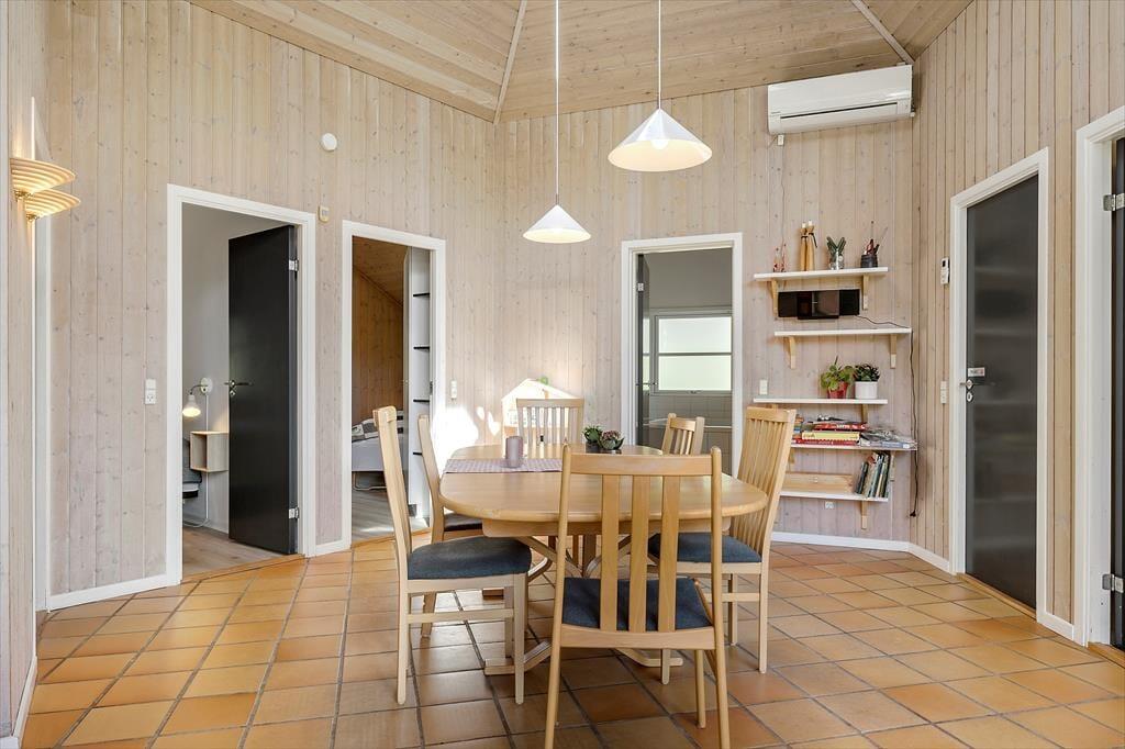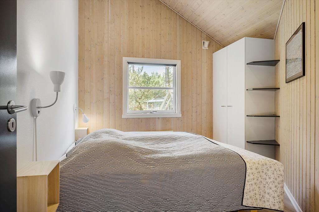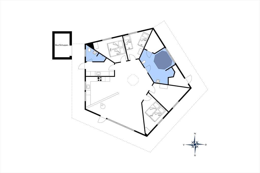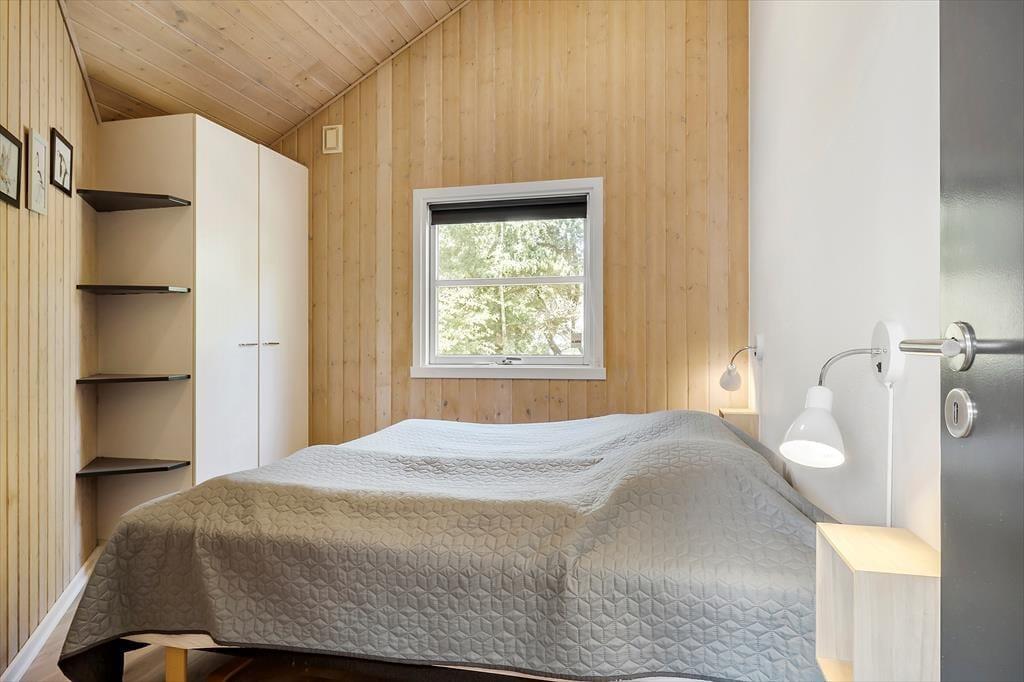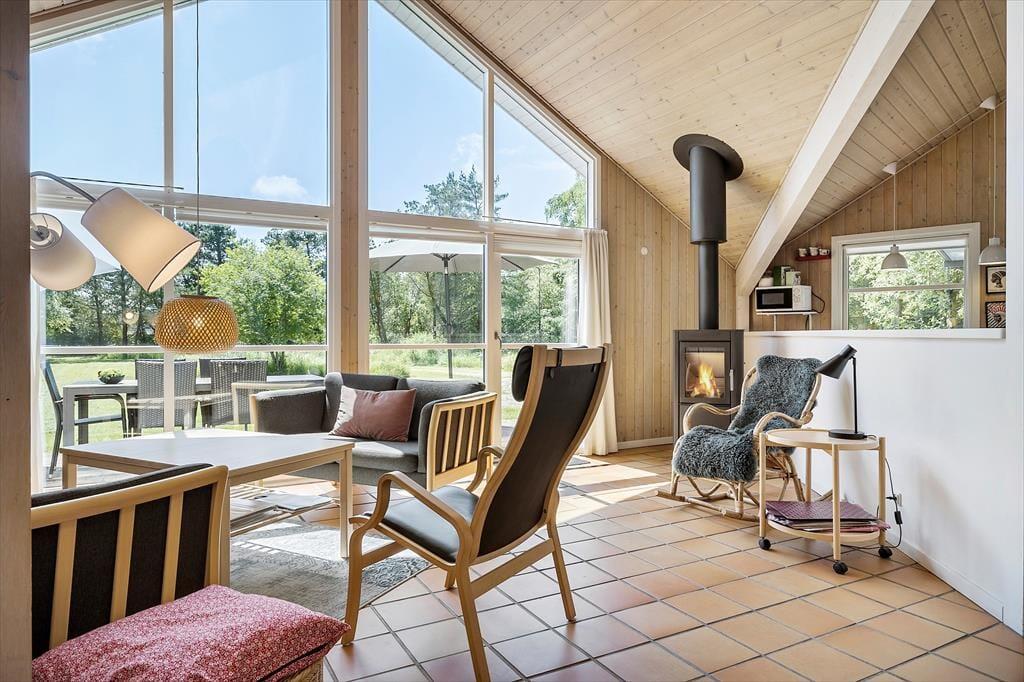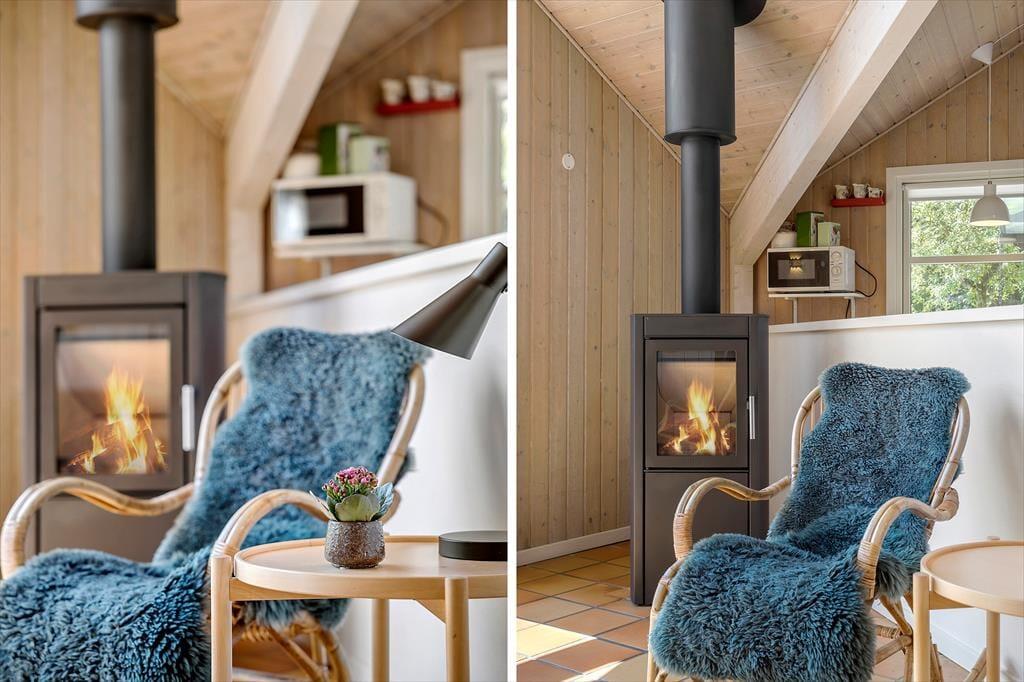 Ved første øjekast kunne sommerhuset se helt klassisk ud med sin rødmalede træfacade og sine hvide vinduer, men hvis du bemærker planløsningen, har det en atypisk femkantet form. Det har selvfølgelig også en effekt inden døre, hvor væggenes skæve vinkler og kiploftet giver rummene en særligt hyggelig atmosfære. Der er tre gode soveværelser med sengepladser til seks personer, og det største af de to badeværelser er på lækker vis udstyret med både spabad og sauna. Når du ikke kobler af her, er det herligt at sidde i stuen, der byder på en brændeovn, stilfuldt møblement og store vinduer, der inviterer generøse mængder af dagslys indenfor. Et tosidet køkken er integreret i rummet, så madlavningen kan nemt indgå i feriens fælles hyggeprojekter.