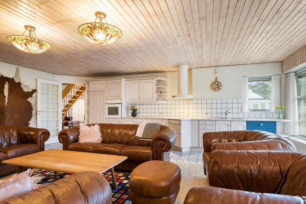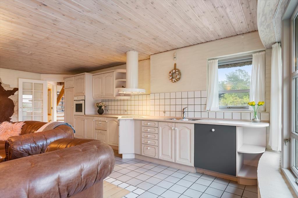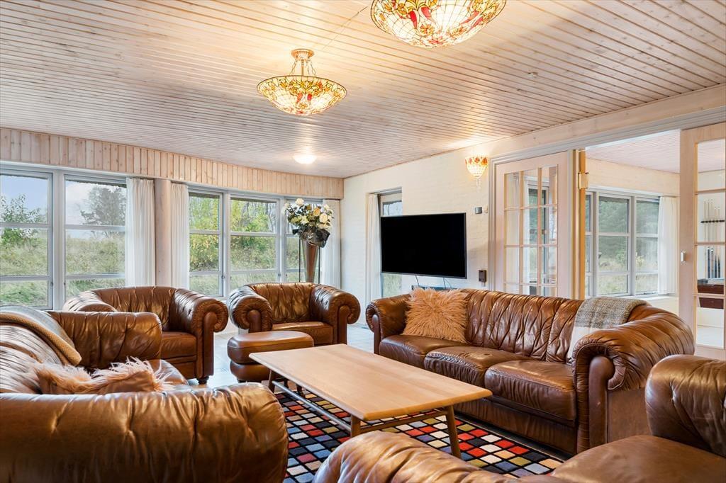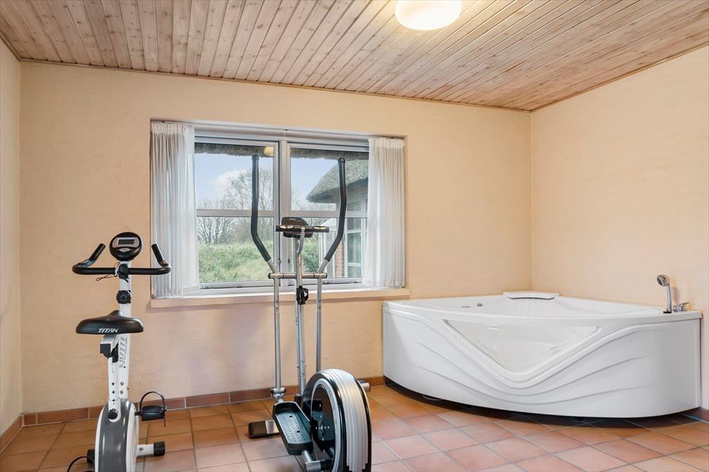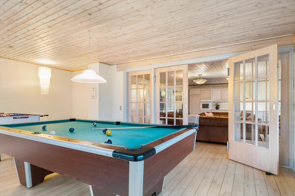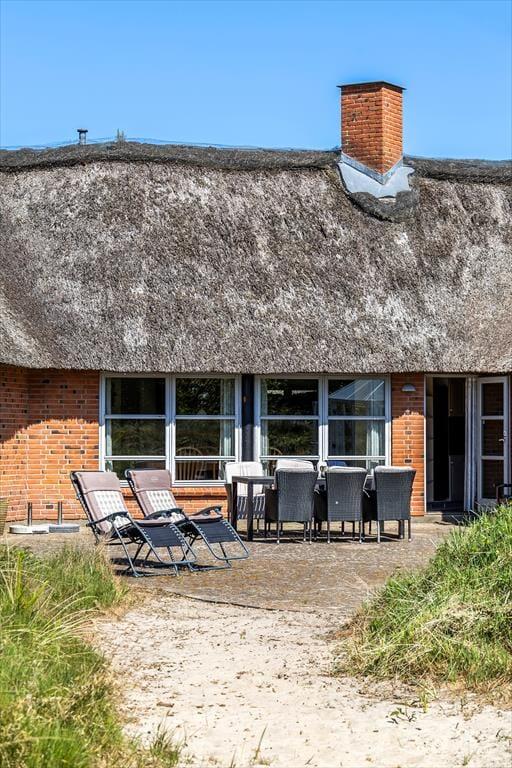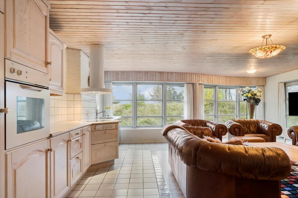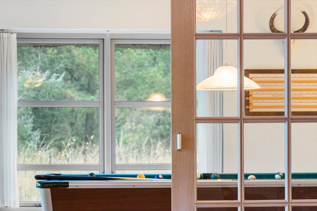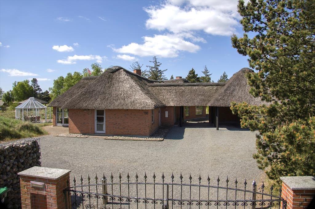Huset er opført i 1996 og tager sig flot og indbydende ud med rødstensfacade, stråtag og hvide sprossevinduer. Det gode førstehåndsindtryk fortsætter, når du træder indenfor i ferieboligen, hvor pladsen er særdeles generøs. De sammenhængende opholdsrum sætter en dejlig ramme om det hyggelige samvær på ferieturen, og du kan sidde og nyde den omgivende natur gennem de store vinduespartier. Bemærk desuden, at der er udgang til terrasser og have fra alle husets opholdsrum. Der er to soveværelser i stueplan, mens de øvrige to er placeret på førstesalen. Huset er som noget helt særligt udstyret med to køkkener, og med tre badeværelser – det ene med sauna og et wellnessrum med spabad og motionsudstyr – er der skruet ekstra op for velværefaktoren. Du får også et aktivitetsrum med poolbord og bordfodbold.