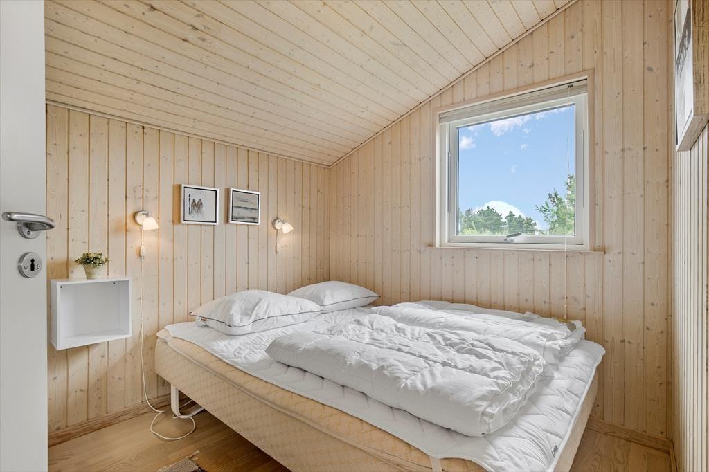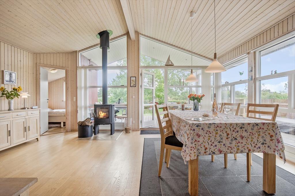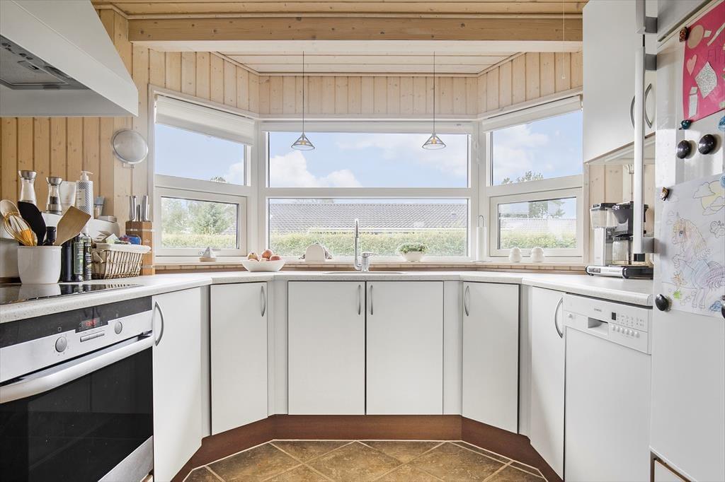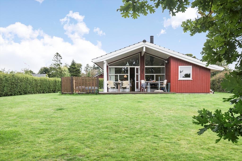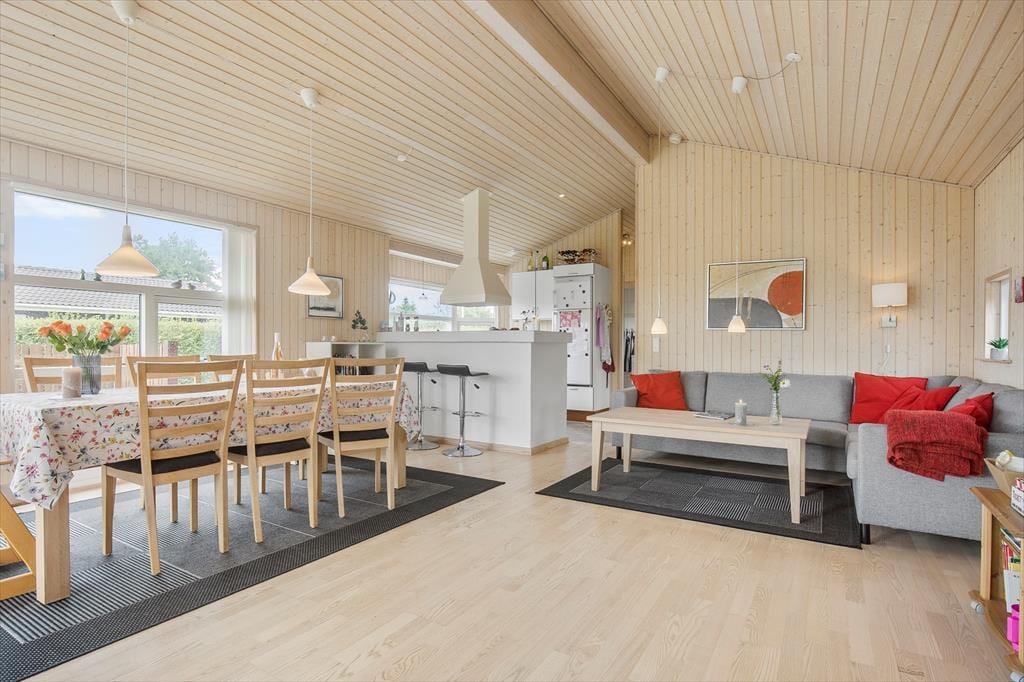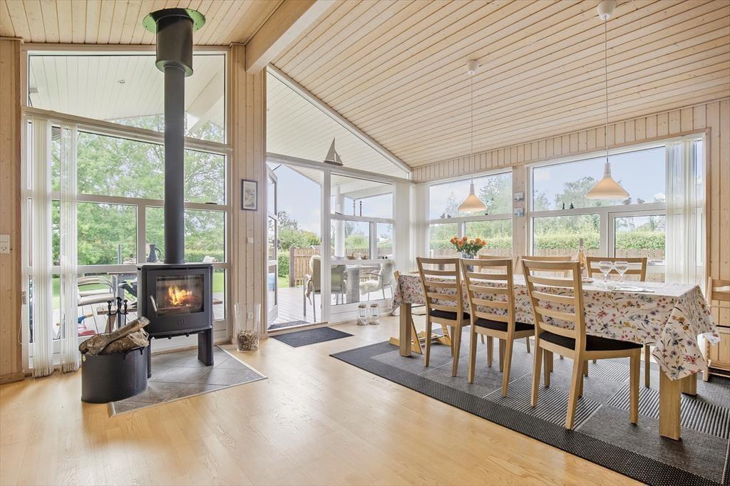 Feriehuset indeholder kombineret køkken og opholdsstue. Køkken med indbygget ovn, kogeplader, opvaskemaskine og køleskab med fryser. Opholdsstue med loft til kip, store vinduespartier som giver masser af lys i huset. Udgang til stor delvis overdækket terrasse, god spiseplads, brændeovn og TV med youSee tv pakke med danske, tyske, svenske og norske kanaler. Badeværelse med bruseniche og gulvvarme. Tre soveværelser, alle med dobbeltsenge. Der er desuden både barneseng og barnestol til rådighed. Huset opvarmes med varmepumpe, brændeovn og elvarme.