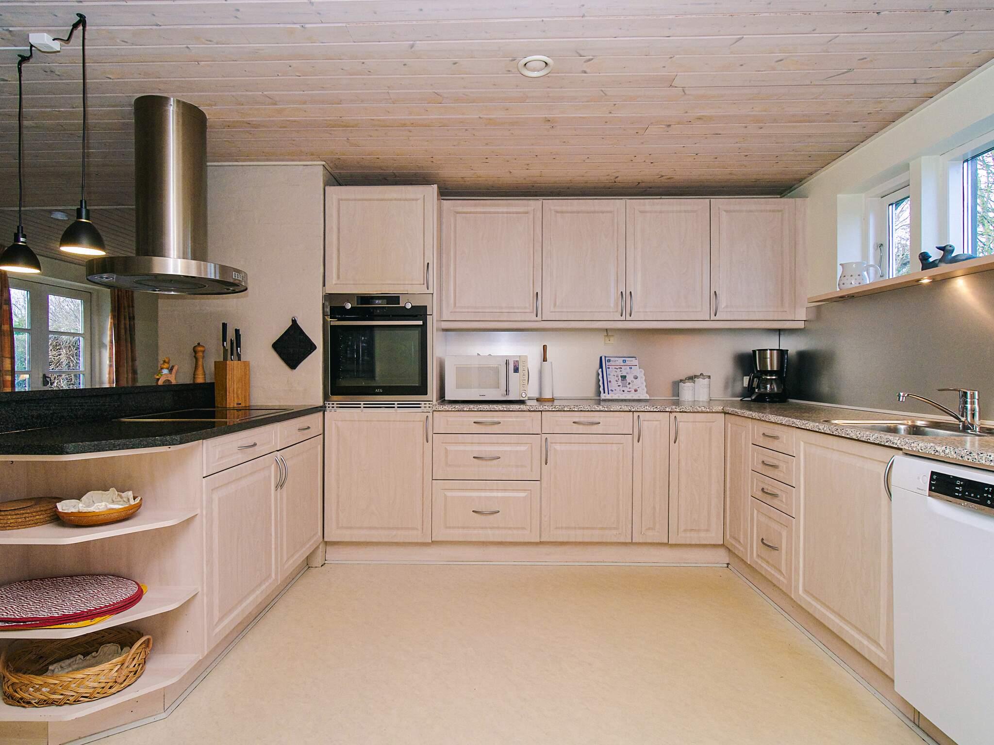 Dette lyse og rummelige feriehus på 109 m² ligger i et fredeligt, lukket sommerhusområde kun 400 meter fra stranden. Interiøret er præget af store, lyse opholdsrum, der er designet til afslapning for hele familien, hvor I kan slappe af med en film eller samles omkring den hyggelige brændeovn. Det moderne, velindrettede køkken åbner direkte ud til en rummelig spiseplads, der skaber et socialt samlingspunkt for hele familien. Praktiske funktioner som gulvvarme i badeværelset og et separat bryggers med vaskemaskine og tørretumbler sikrer et behageligt og problemfrit ophold.