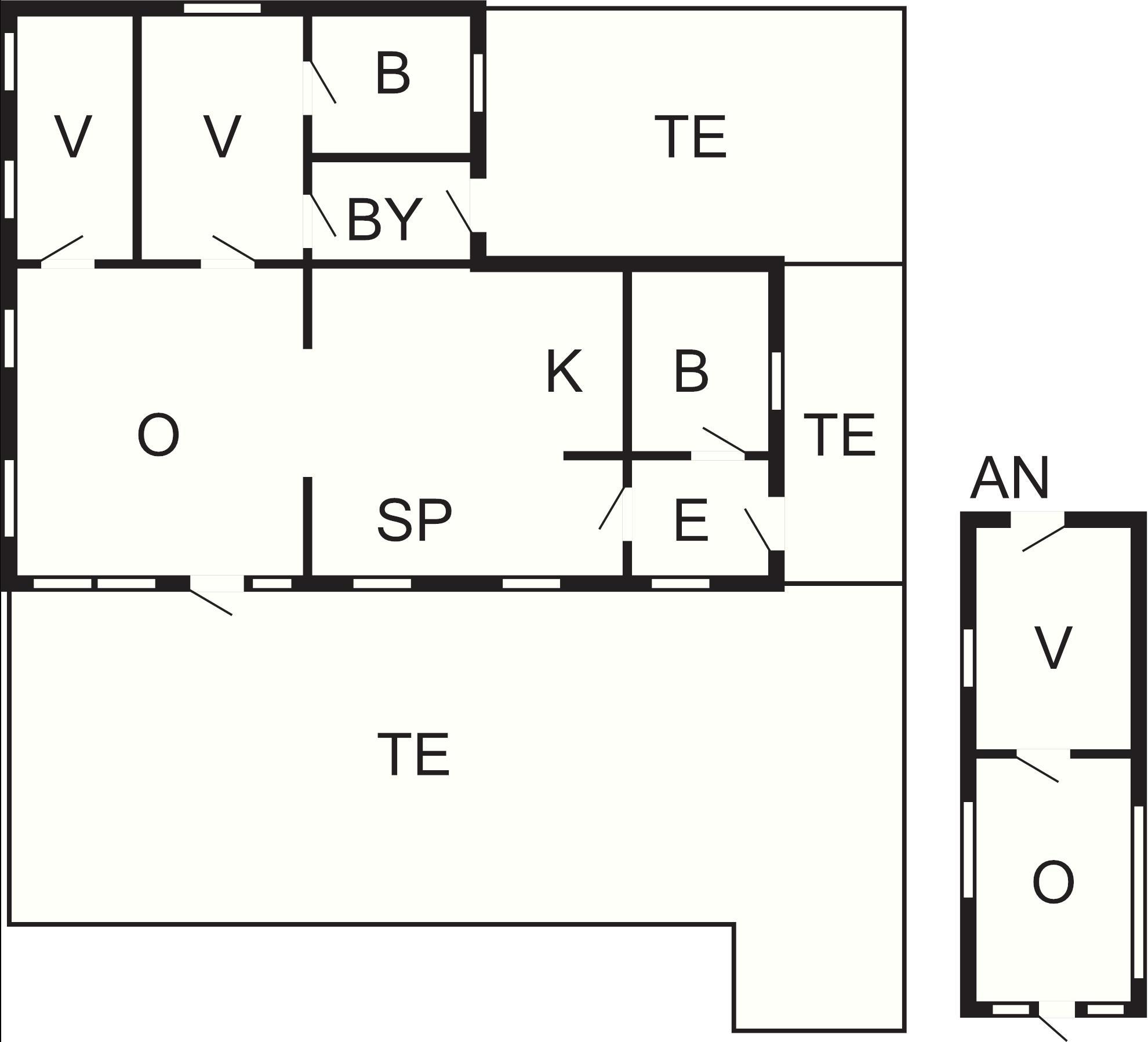 Feriehuset har to soveværelser med hver to senge samt et separat anneks med to enkeltsenge og et lille sofarum med køleskab og stor glasfront, hvorfra man kan nyde udsigten over markerne. Annekset ligger lige overfor selve ferieboligen og har nem adgang til eget badeværelse i huset.