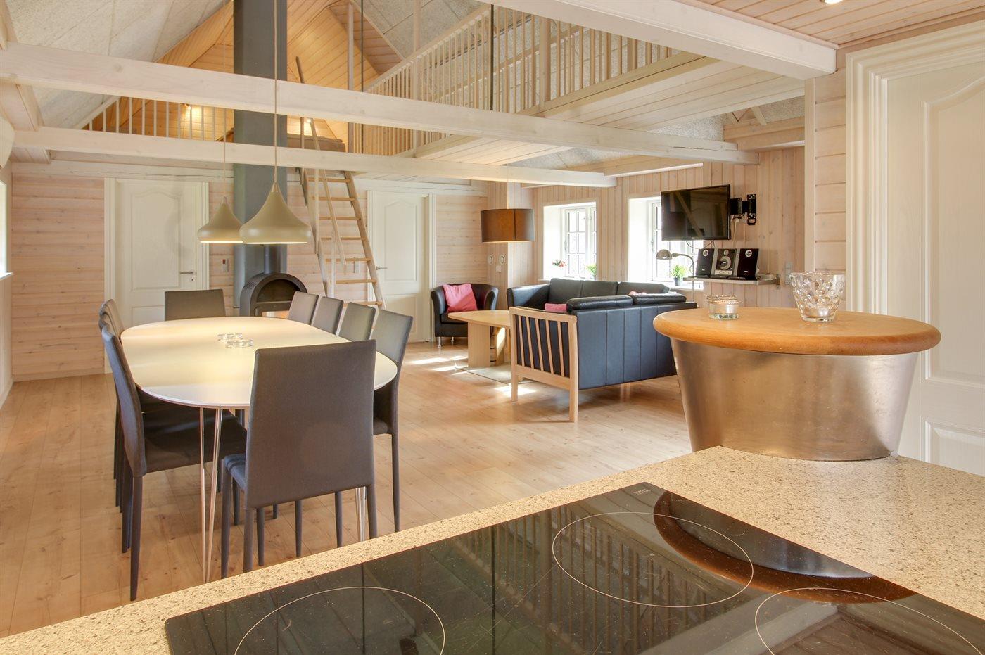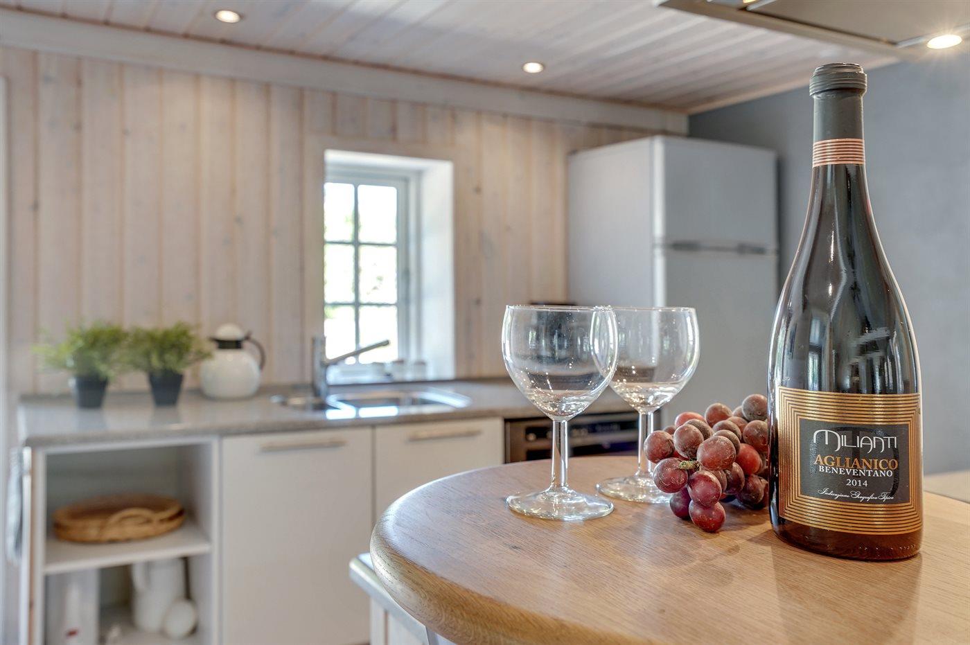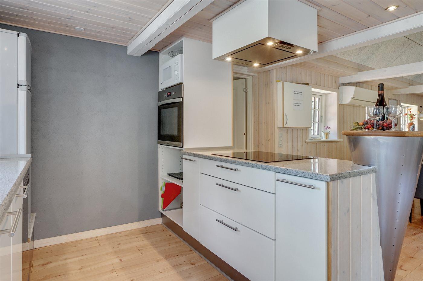Køkkenet er udstyret med 1 køleskab. Der er 4 keramiske kogeplader, bageovn, mikrobølgeovn samt opvaskemaskine.