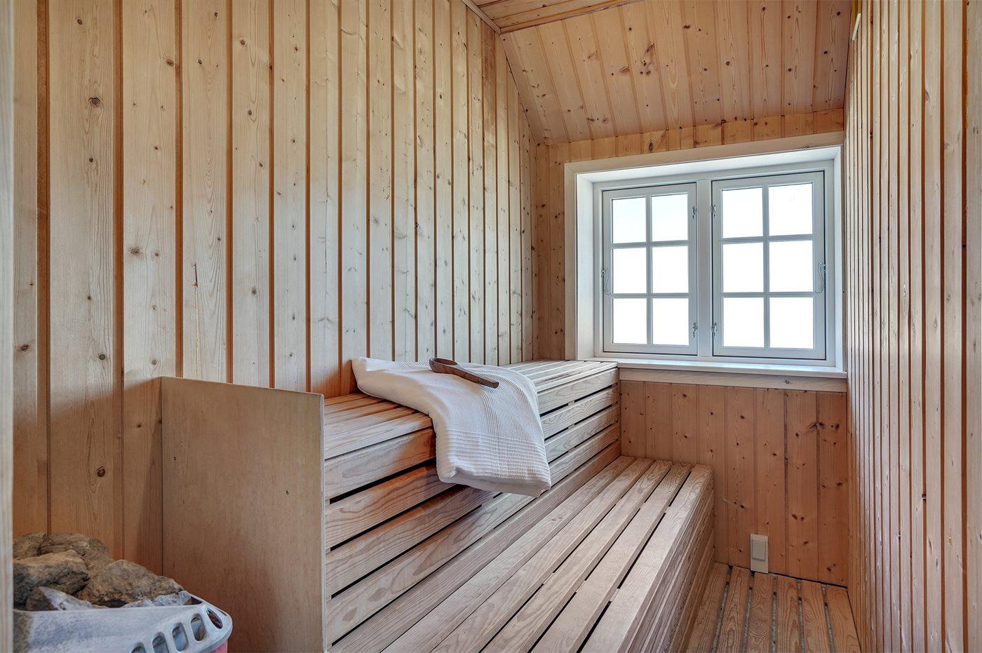 Der er 1 badeværelse med bruser og 1 toilet.. Der er gulvvarme på 1 badeværelse. I saunaen er der mulighed for afslapning.