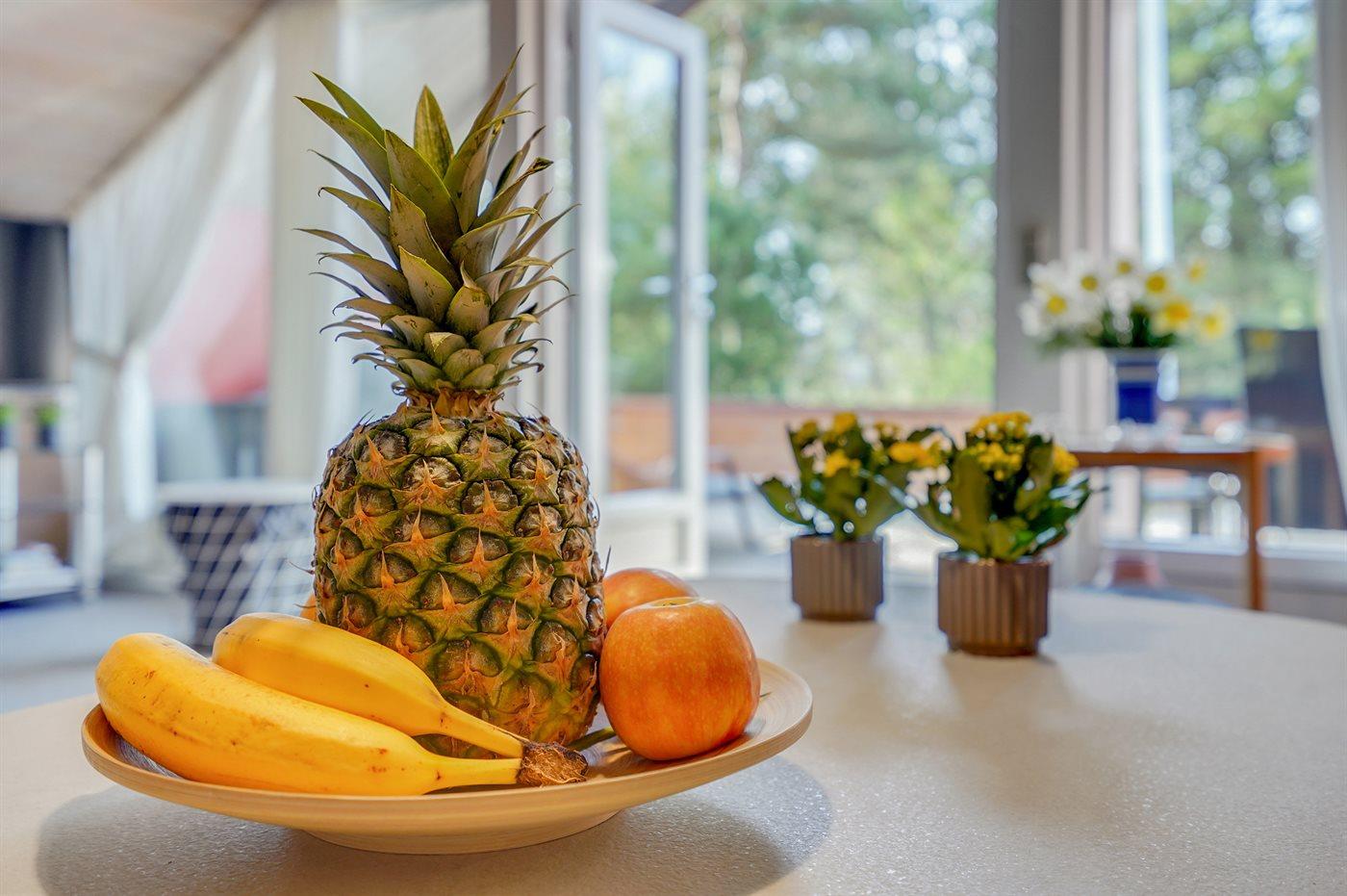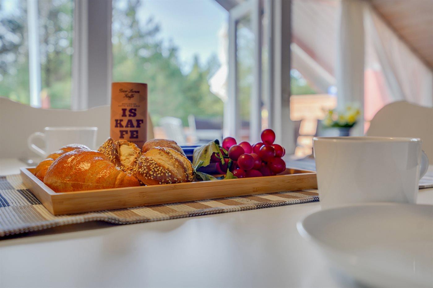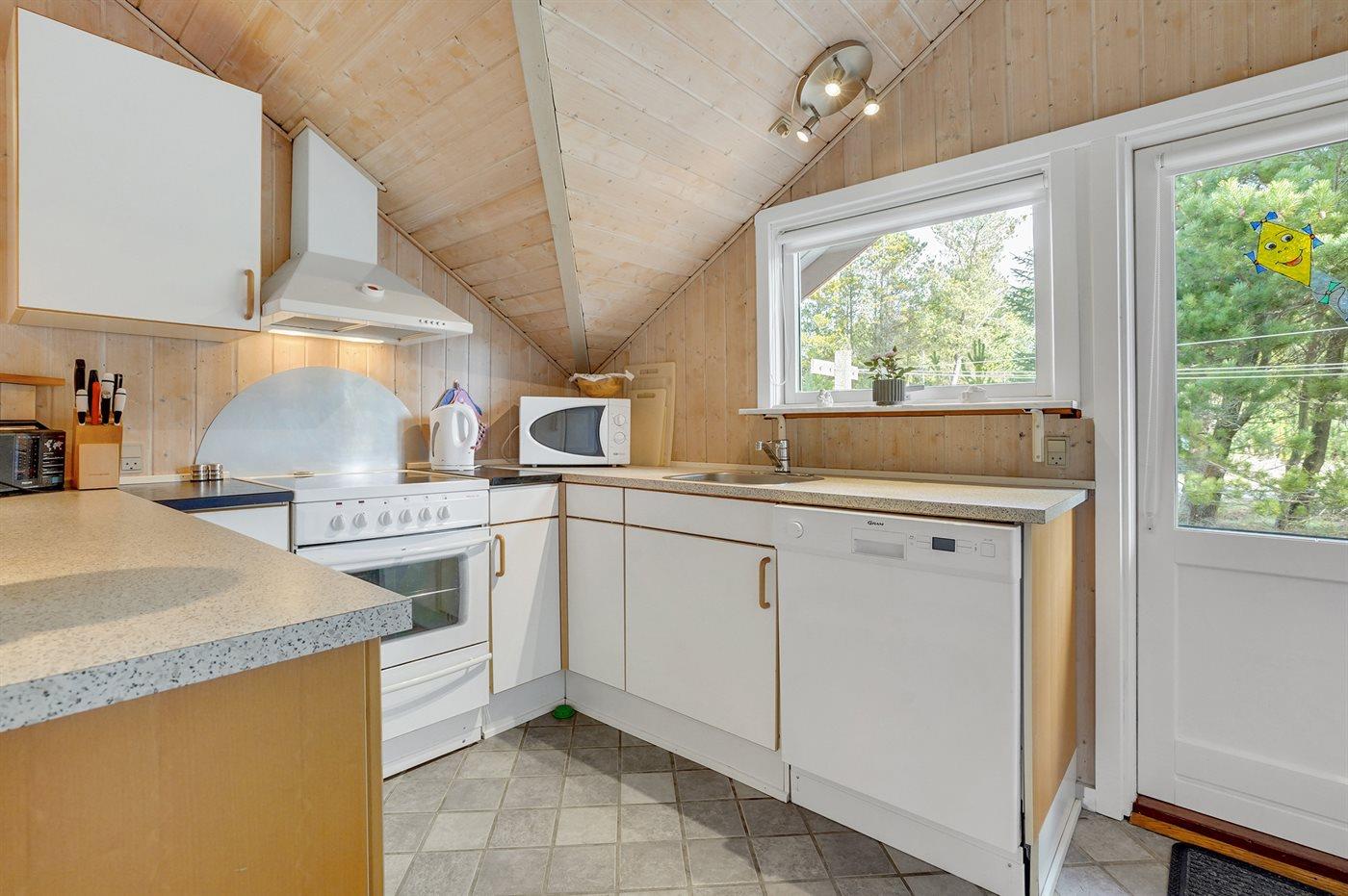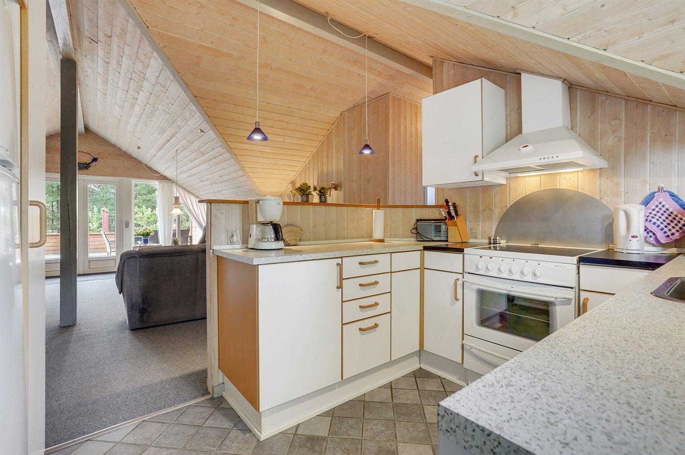 Køkkenet er udstyret med 1 køleskab. Der er 4 elkogeplader, bageovn, mikrobølgeovn samt opvaskemaskine.