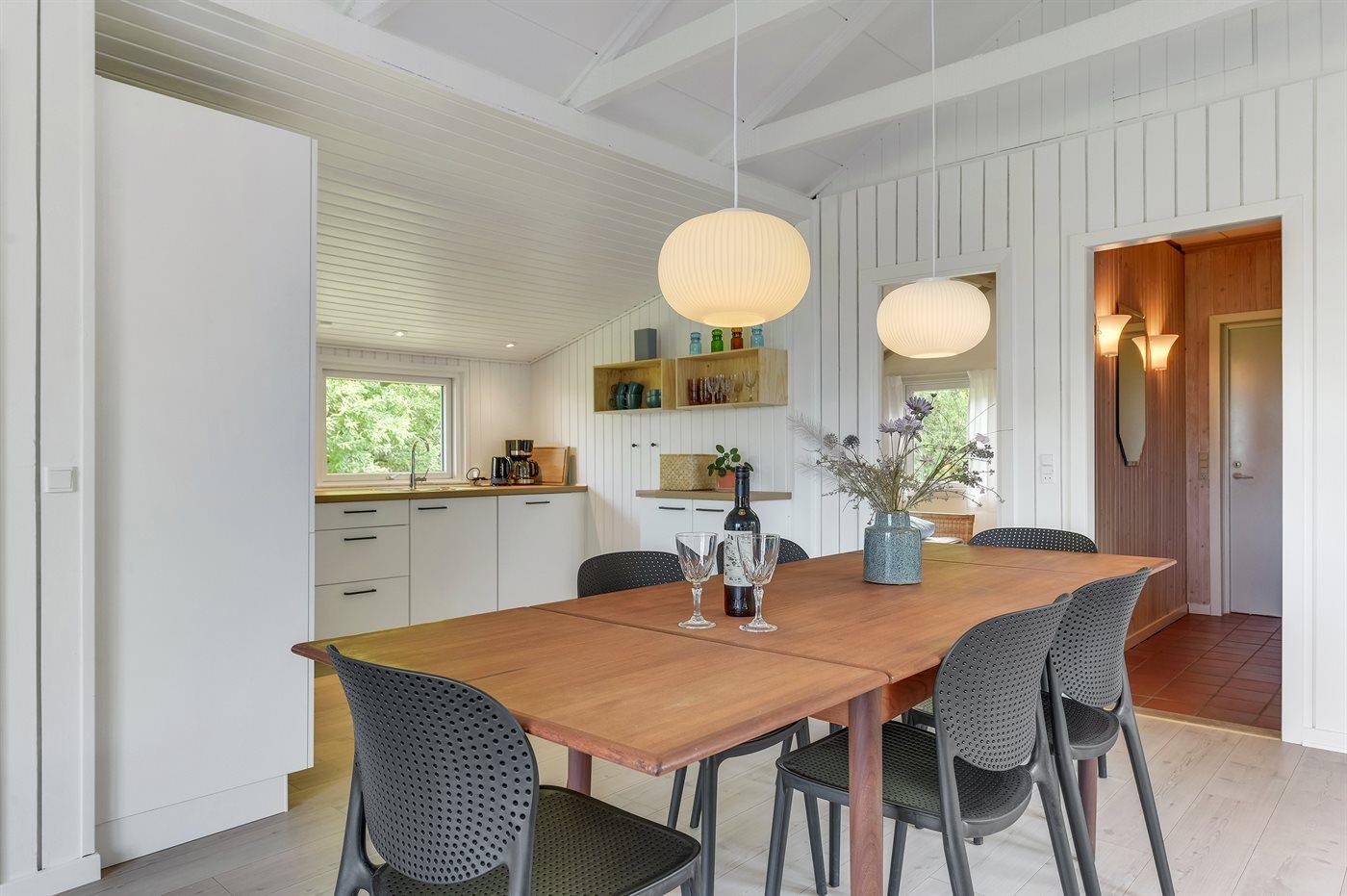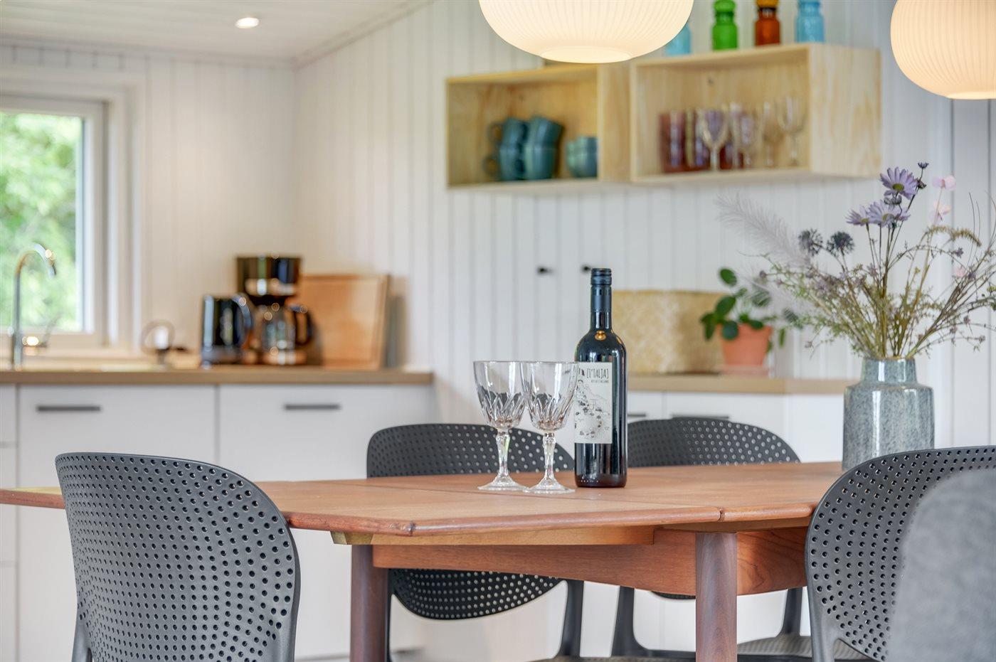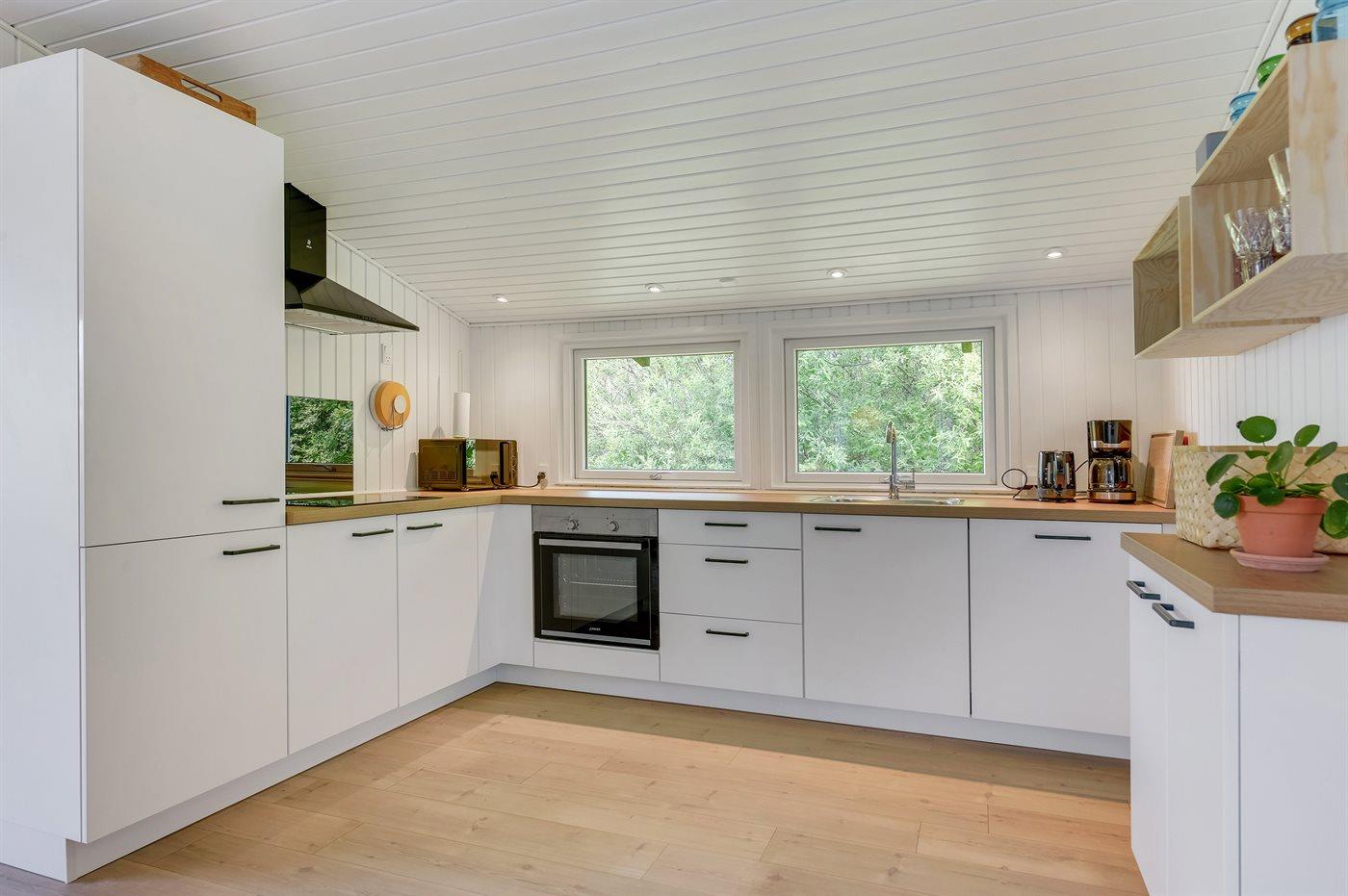 Køkkenet er udstyret med 1 køleskab. Der er 4 keramiske kogeplader, varmluftovn, mikrobølgeovn samt opvaskemaskine.