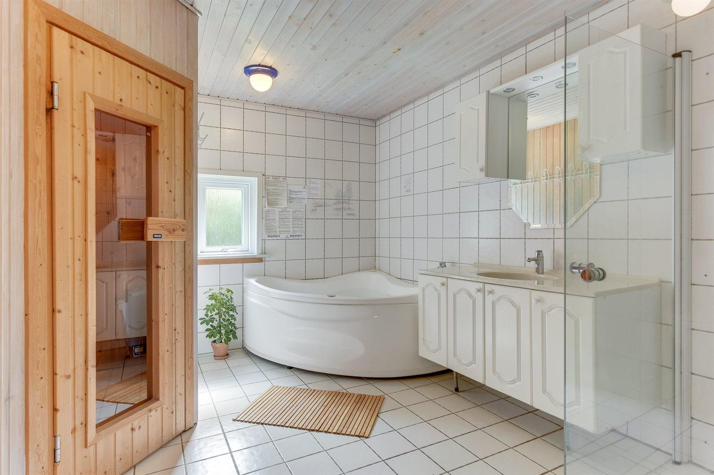 Der er 1 badeværelse, moderniseret i 2021, med bruseniche og 1 toilet. Der er gulvvarme på 1 badeværelse. I saunaen er der mulighed for afslapning.