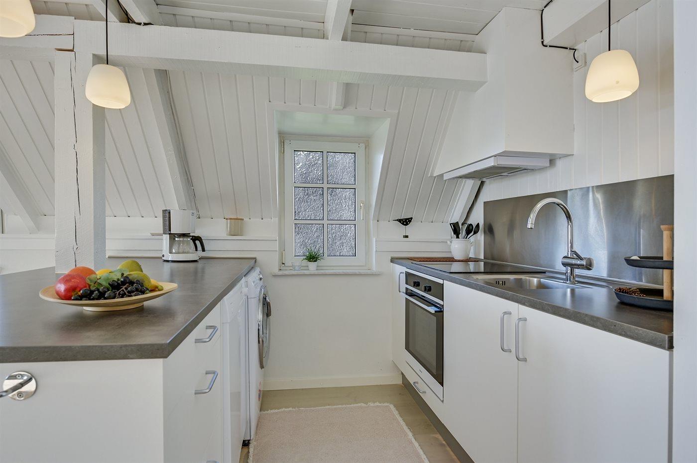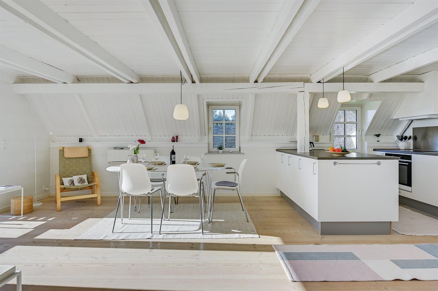 Køkkenet er udstyret med 1 køleskab. Der er 4 elkogeplader, varmluftovn samt opvaskemaskine.