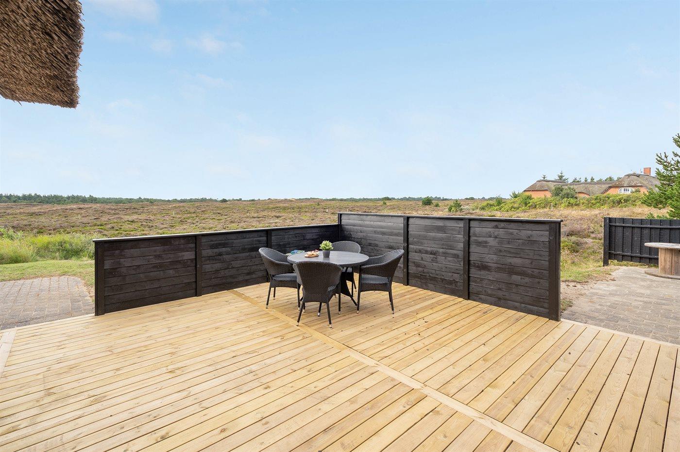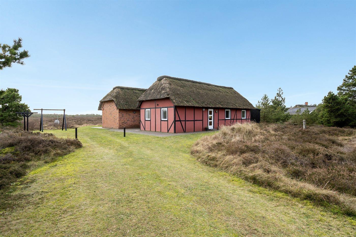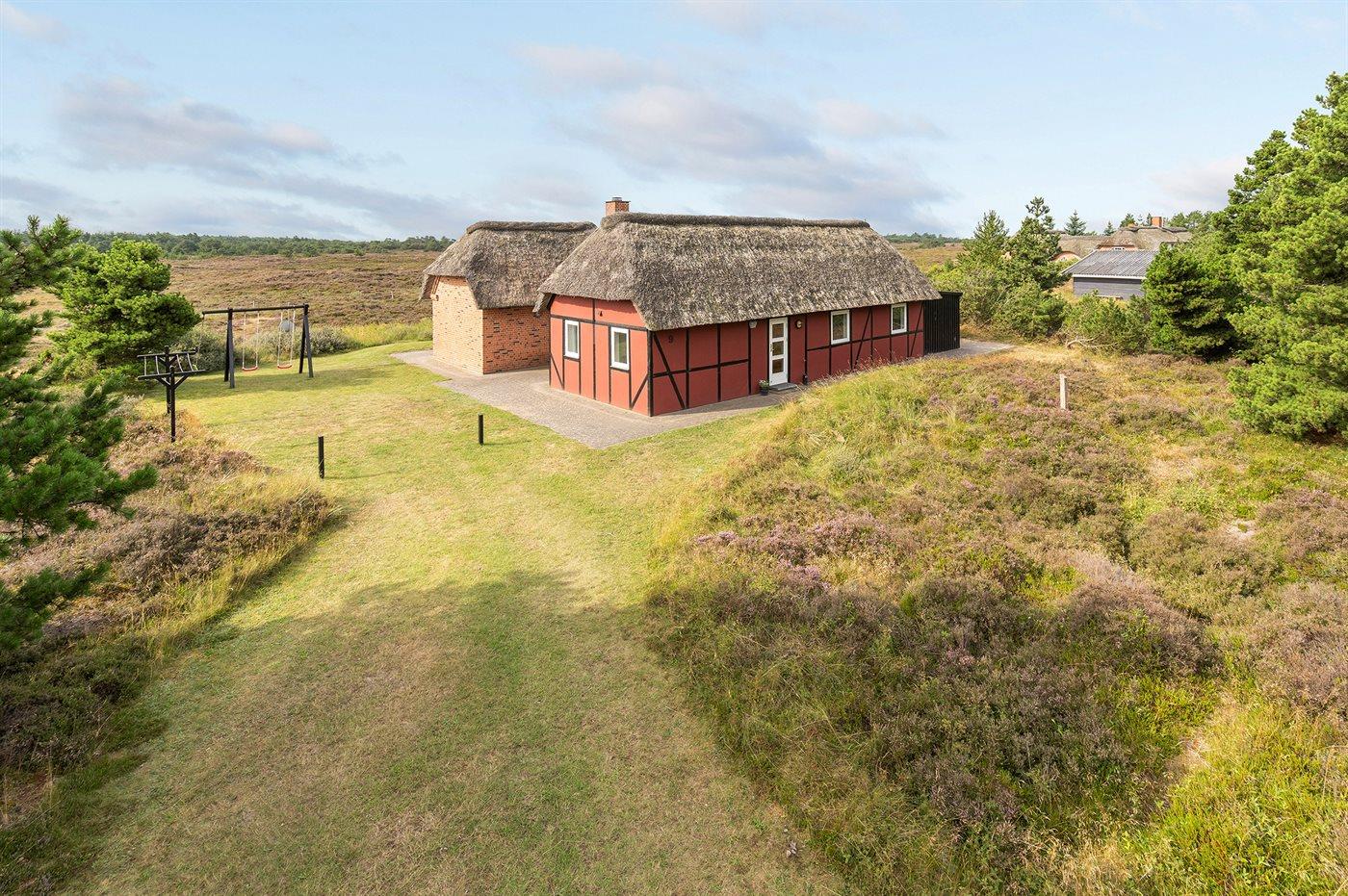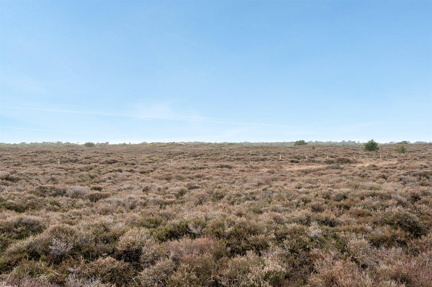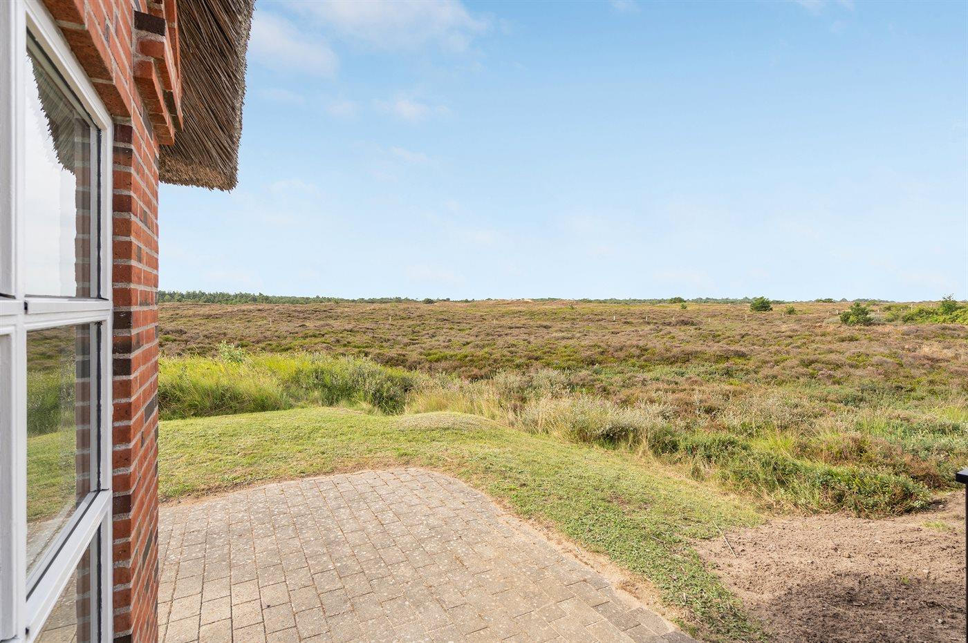 Hyggeligt sommerhus med udsigt over hedeområde og naturskøn grund nær Rømøs strand og faciliteter.